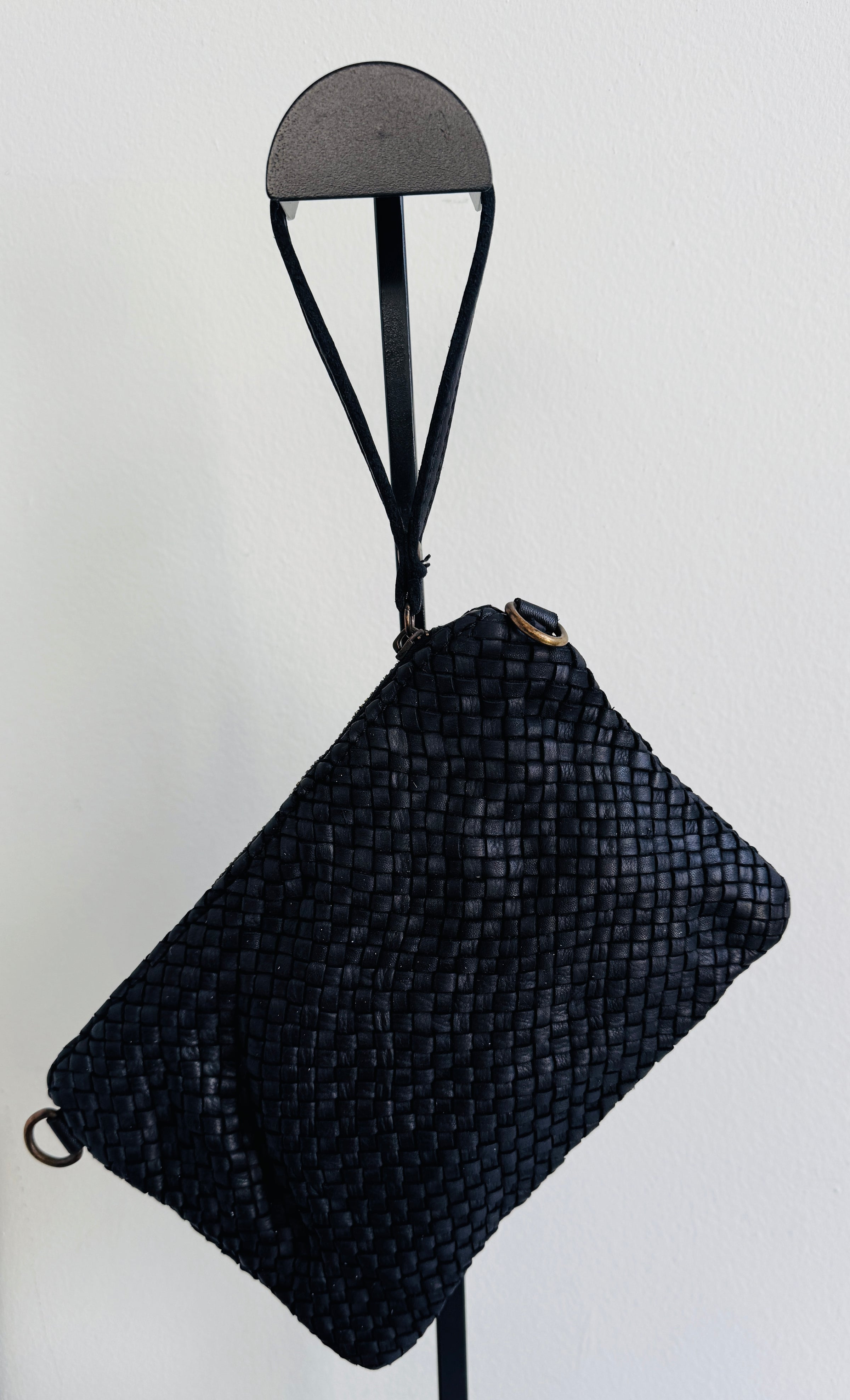 Borsa in pelle intrecciata nera. Tracolla regolabile e removibile.