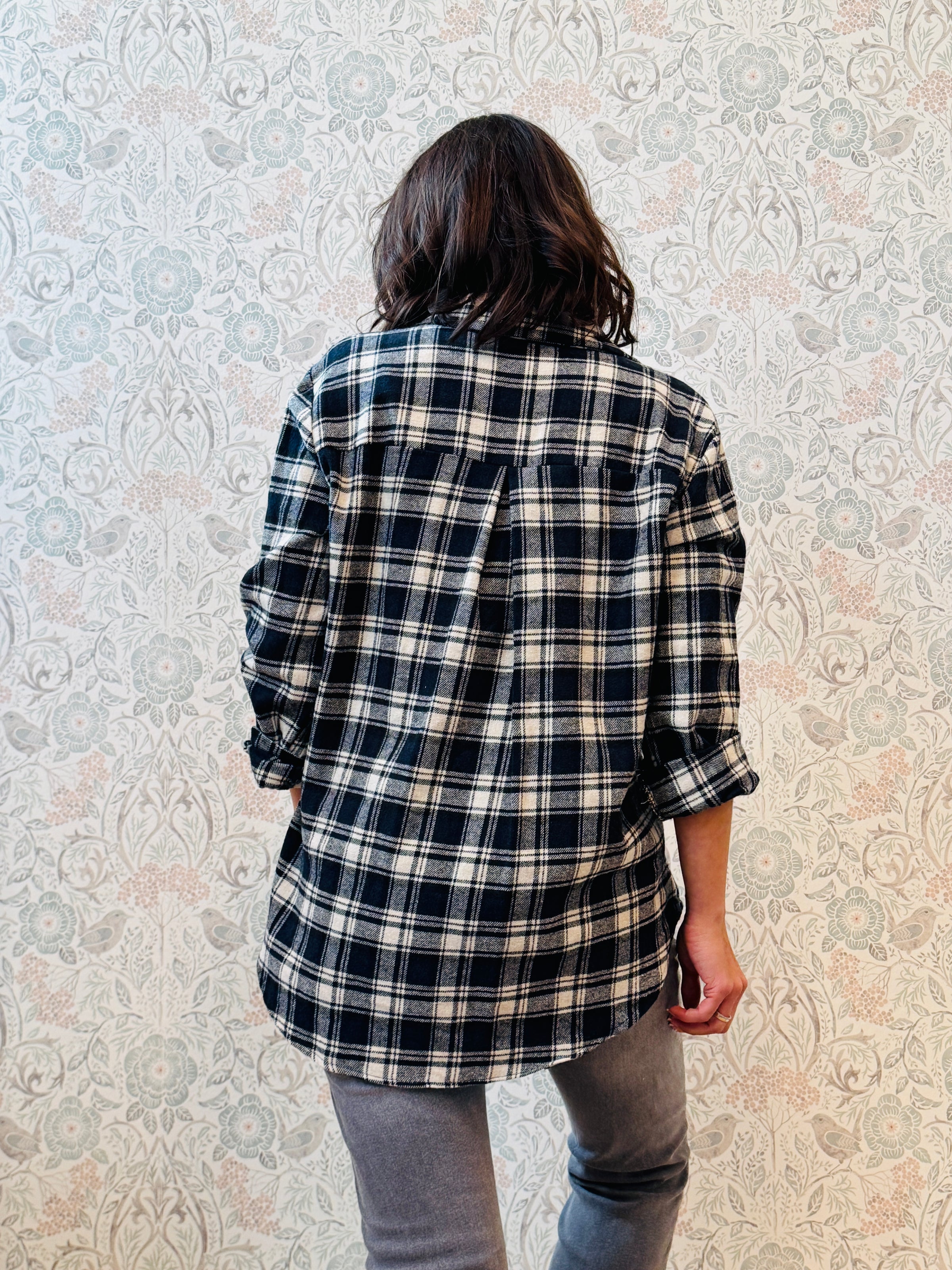 Camicia in flanella dal taglio classico a quadretti bianchi su base blu notte. Vestibilita' ampia e morbida.