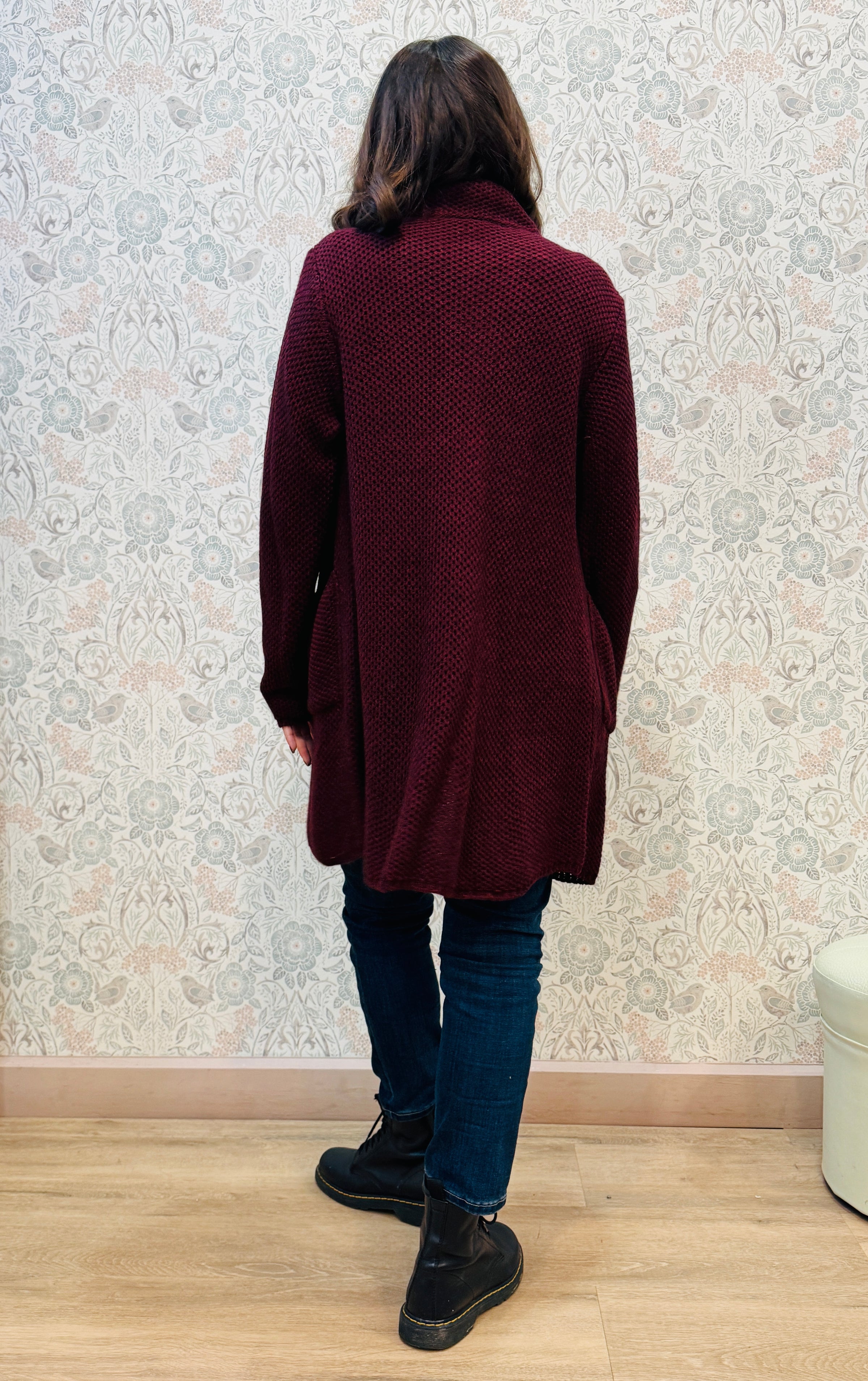 Il nostro intramontabile cardigan lungo aperto con tasche a vista laterali. Vestibilità morbida e ampia perfetto anche come cappottino autunnale.