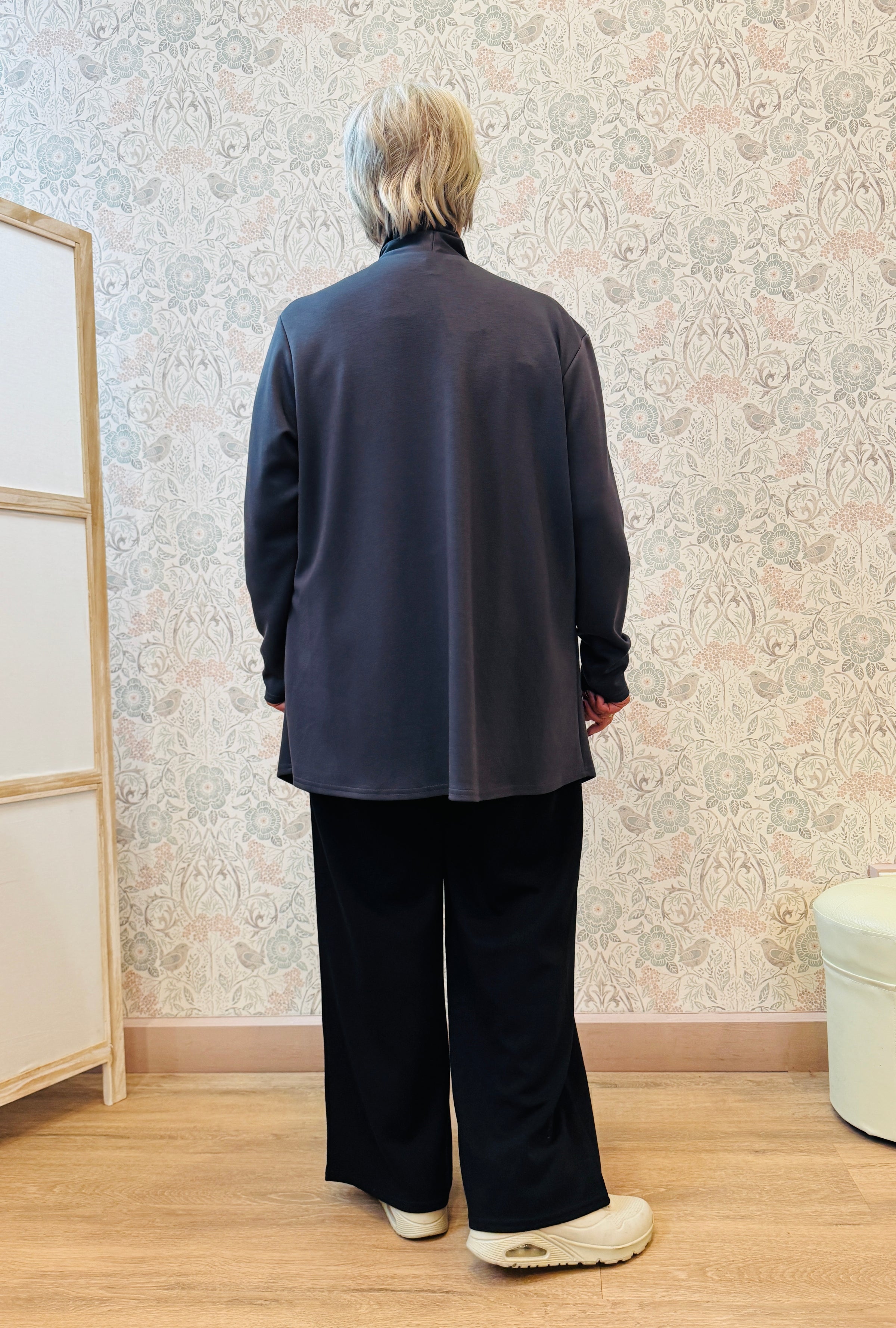 Cardigan aperto color grigio antracite con taglio ampio e svasato. Vestibiltà morbida e ampia.