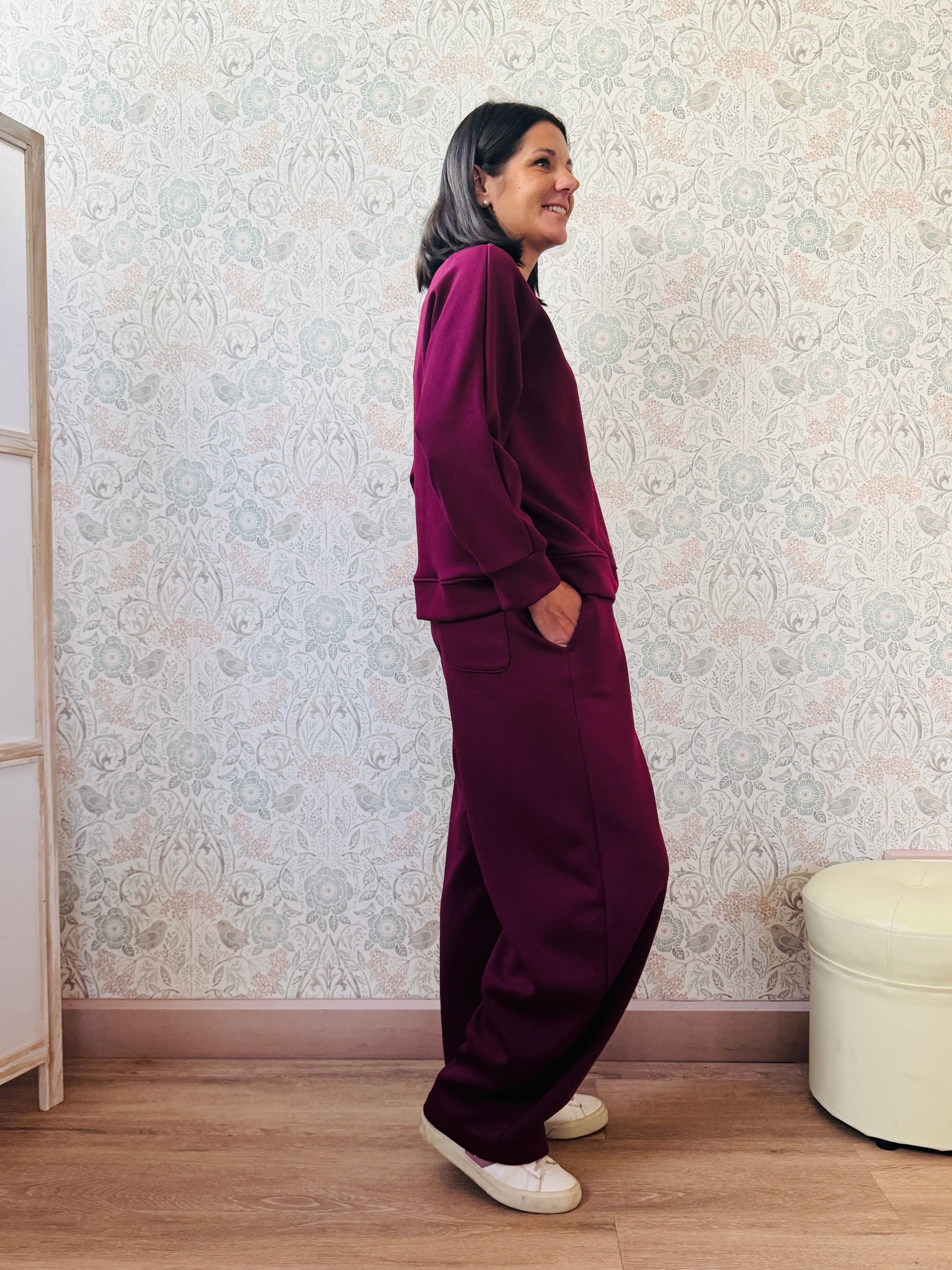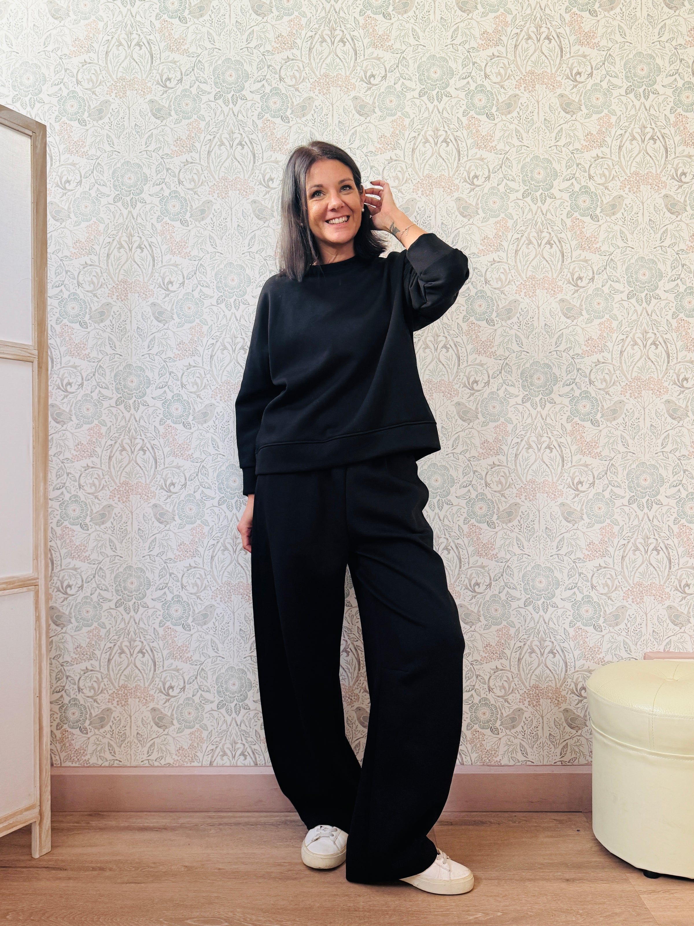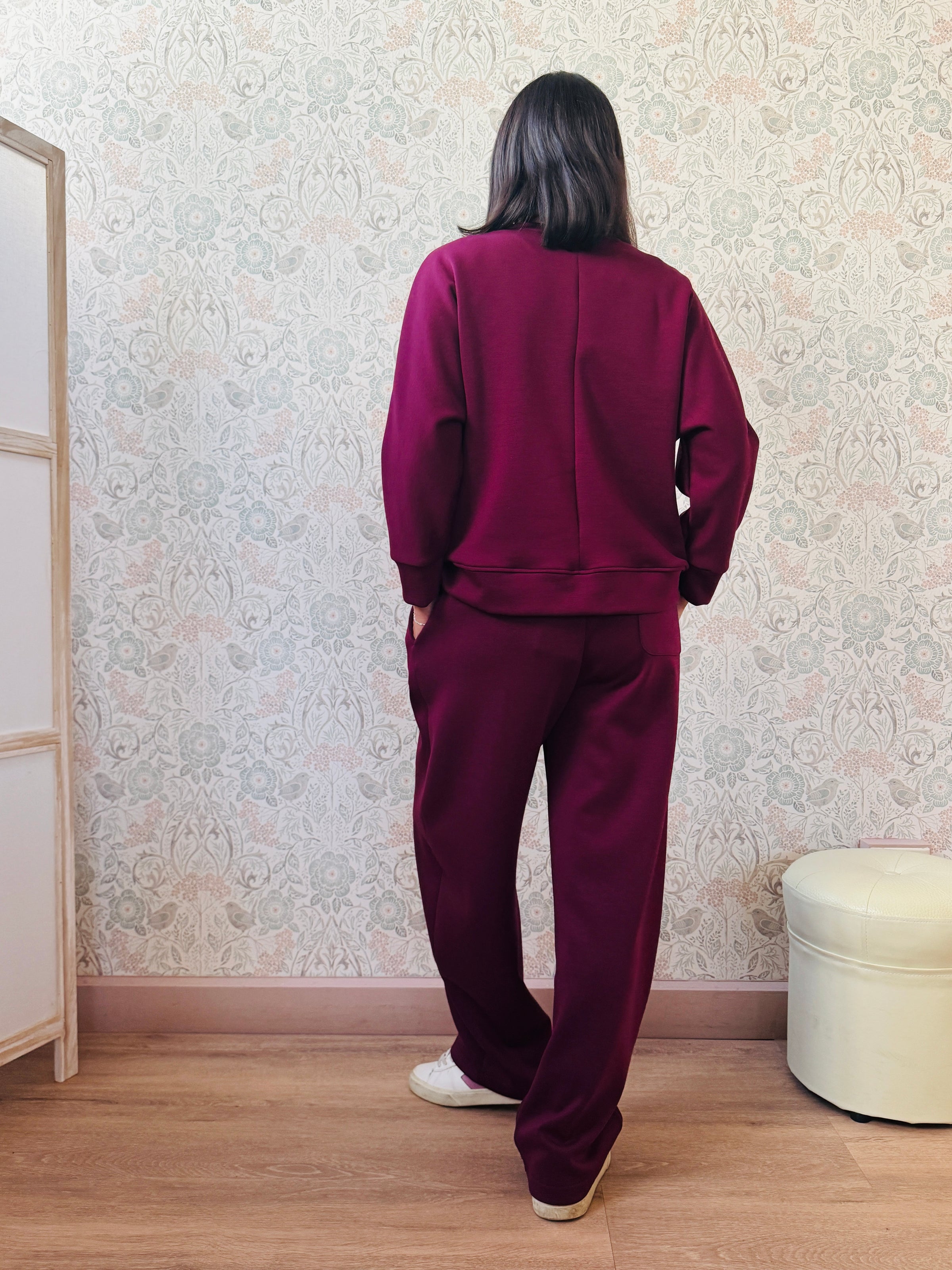 Completo felpato composto da felpa con scollo tondo dal taglio svasato e pantalone con elastico in vita dal taglio dritto con tasche laterali e tasca visibile sul retro.