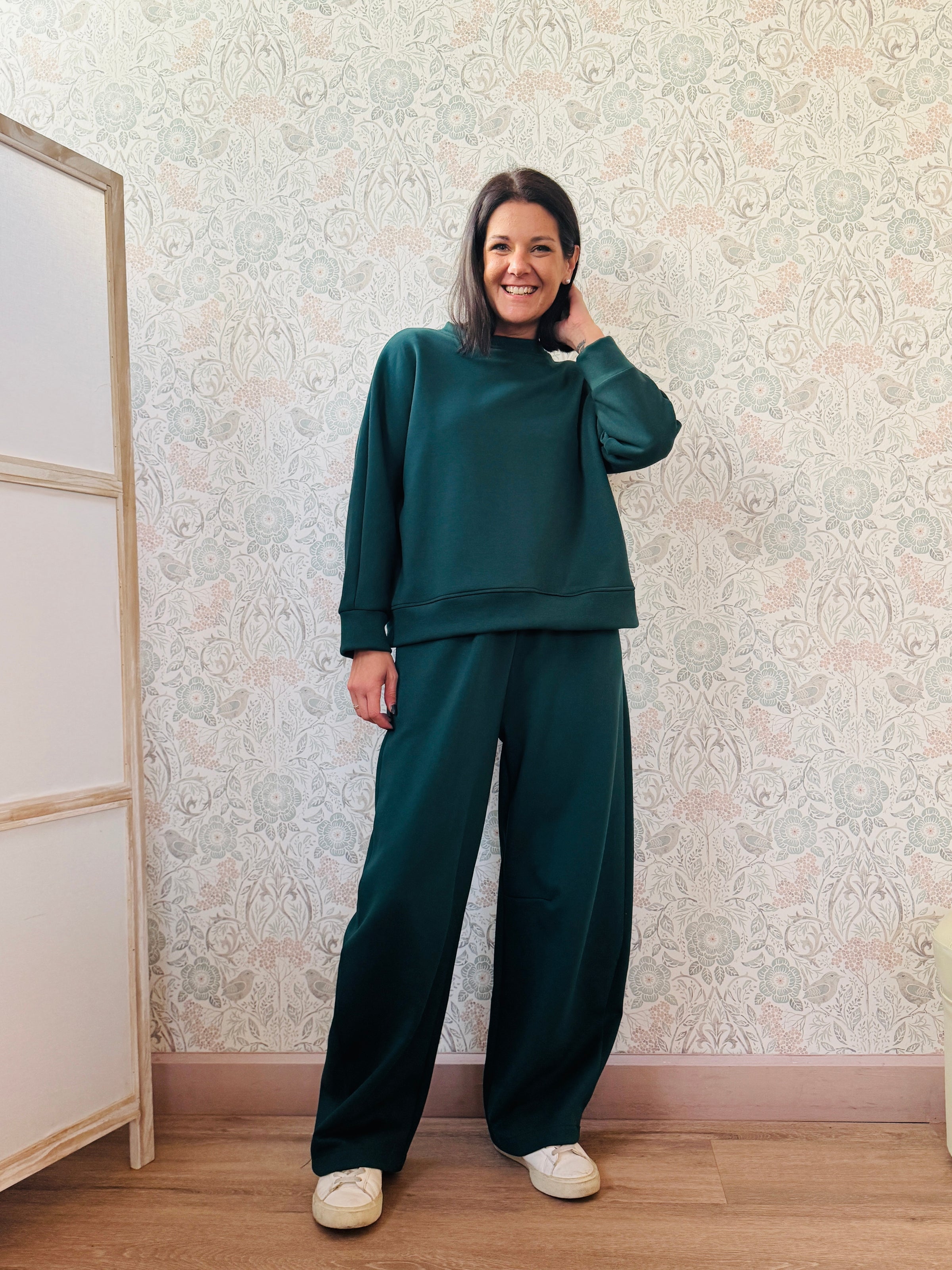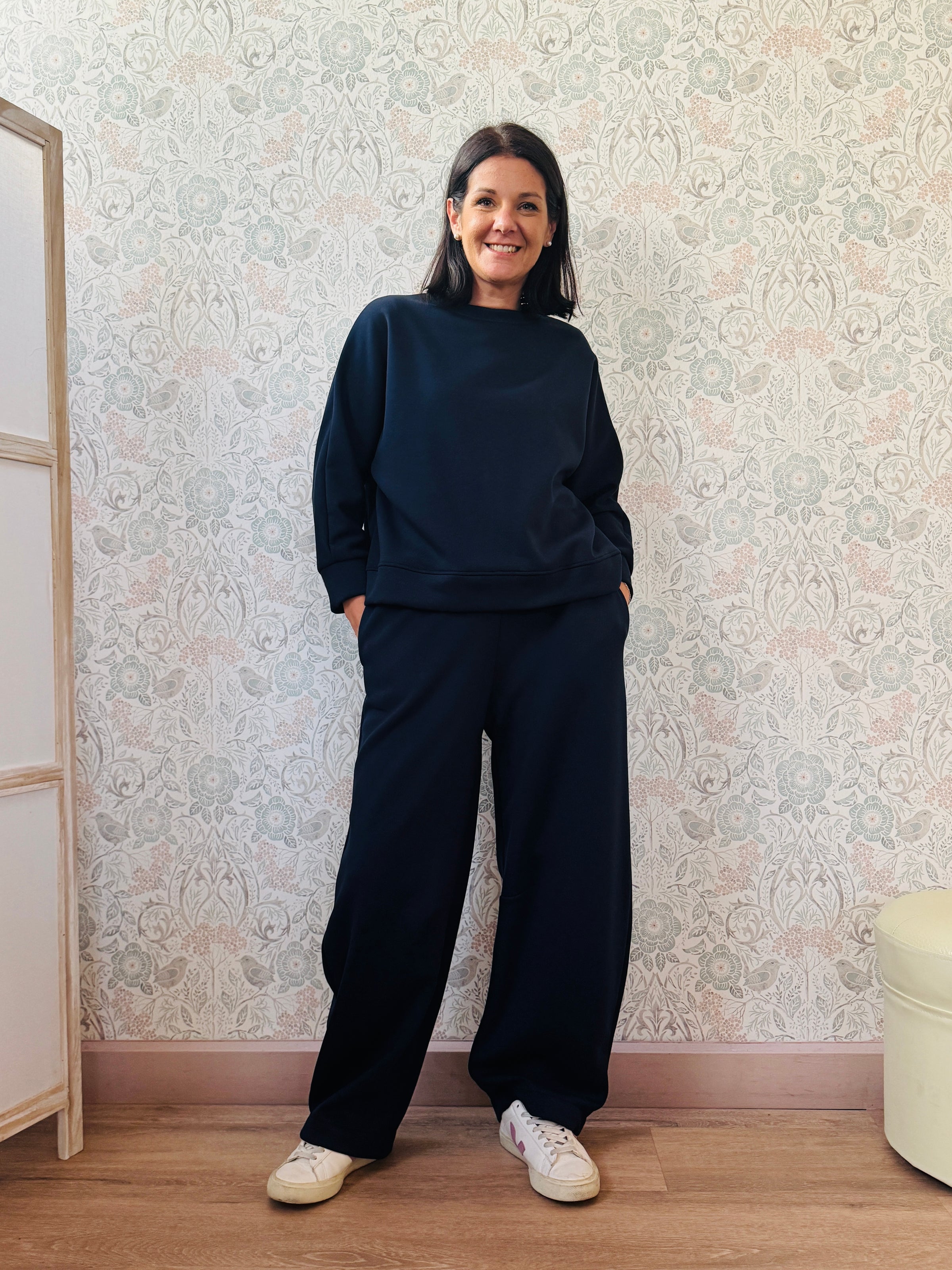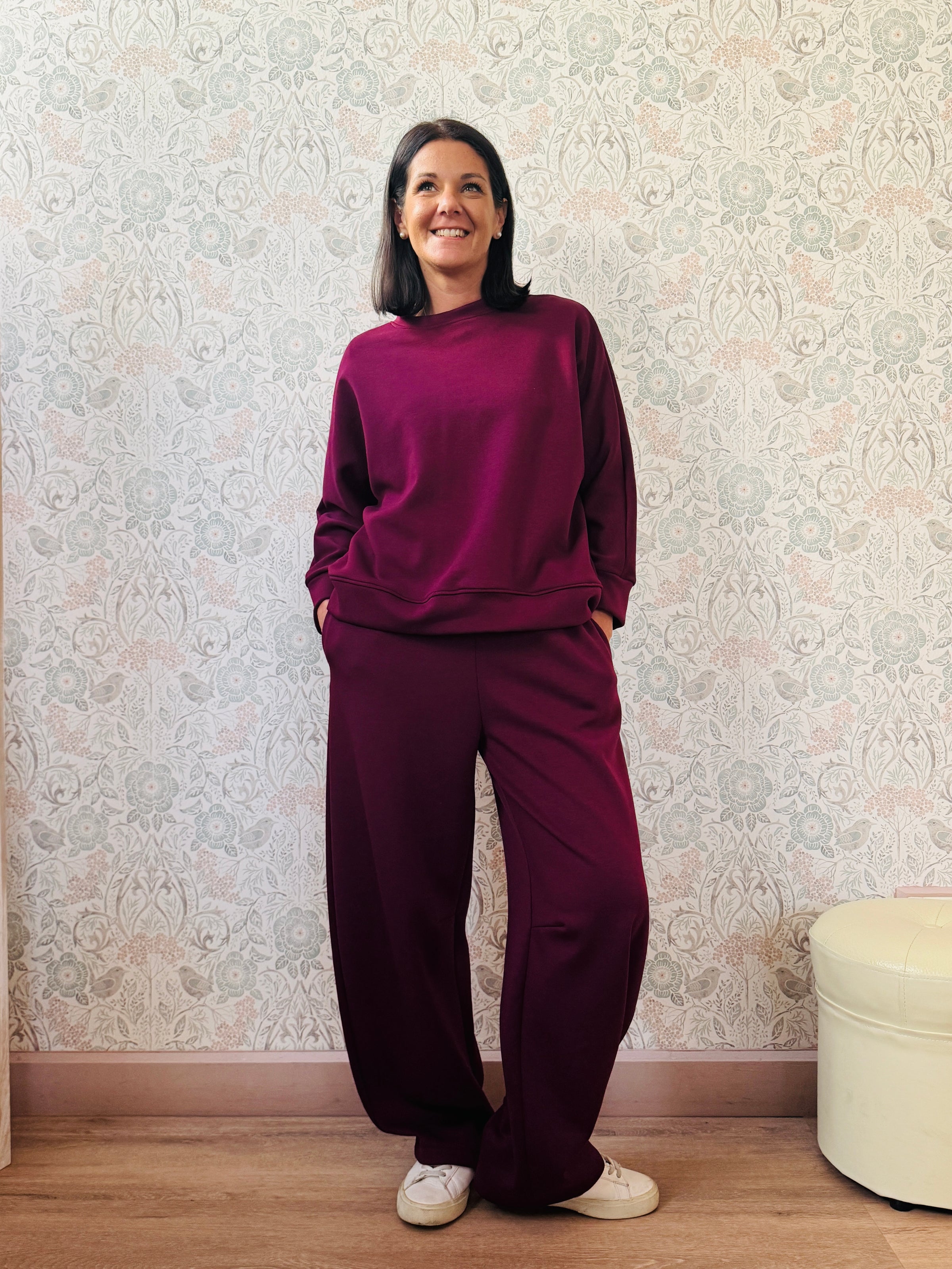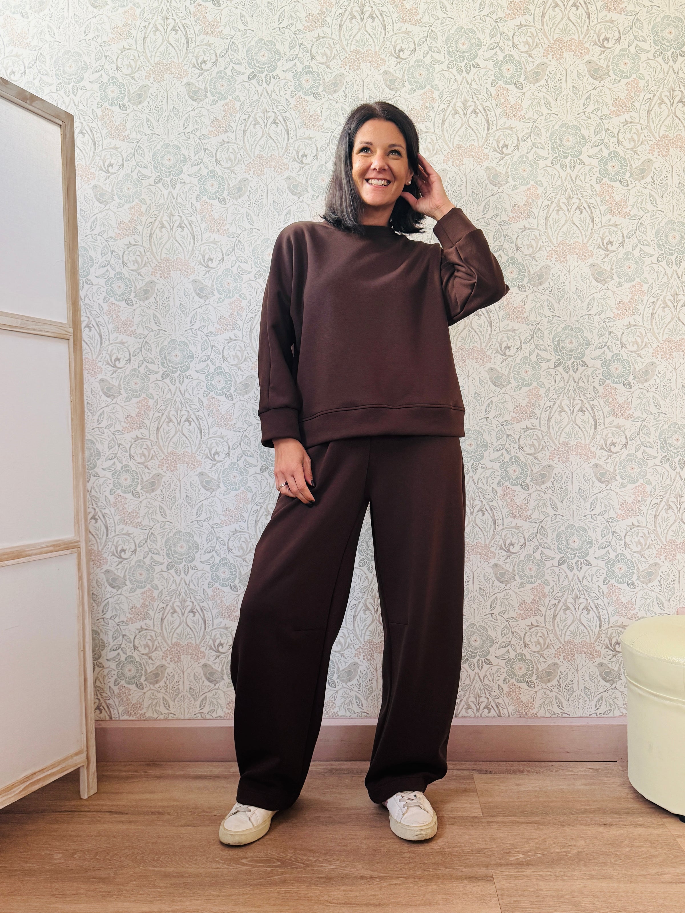 Completo felpato composto da felpa con scollo tondo dal taglio svasato e pantalone con elastico in vita dal taglio dritto con tasche laterali e tasca visibile sul retro.