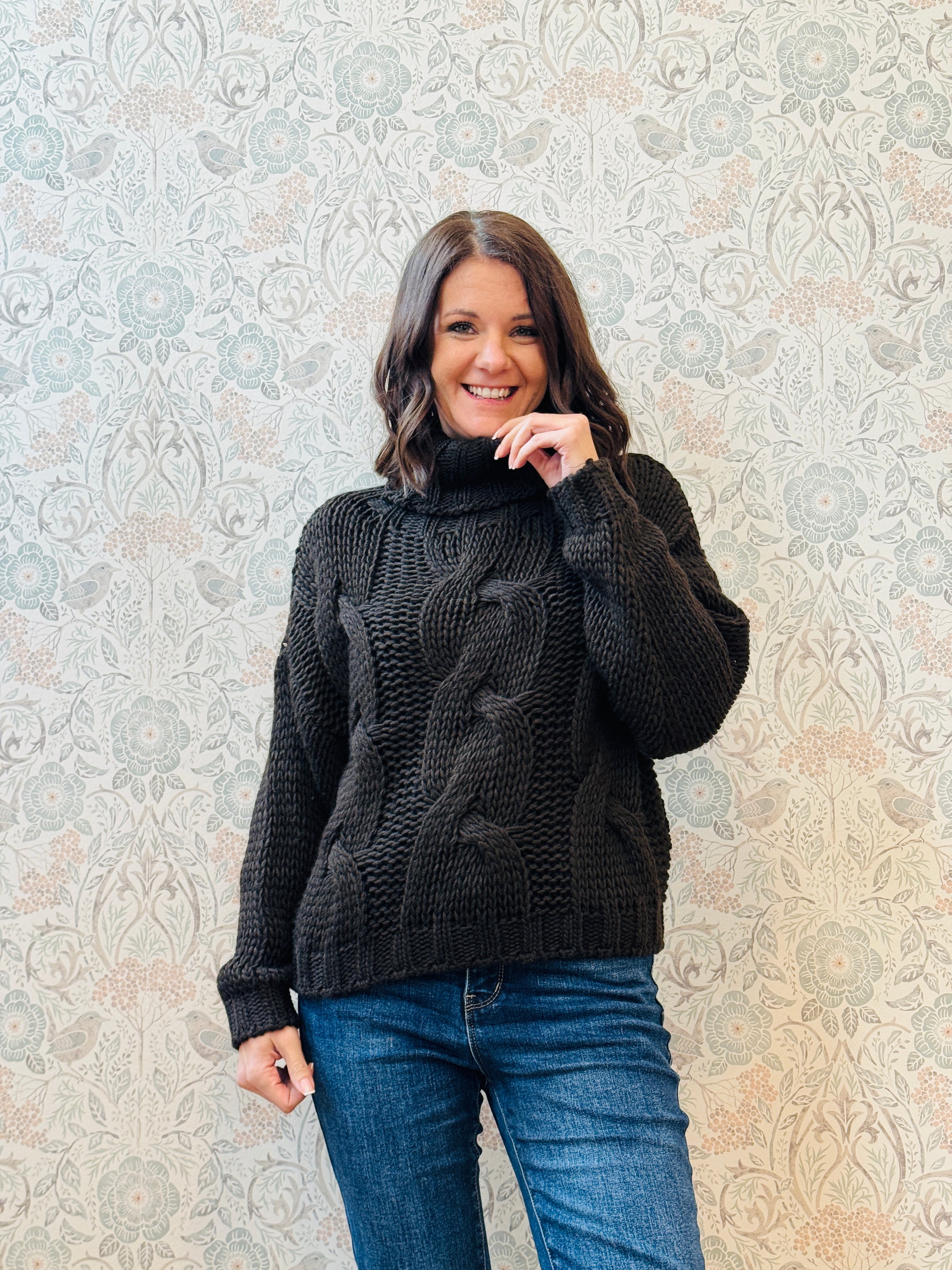 Maglione dolcevita in trama grossa con decorazione a treccia sul davanti. Vestibilta' ampia e morbida.