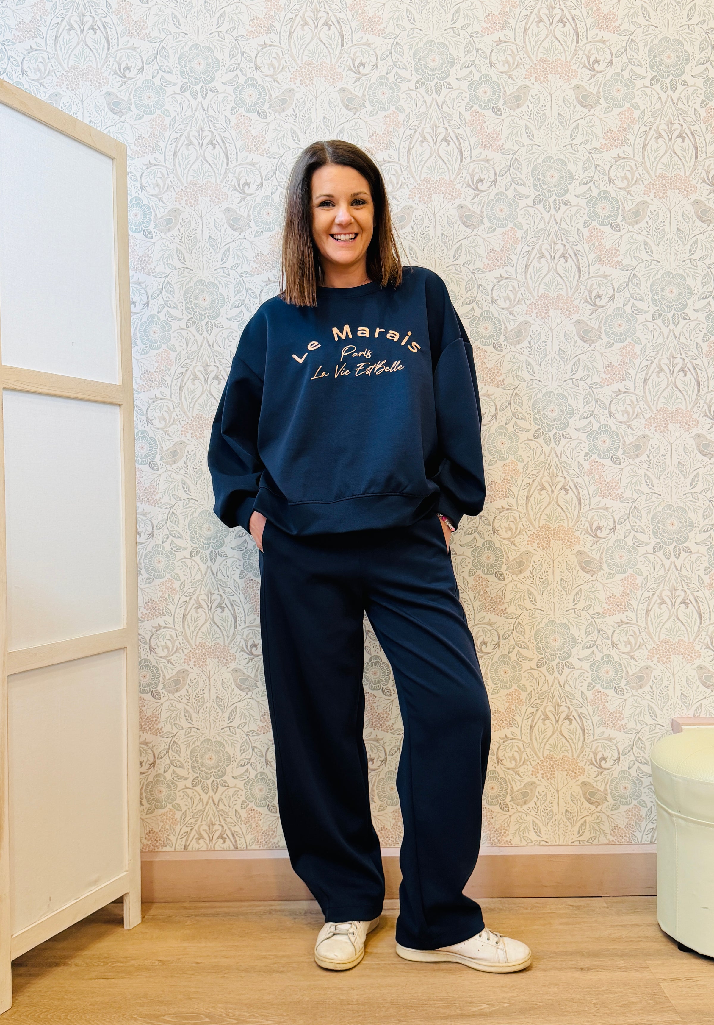 Completo tuta color blu notte composto da felpa con scollo tondo con scritta ricamata e pantalone a palazzo con elastico in vita, tasche laterali e taglio palazzo. Vestibilita' ampia e morbida.