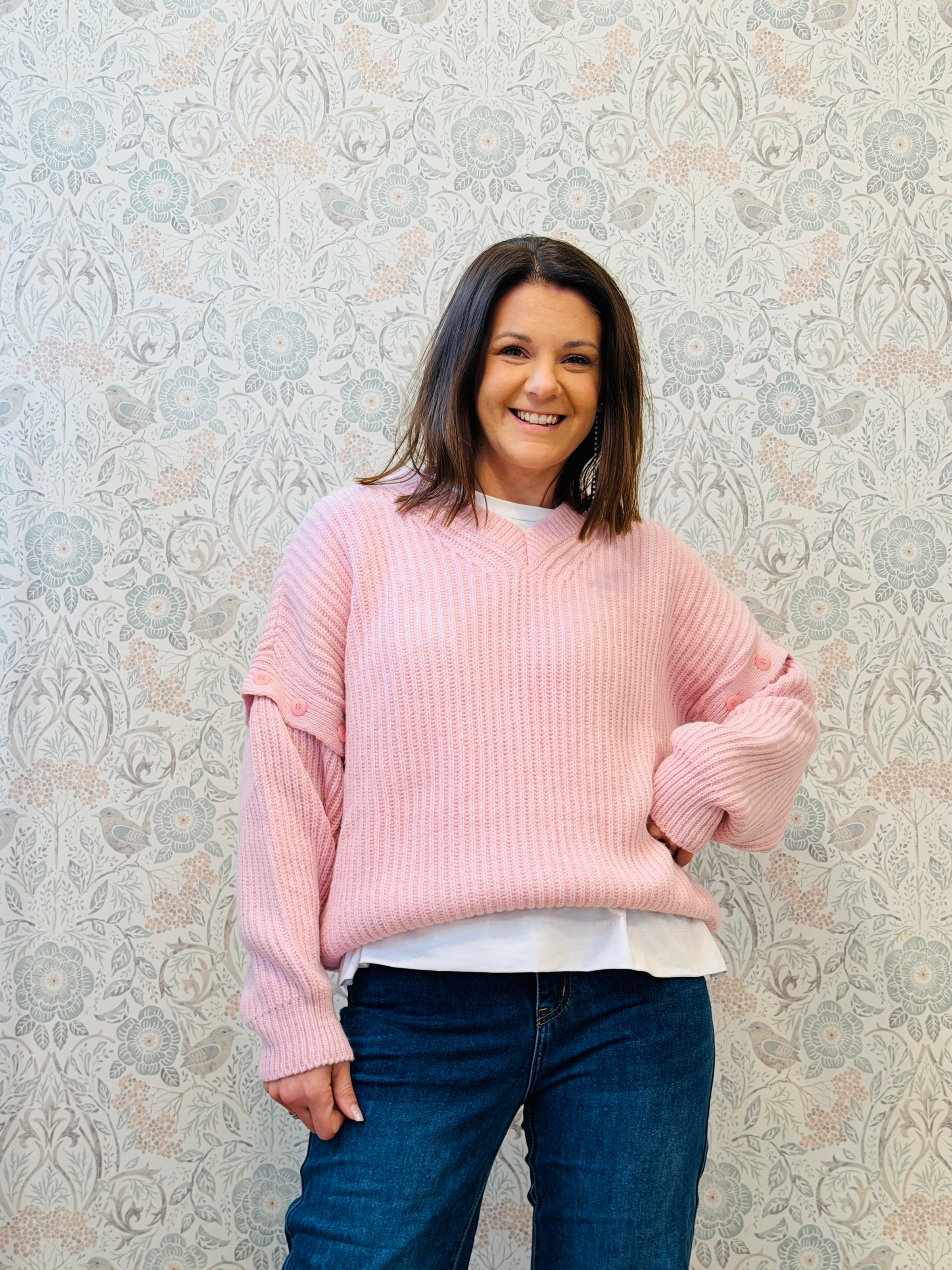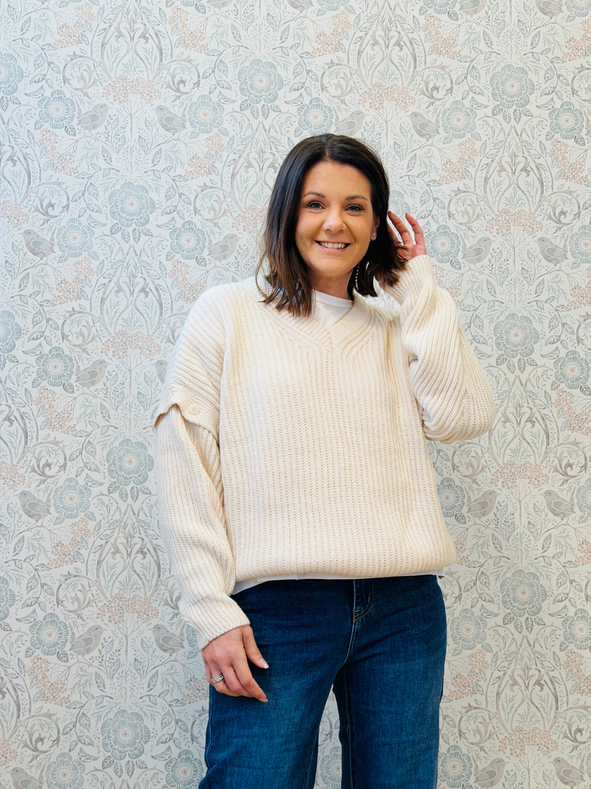 Maglione in trama grossa con scollo a V e vestibilita' morbida e ampia. Maniche con bottoni ad asola aperti (possibilita' di staccare la manica).