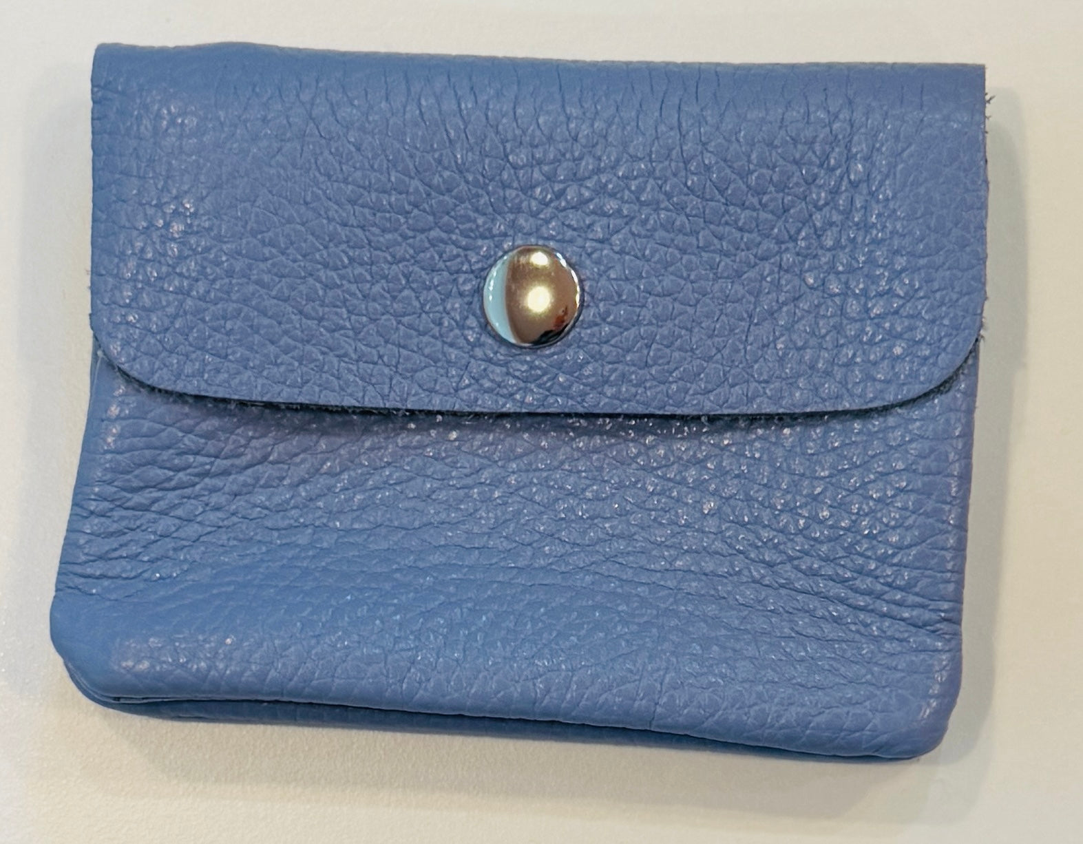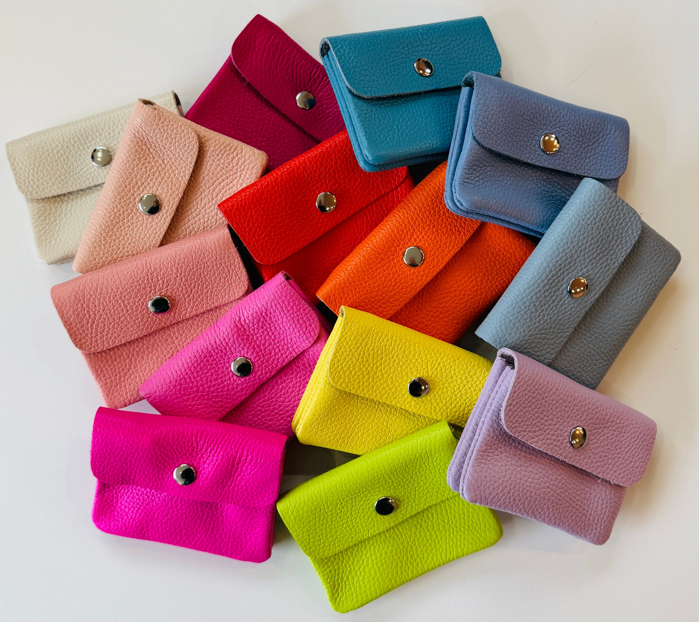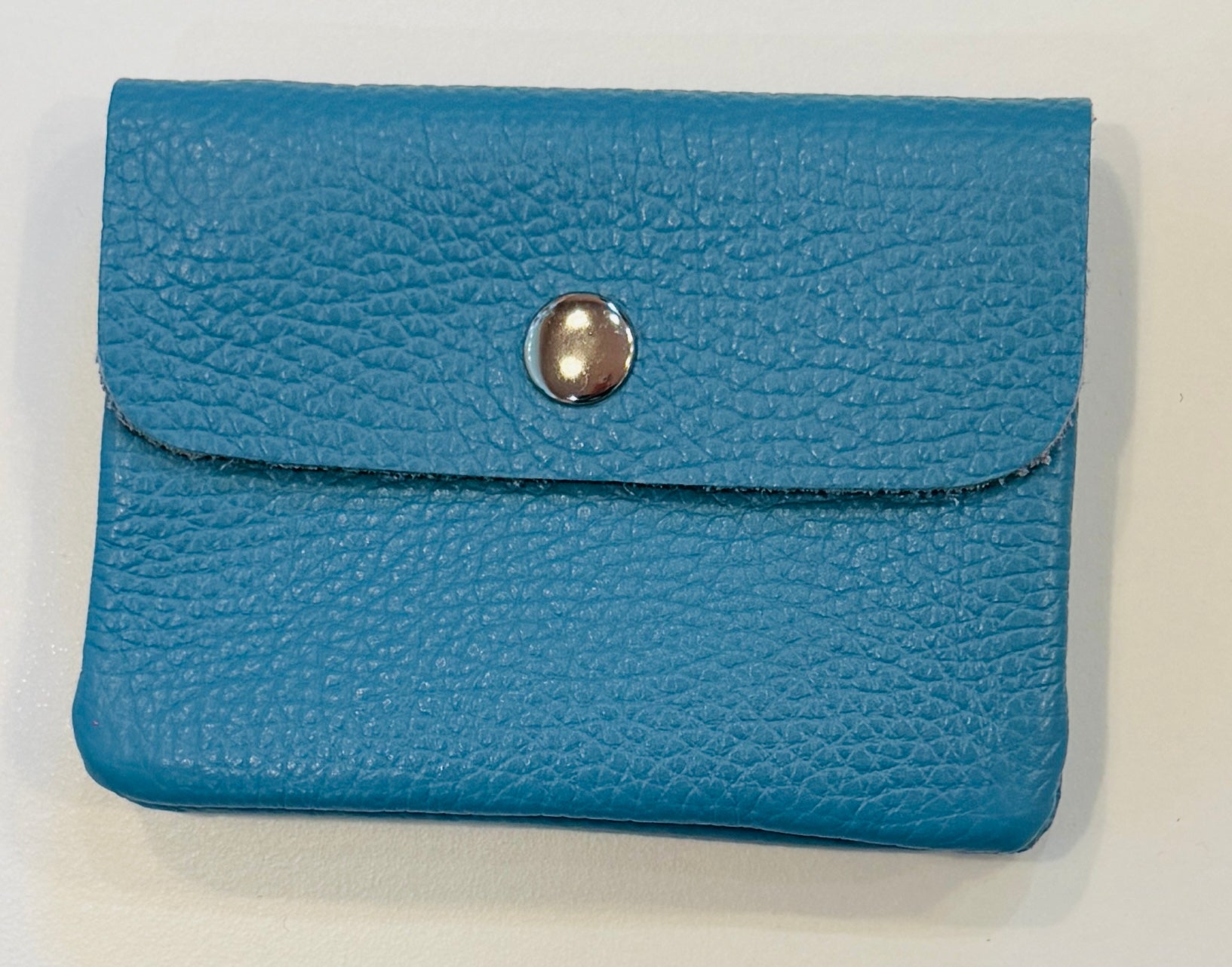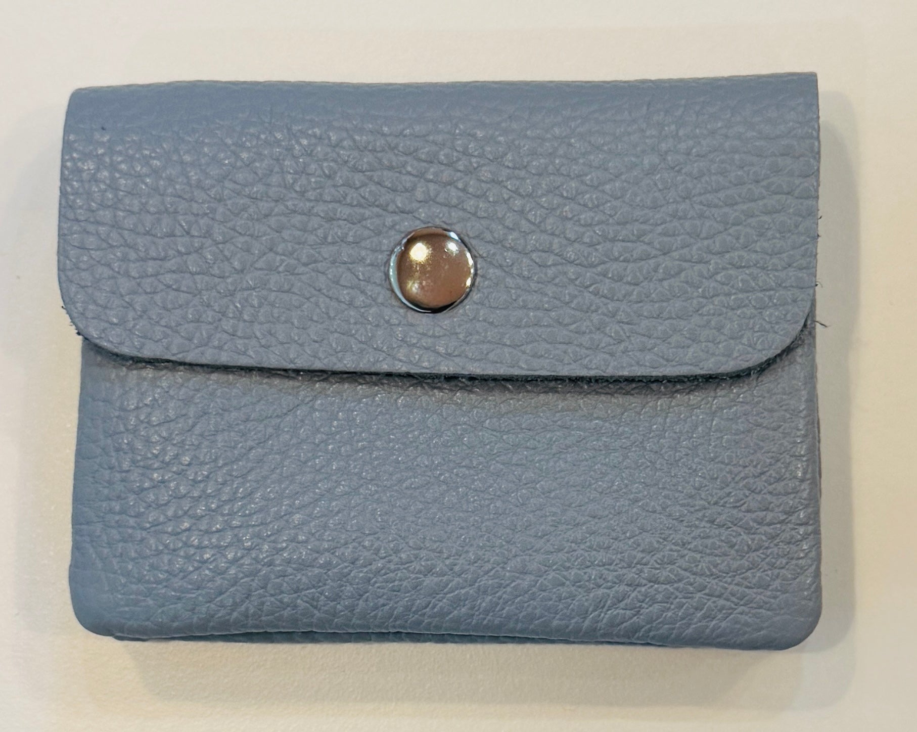 La versione mini del nostro iconico portafoglio busta. Chiusura con bottone a clip e tre tasche interne, due aperte e una con zip.
