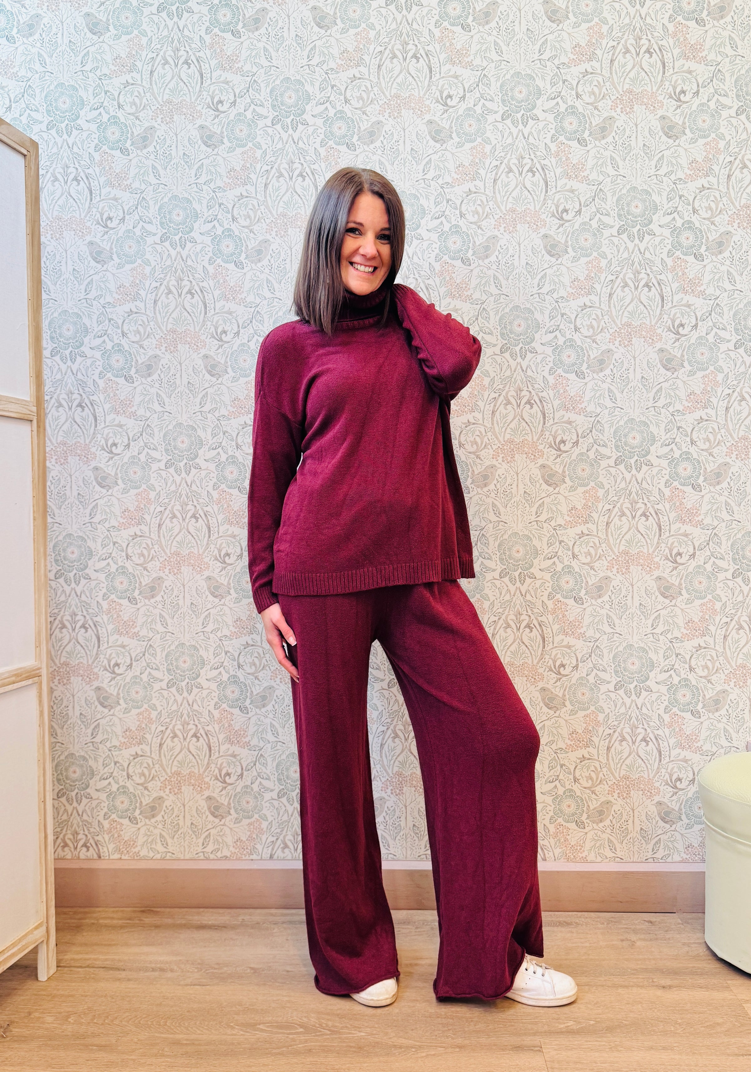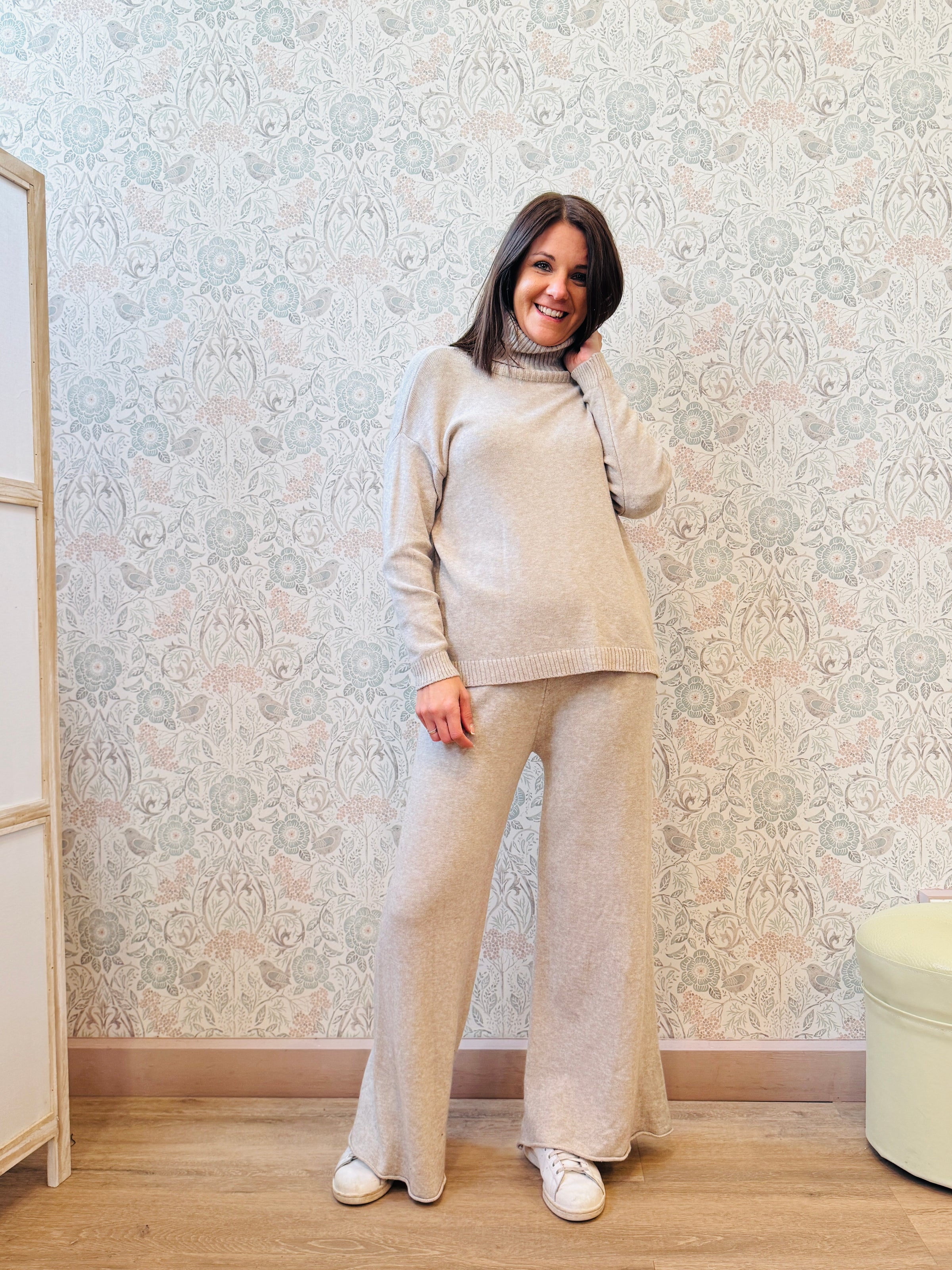 Completo in maglia con maglione dolcevita dal taglio leggermente svasato e ampio pantalone con elastico in vita dal taglio palazzo.