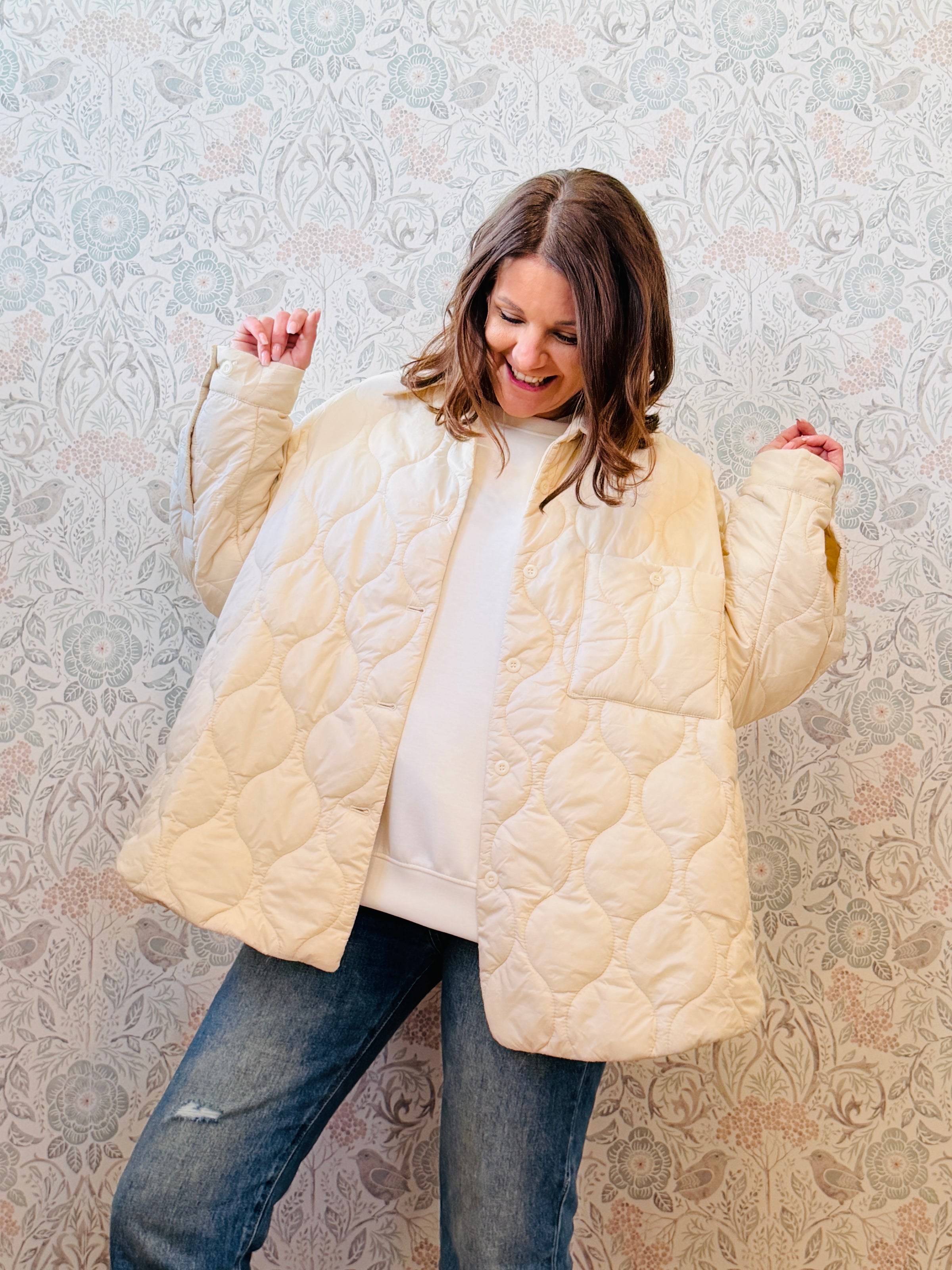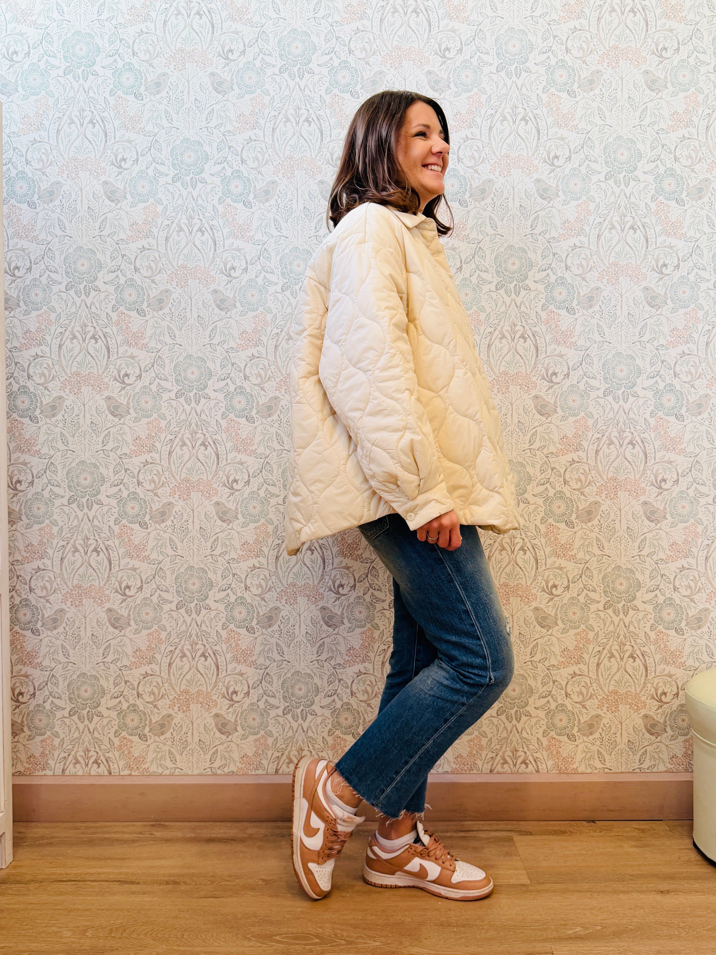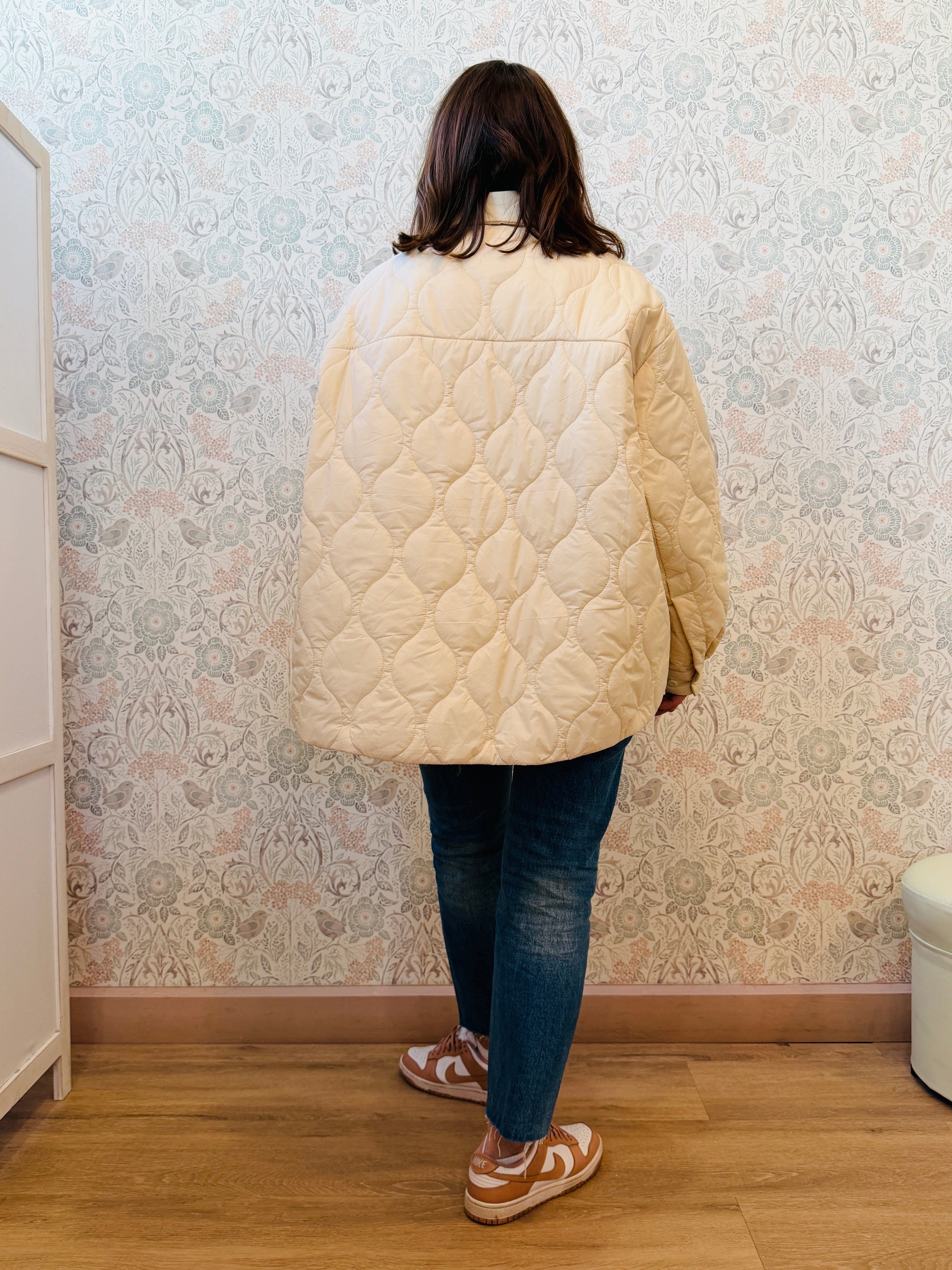 Giacca 100 grammi color panna, taglio camicia con bottoni ad asola tono su tono e taschino laterale. Dettaglio a onde per l'imbottitura e fit over.