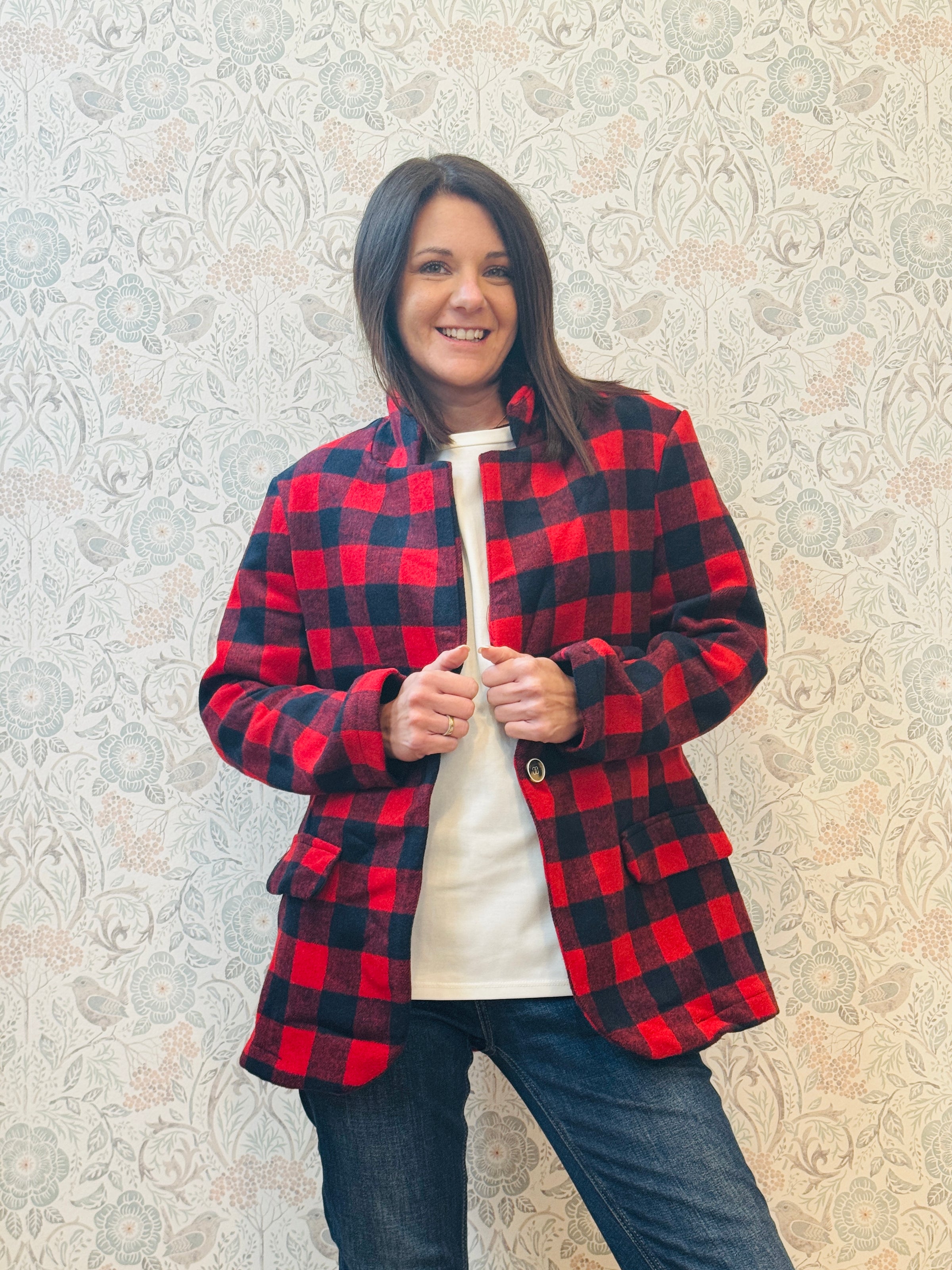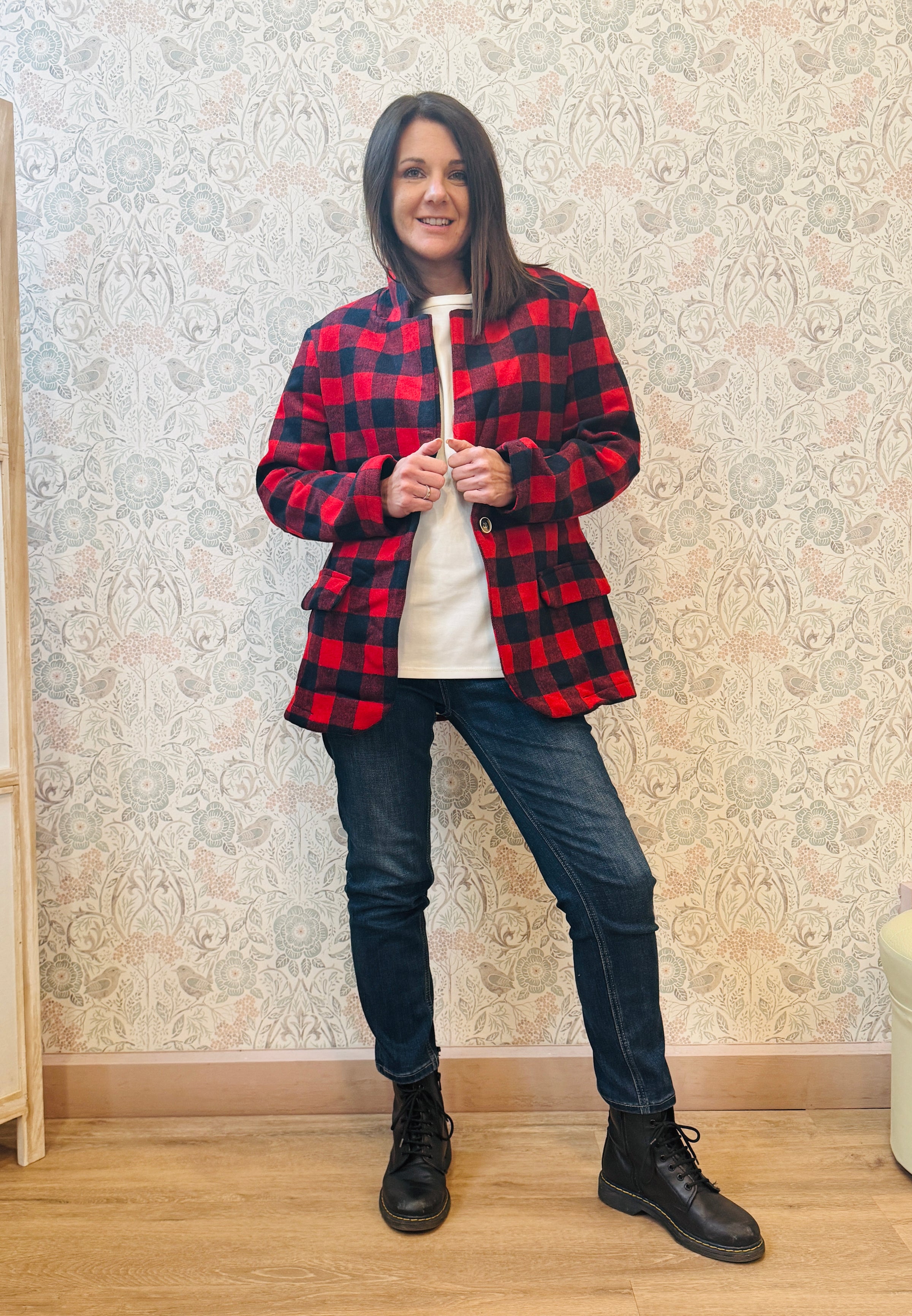 Blazer dal taglio classico a quadretti grossi blu e rossi. Vestibilita' over.