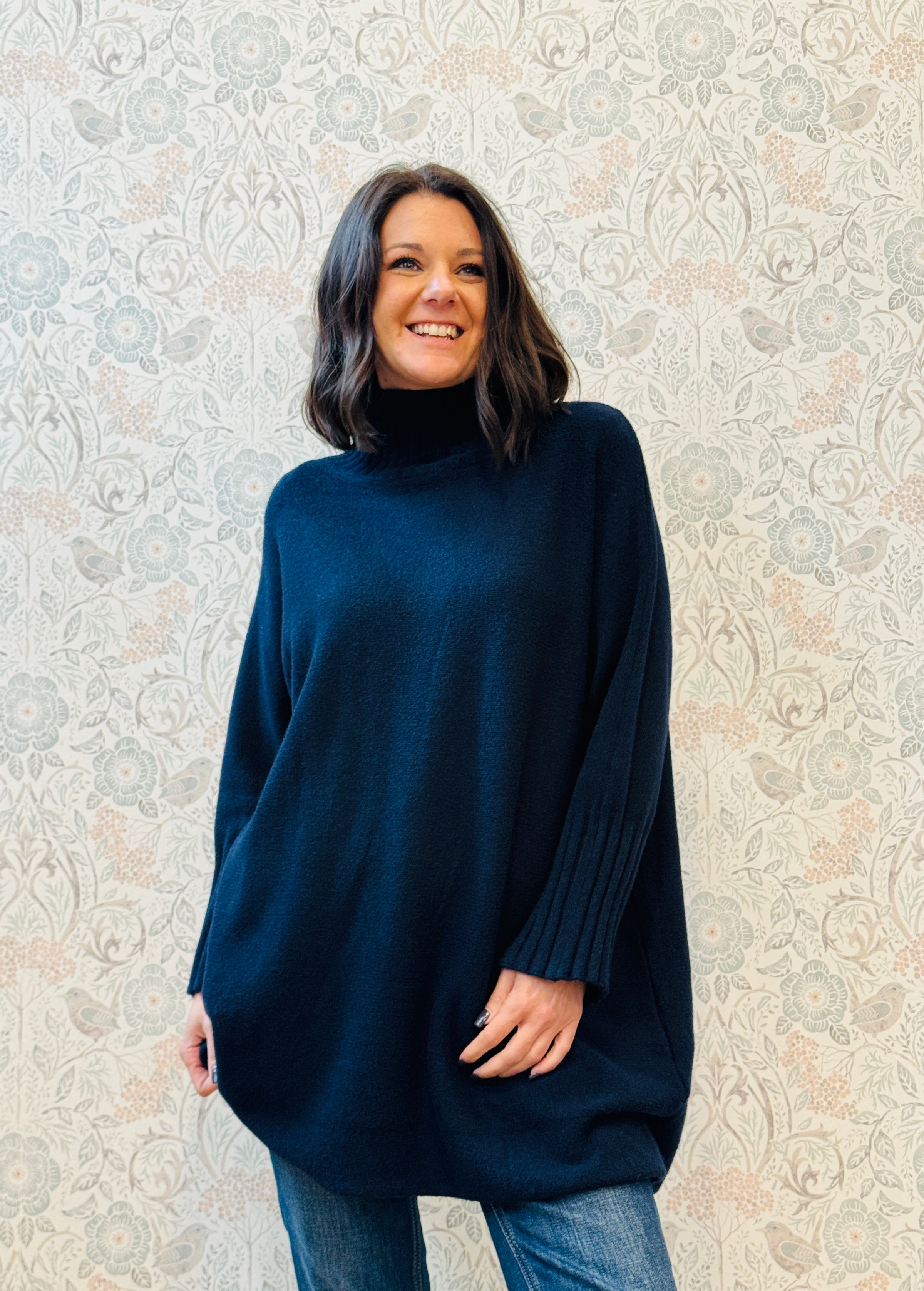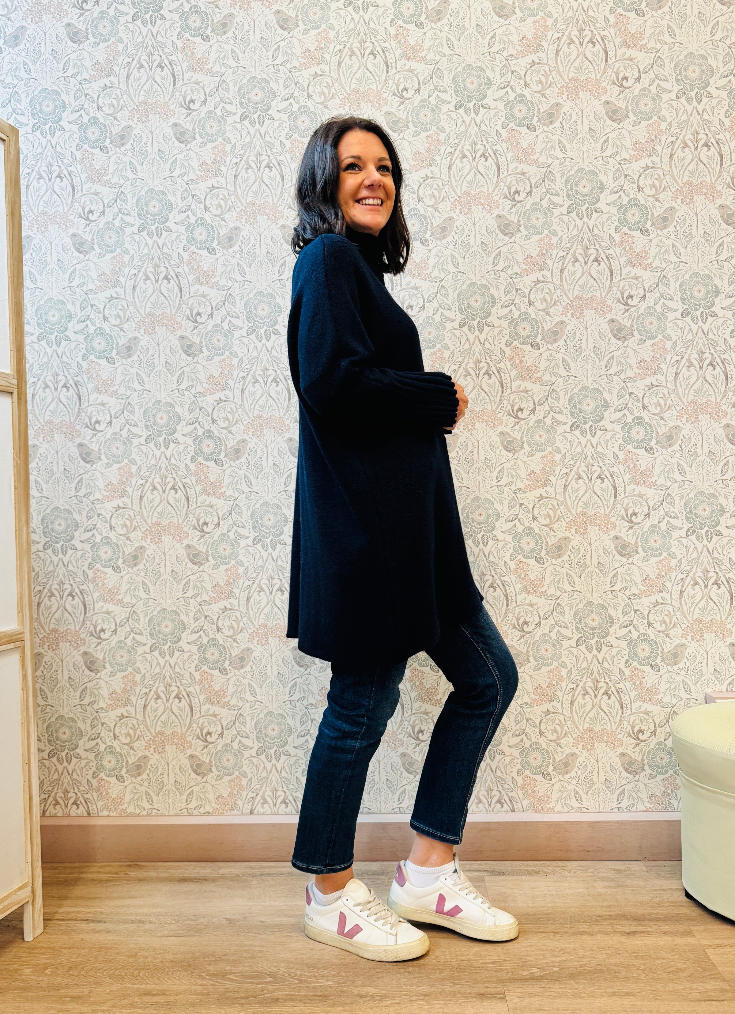 Maglione lungo con collo alto. Dettaglio a costine larghe sul collo e sui polsi, taglio leggermente svasato e vestibilità ampia. Perfetto anche come abito.
