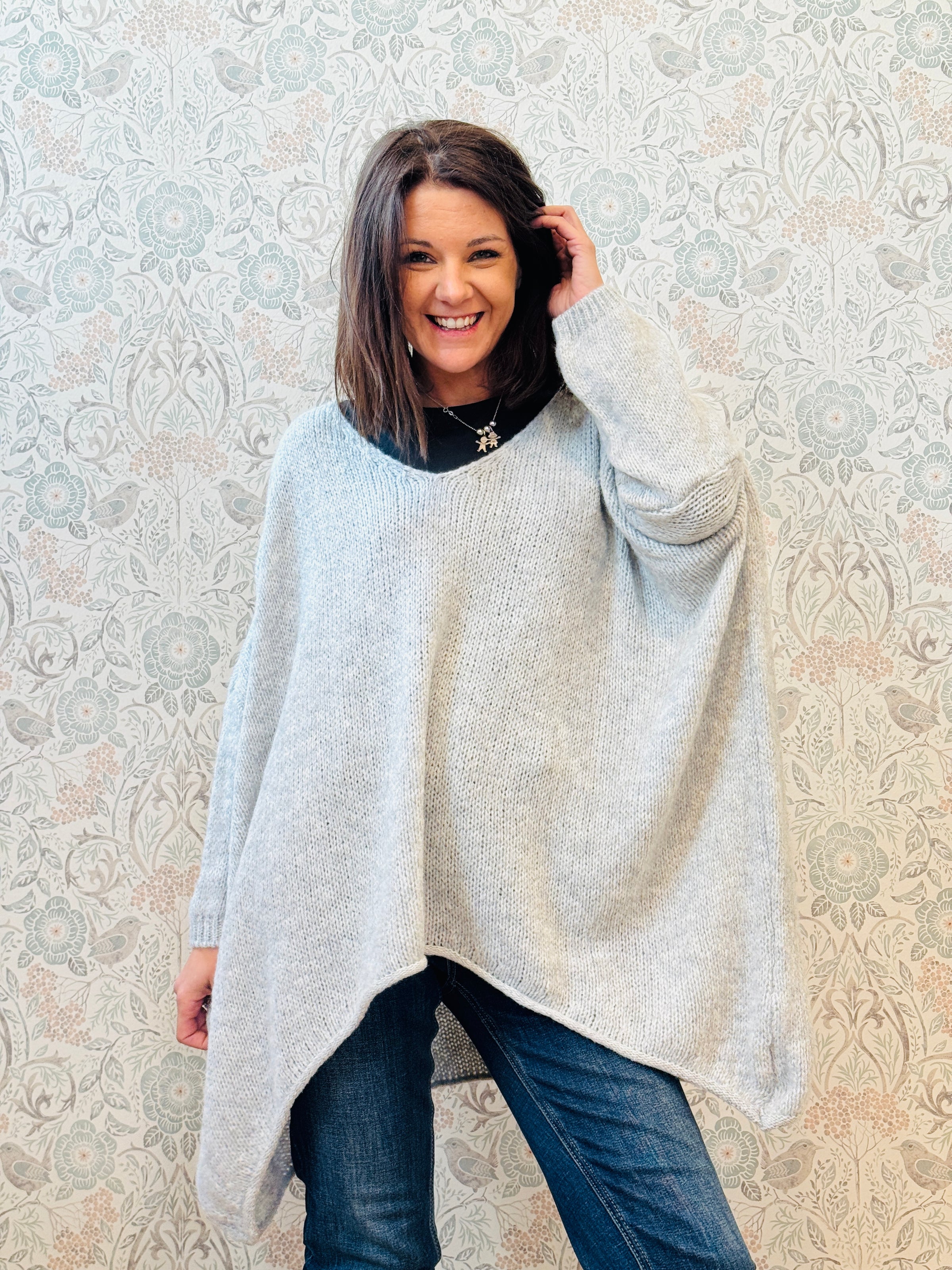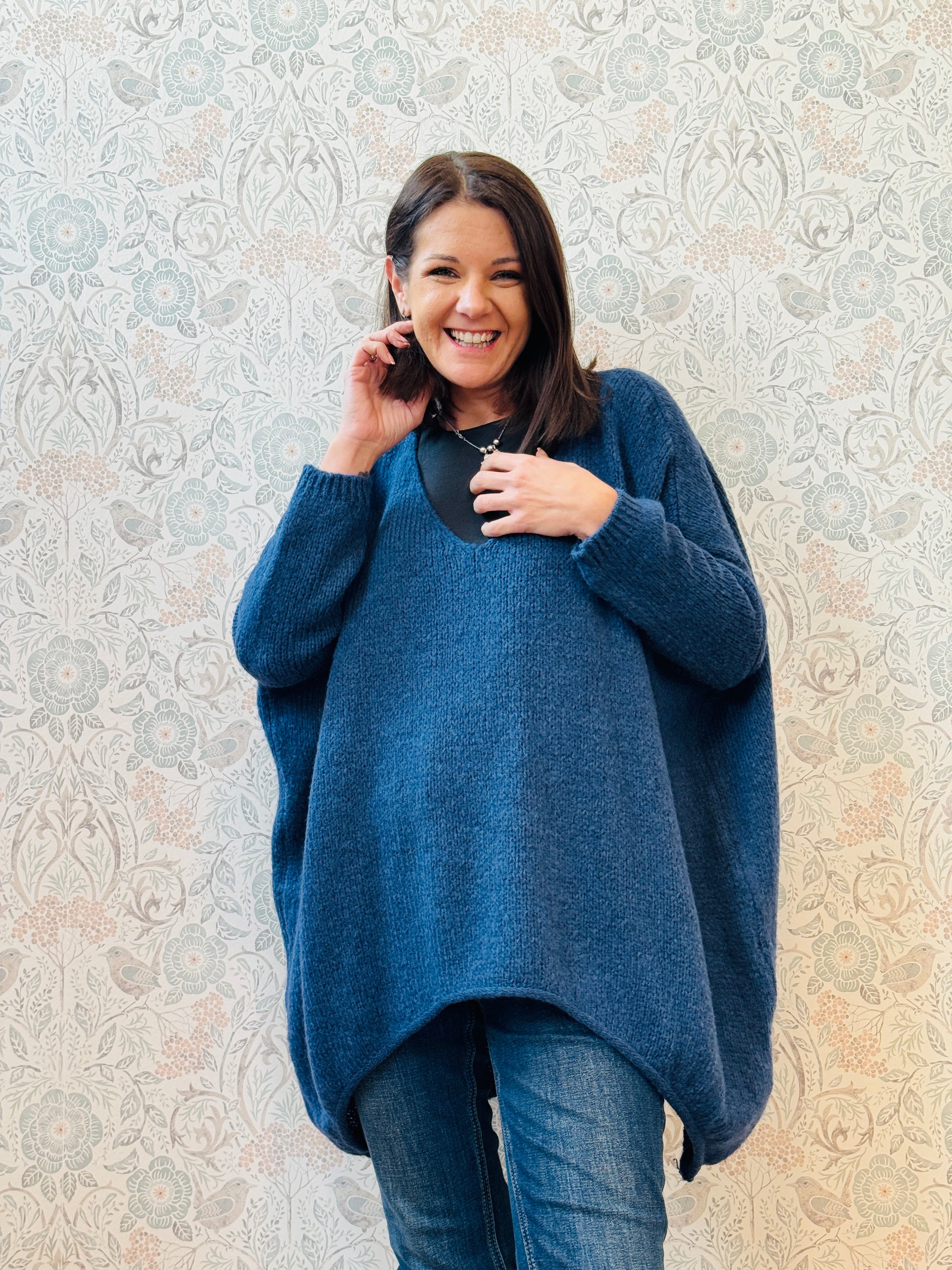 Maglione con scollo a V in trama grossa con collo alto risvoltato e taglio ampio e svasato.