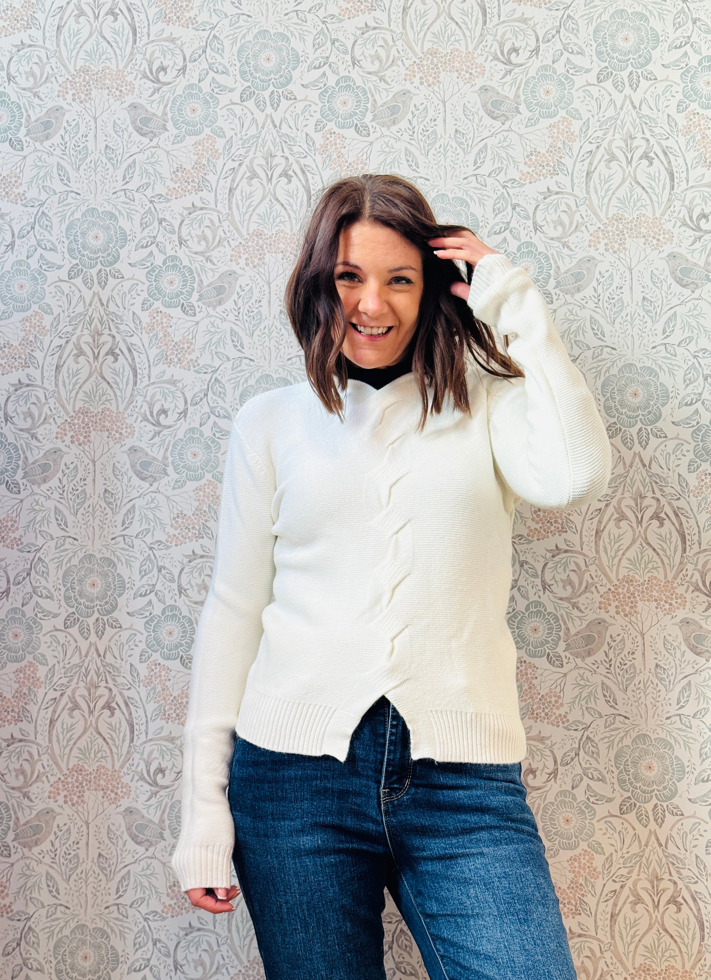 Maglione con lavorazione a costine e dettaglio intrecciato sul davanti. Collo alto aperto. taglio dritto e vestibilità morbida.