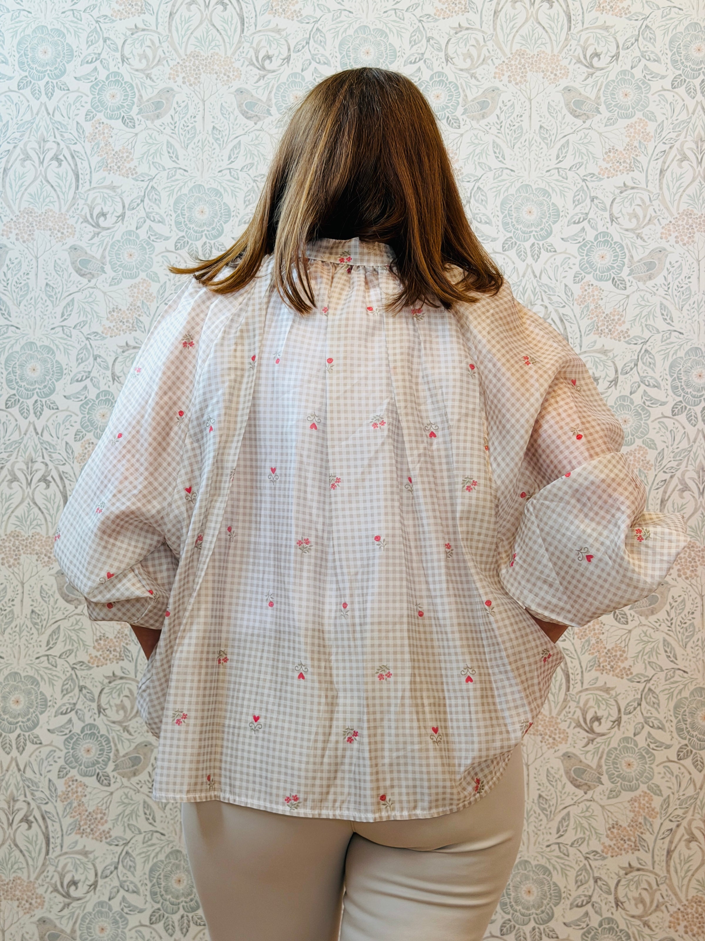 Blusa con scollo alla coreana e chiusura con bottoni ad asola, dalla vestibilita' over in varie fantasie floreali.