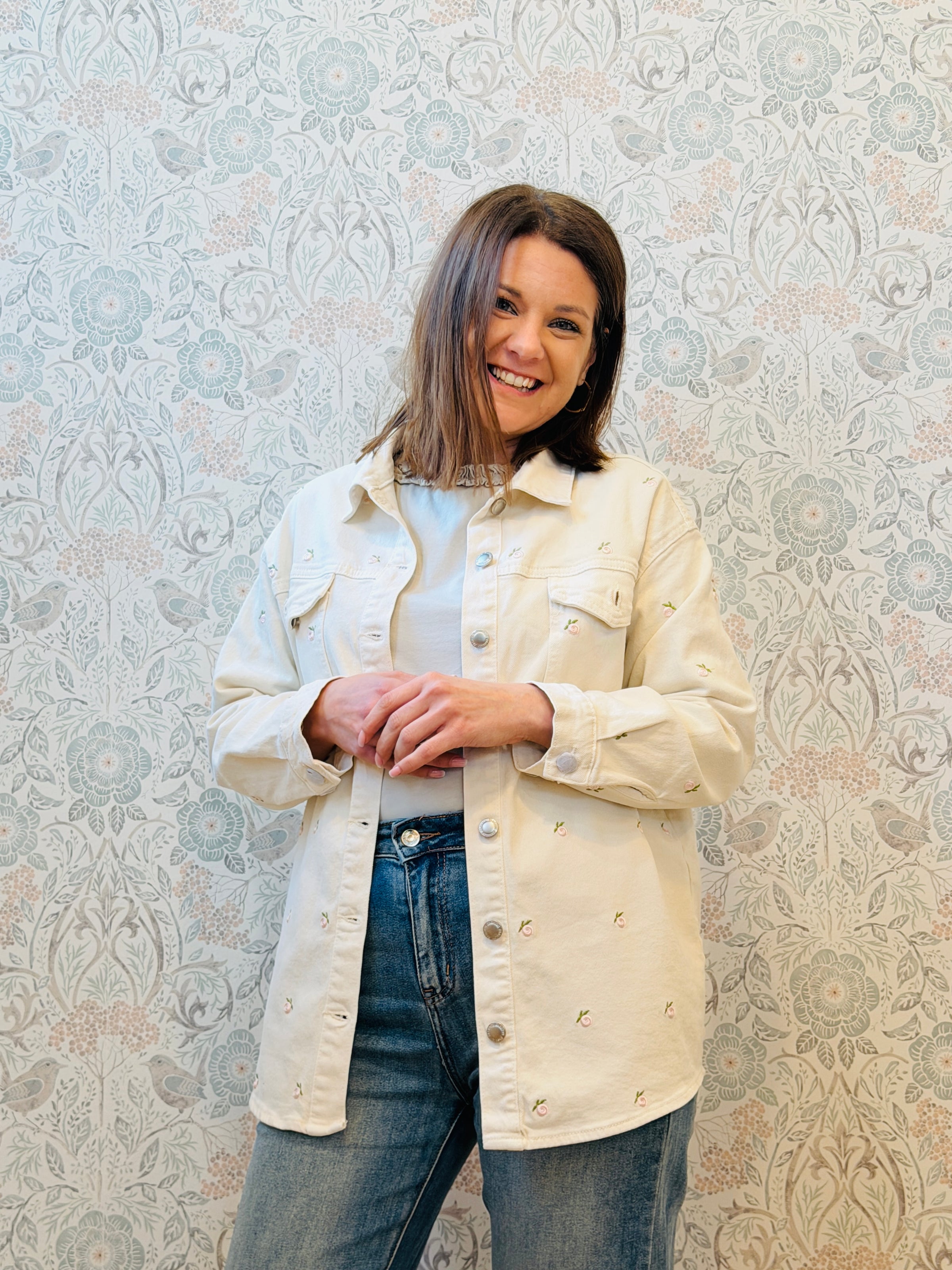 Camicia taglio classico color panna con fiorellini ricamati. Vestibilita' morbida e ampia.