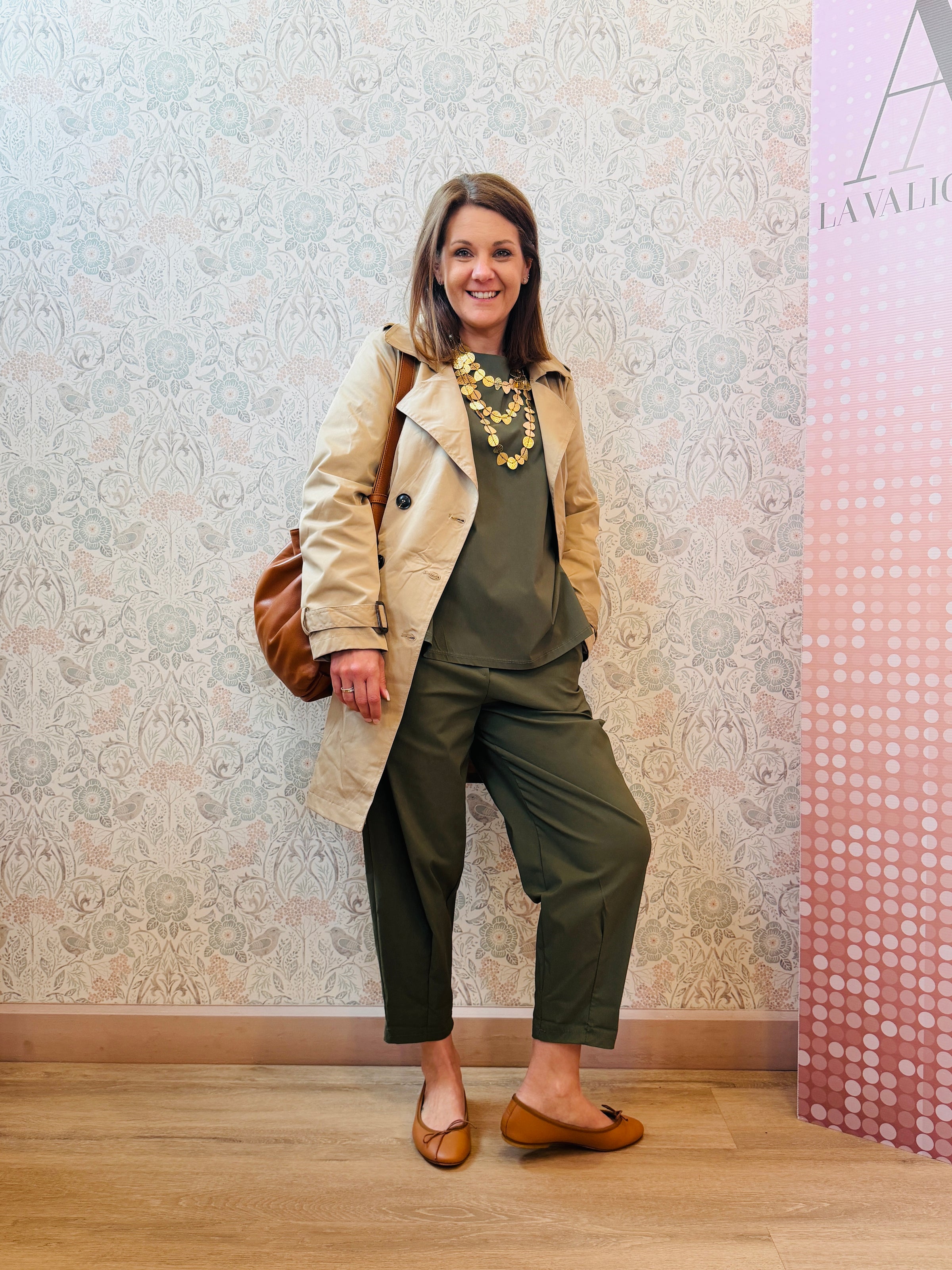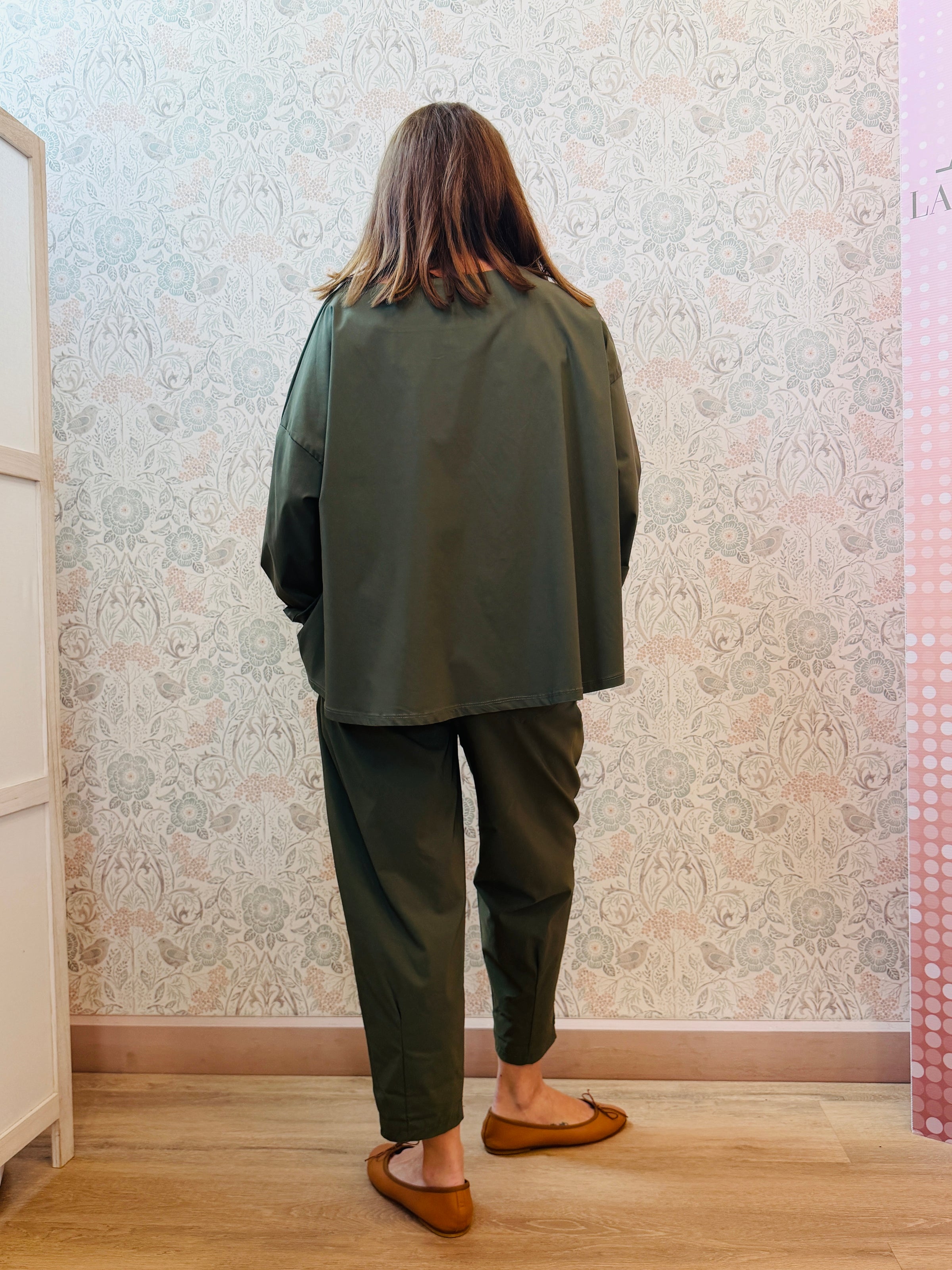 Completo composto da blusa ampia e svasata con scollo a barchetta ampio e pantalone con elastico e tasche laterali.