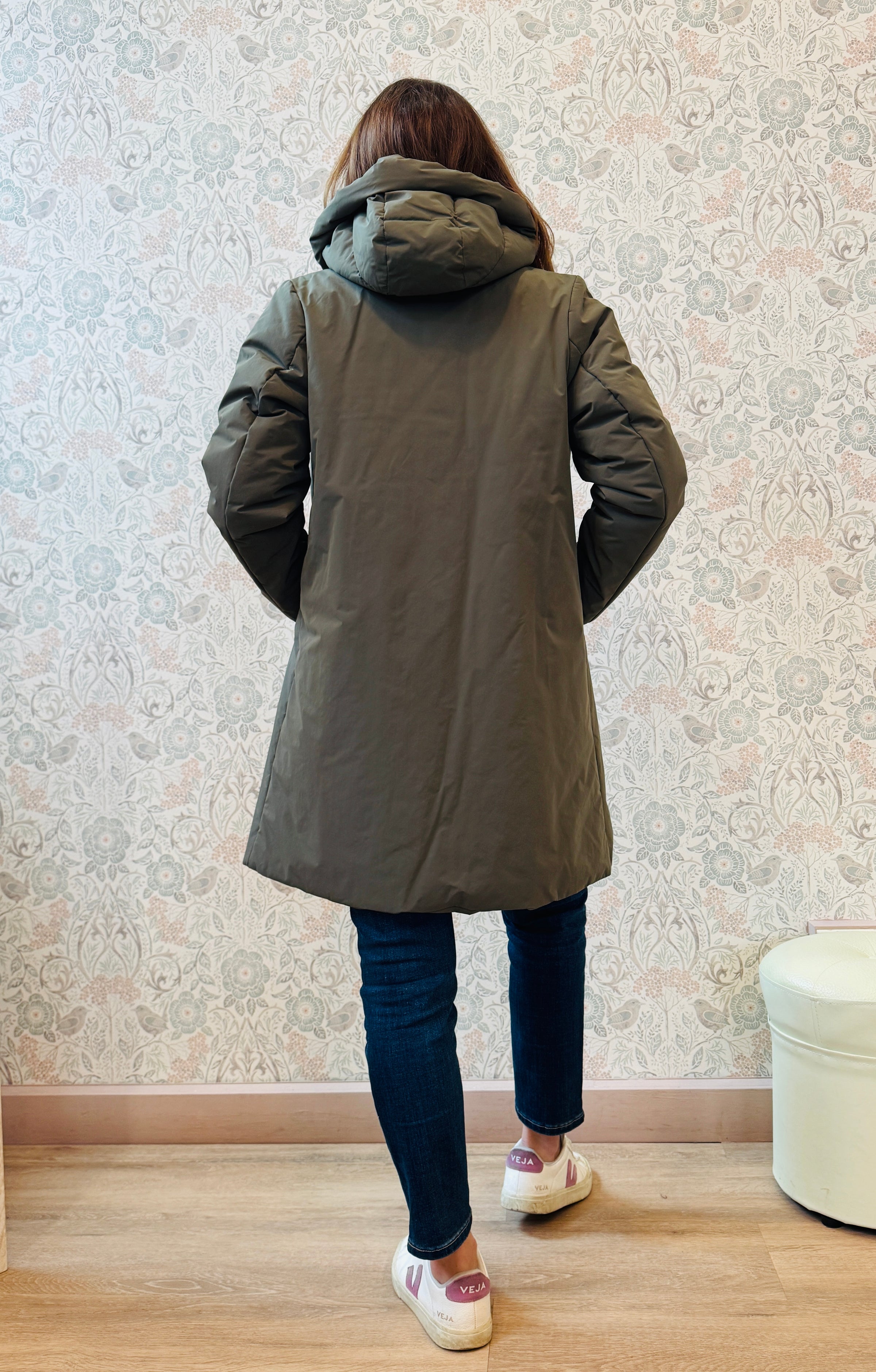 Giacca cappotto color militare con scollo a V, chiusura con bottoni ad asola e taglio dritto. Imbottitura con cappuccio removibile.