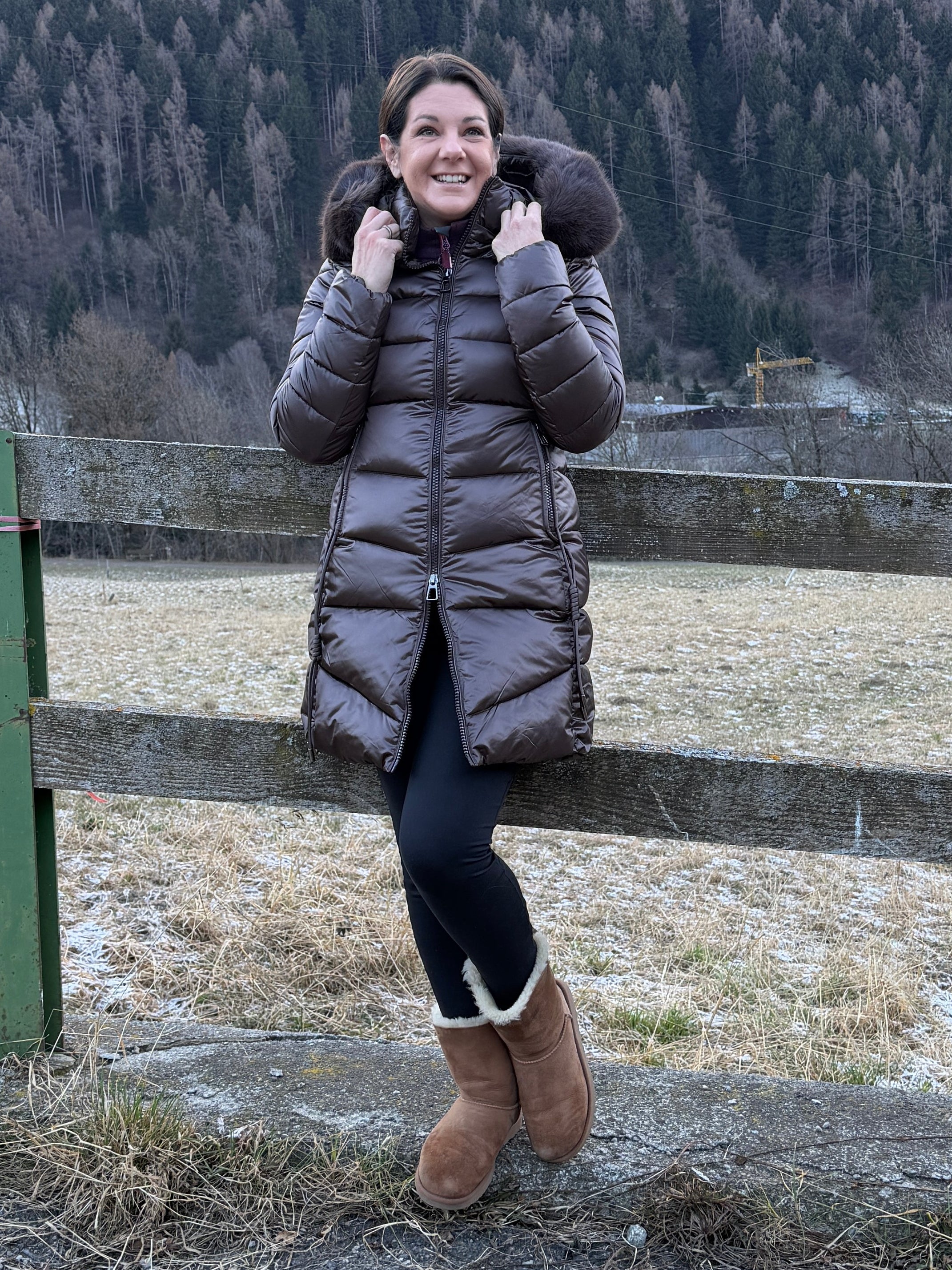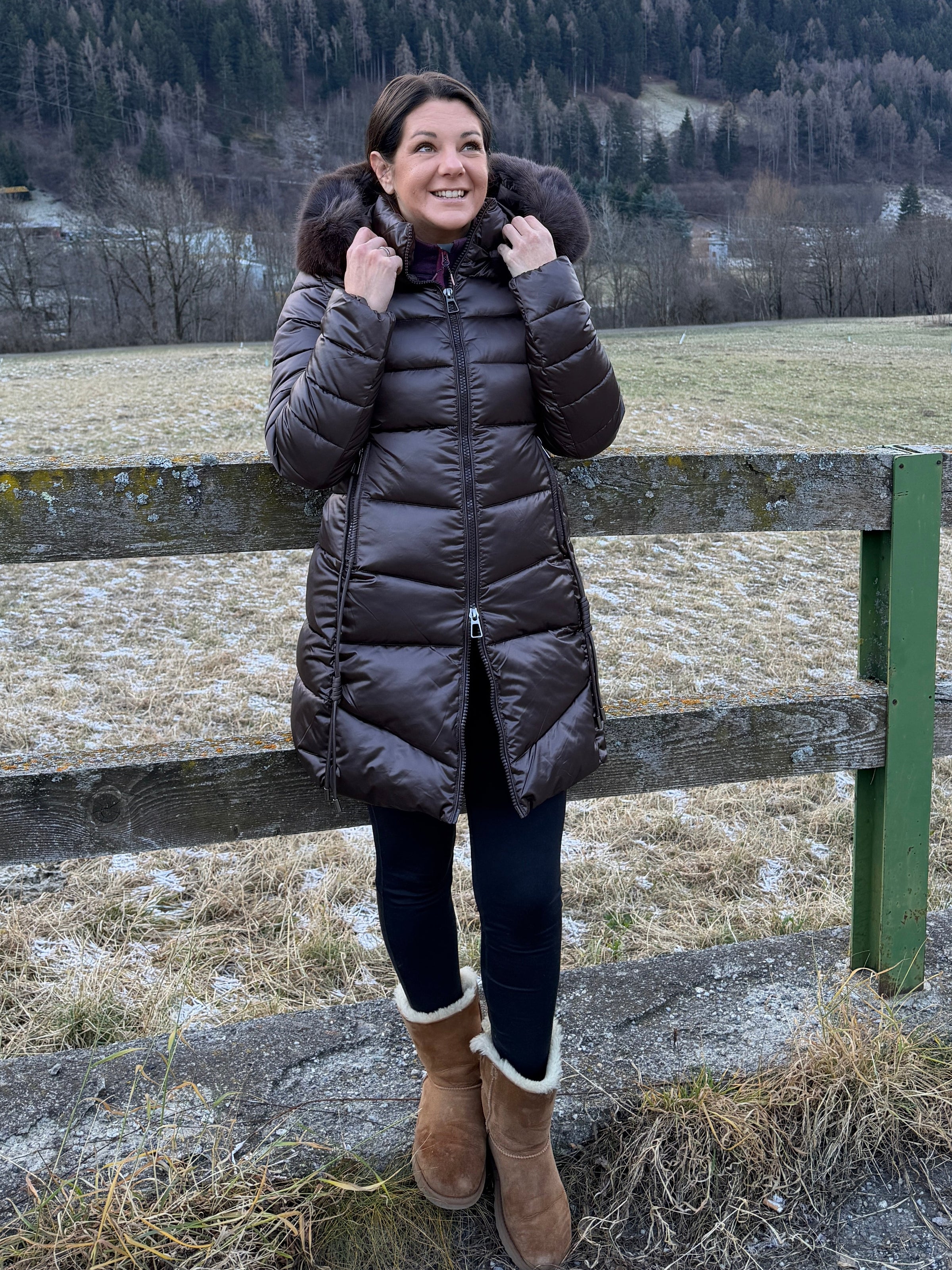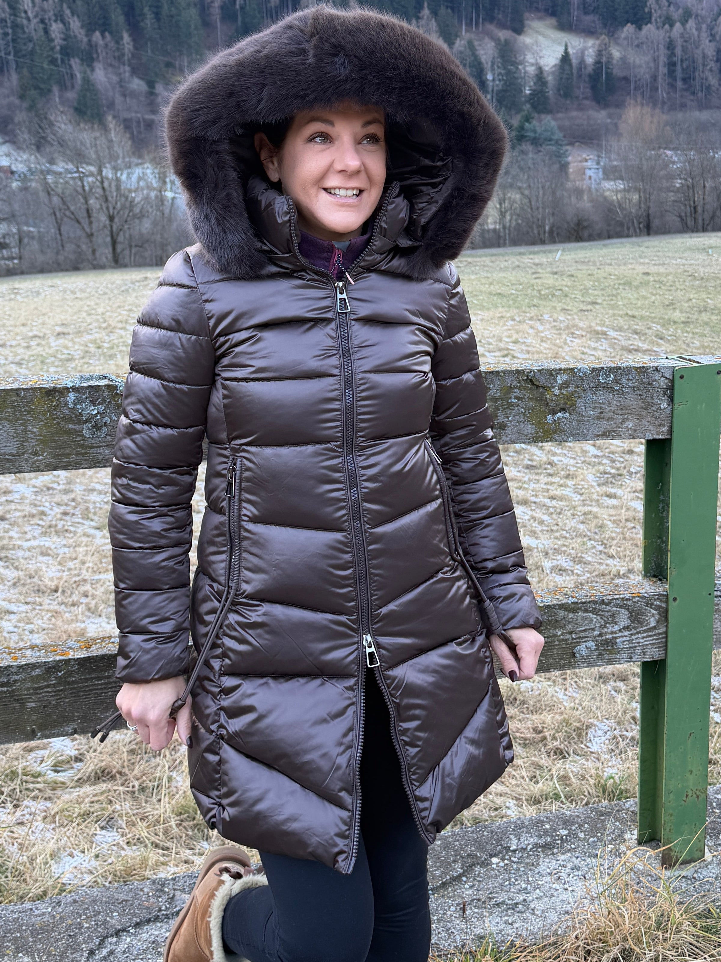 Giacca piumino color marrone con collo alto, cappuccio (con pelliccia sintetica removibile), chiusura con zip e tasche laterali con zip con elastico sui bordi finali.