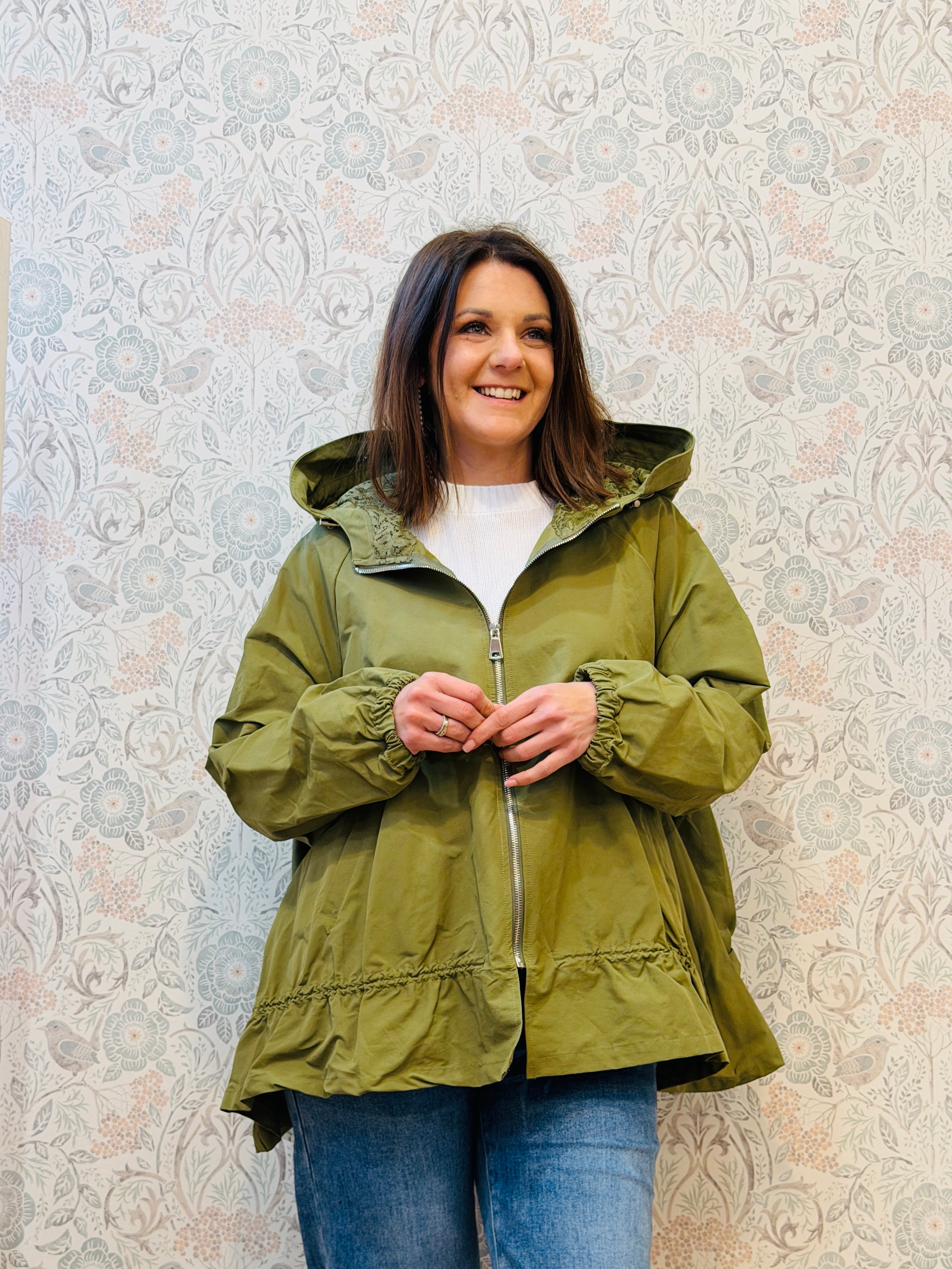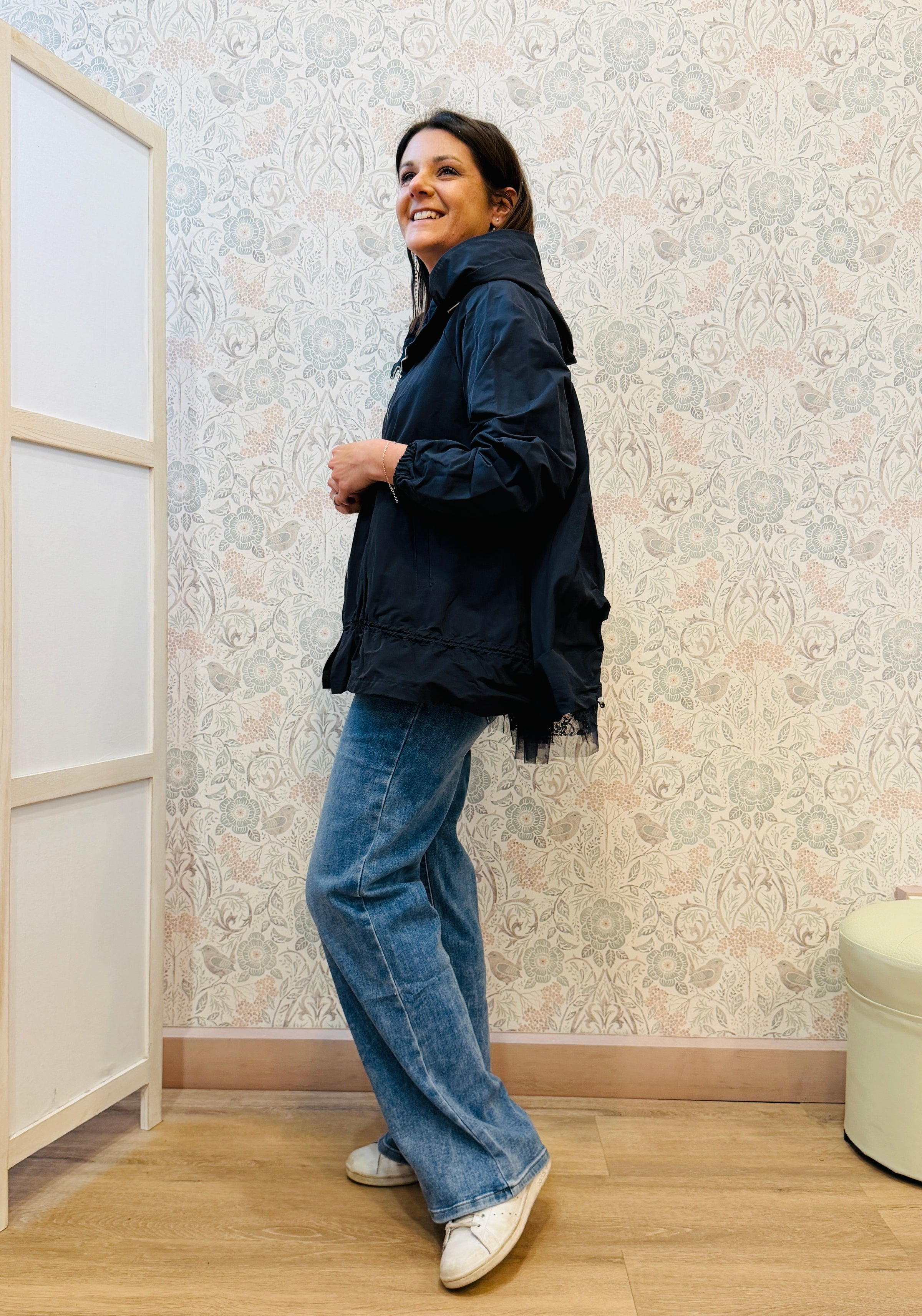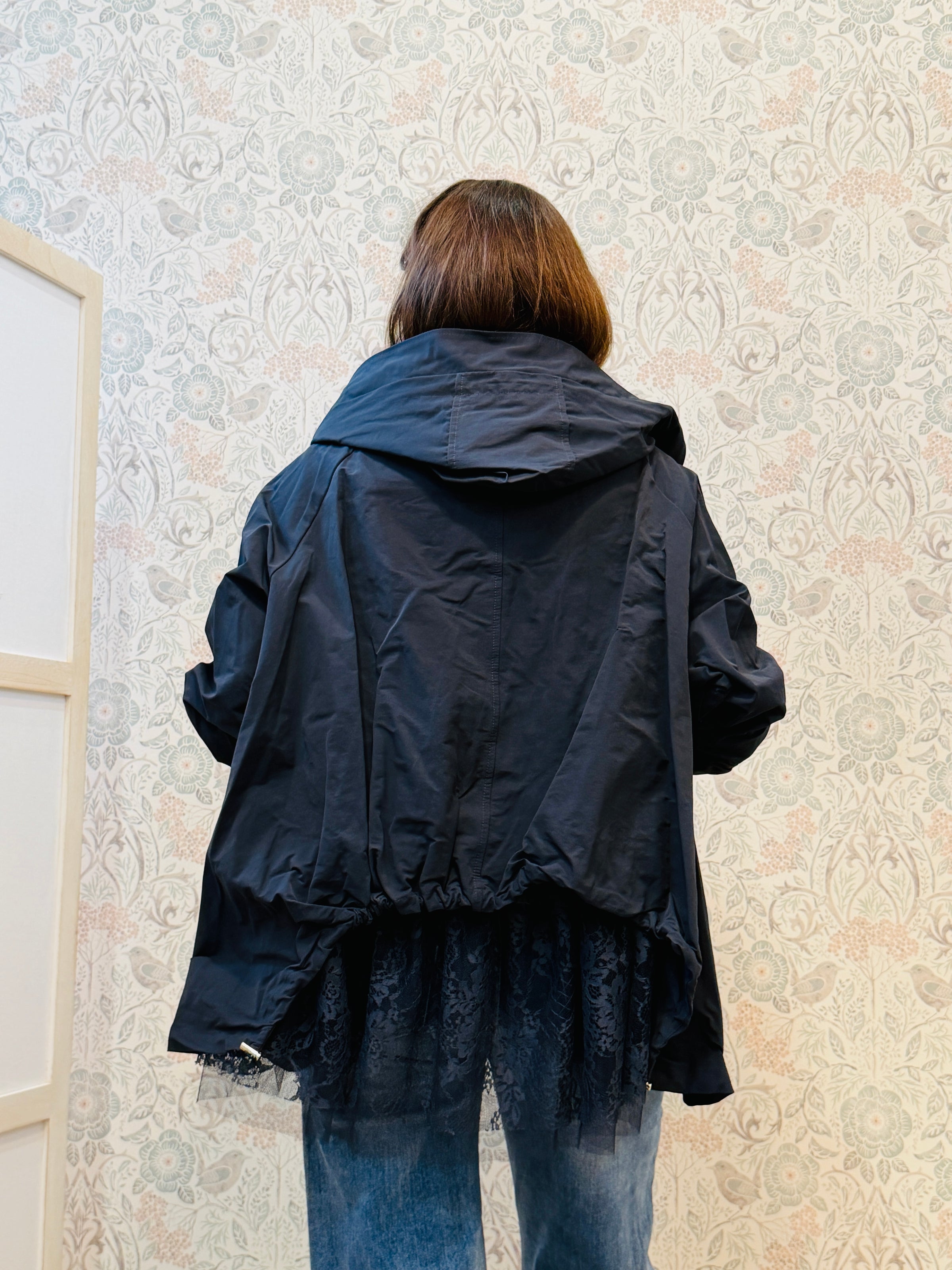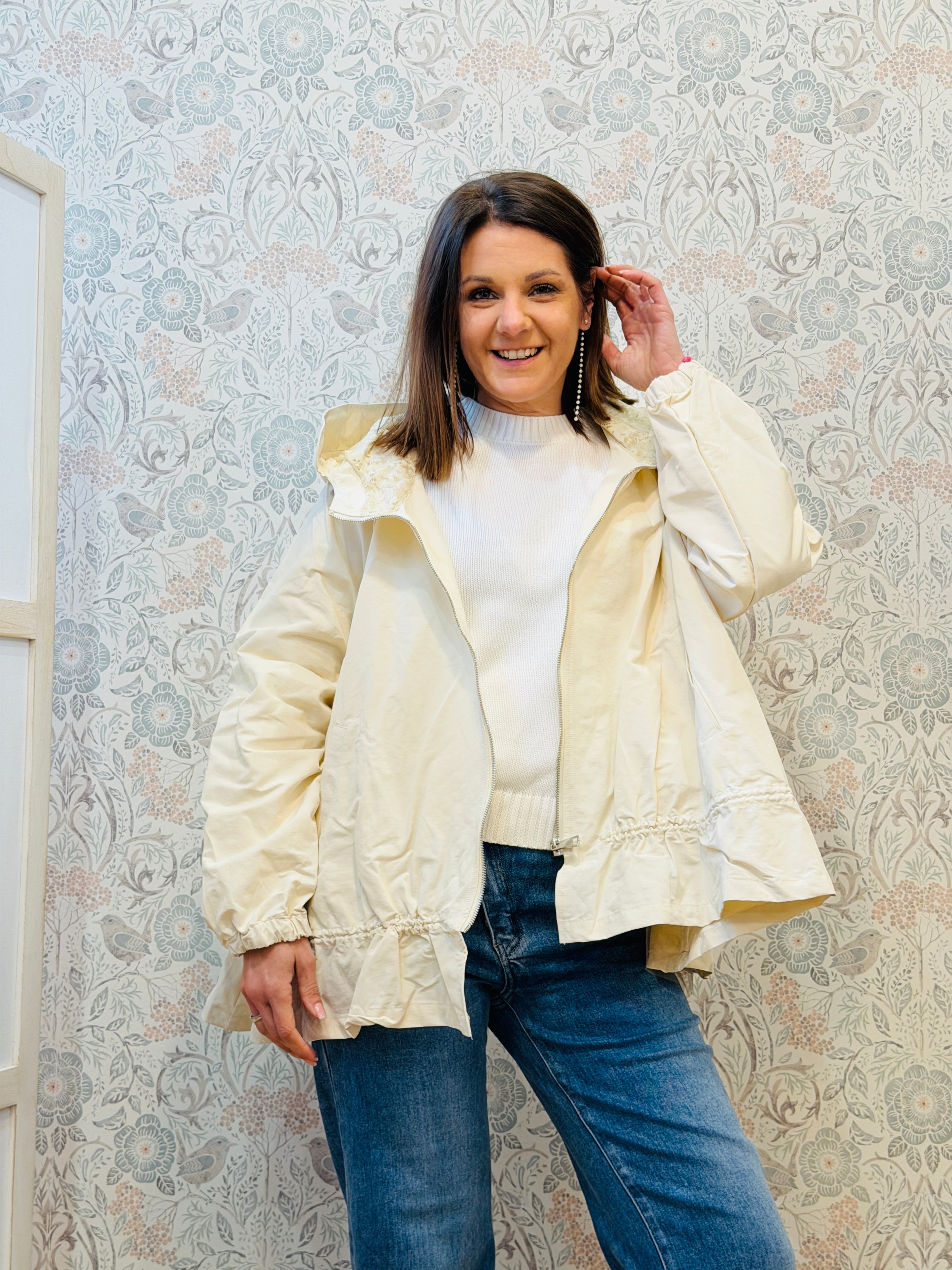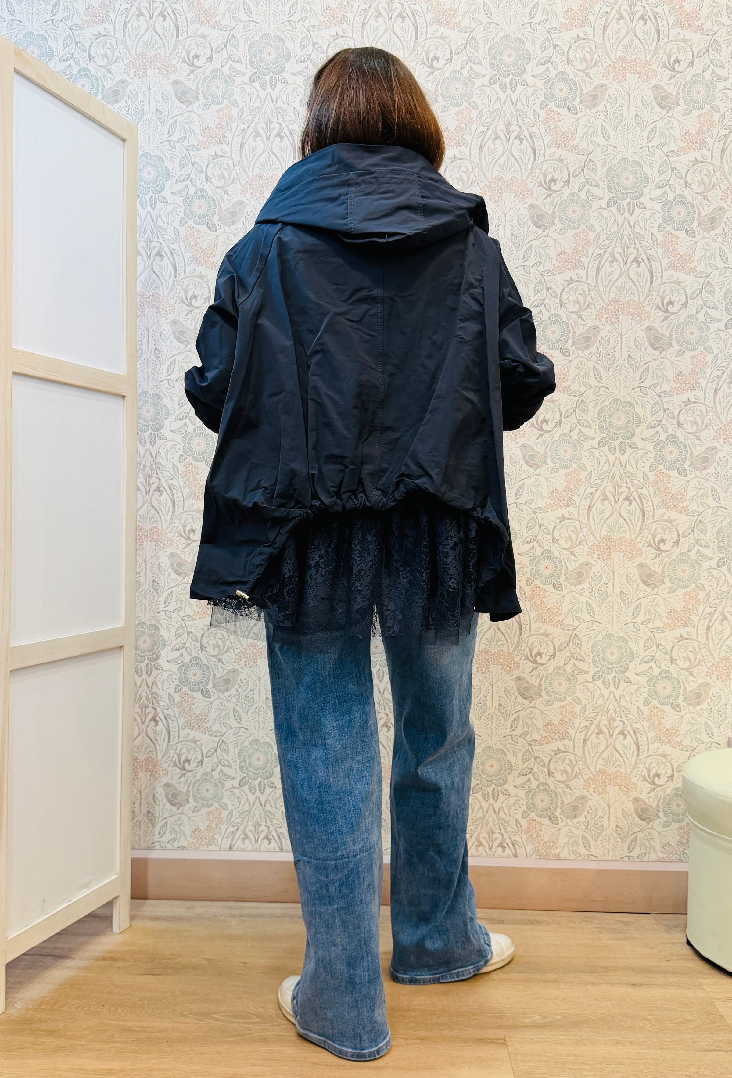 Giacca spolverino con cappuccio, chiusura con zip e tasche laterali aperte. Dettagli in pizzo nell'interno del cappuccio e sulla banda finale sul retro. Taglio svasato con possibilita' di stringere. Vestibilita' ampia e morbida.