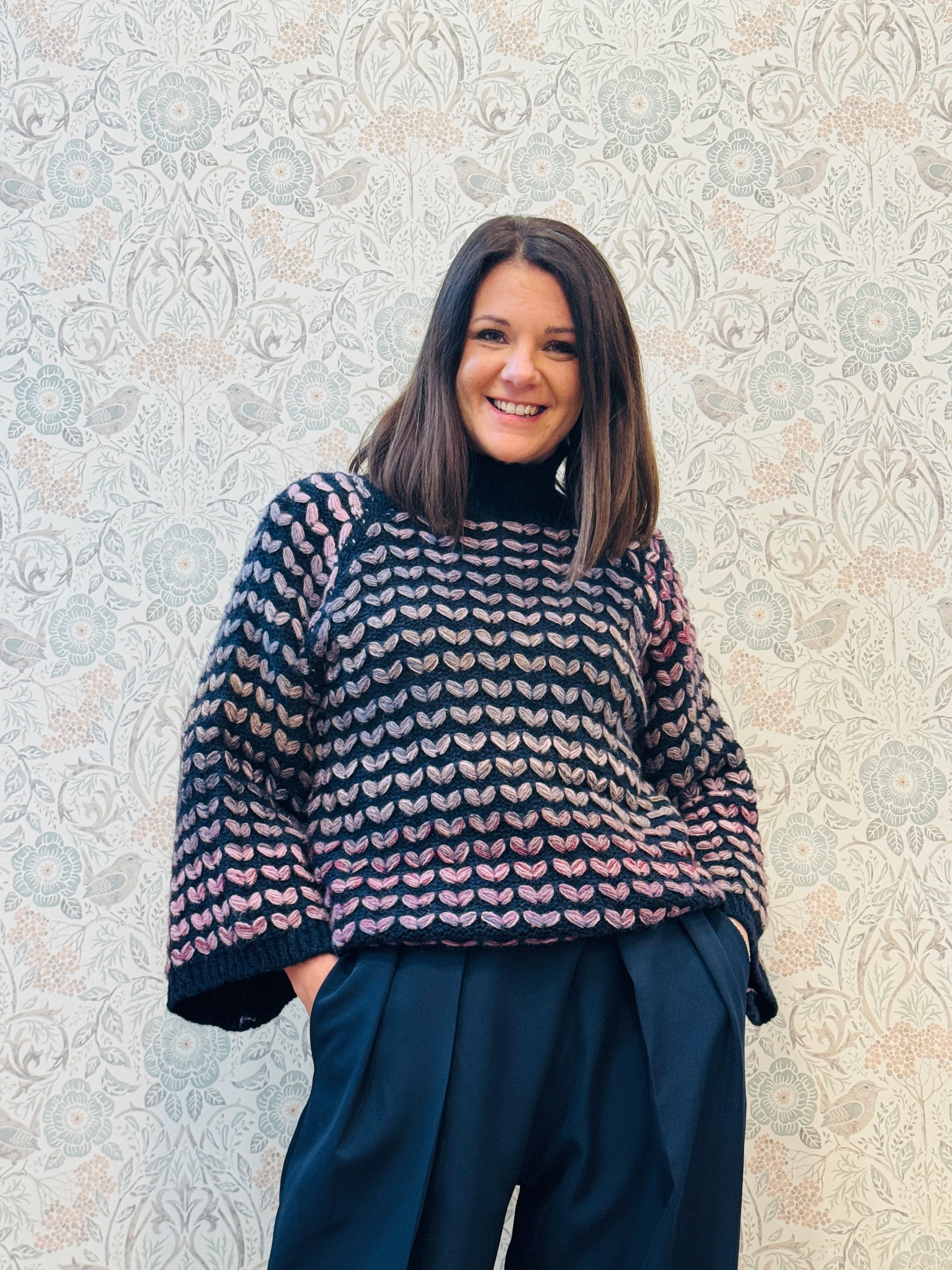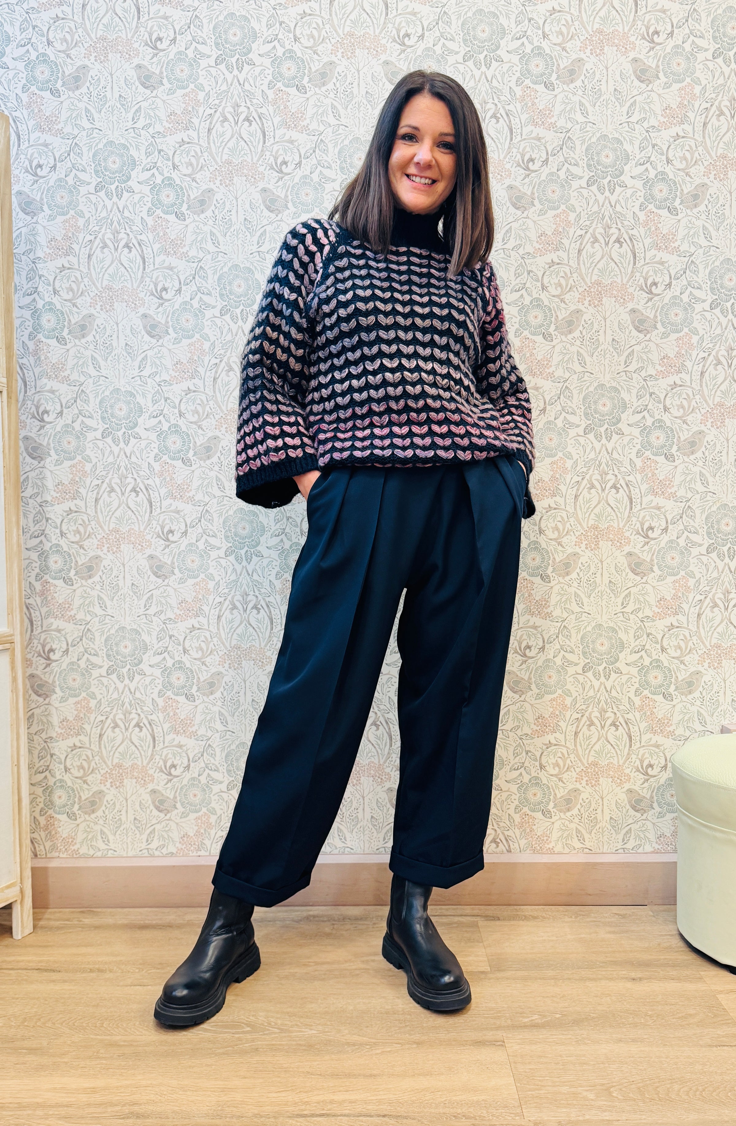 Maglione dolcevita color blu notte con ricami color lilla. Vestibilita' morbida e taglio svasato.