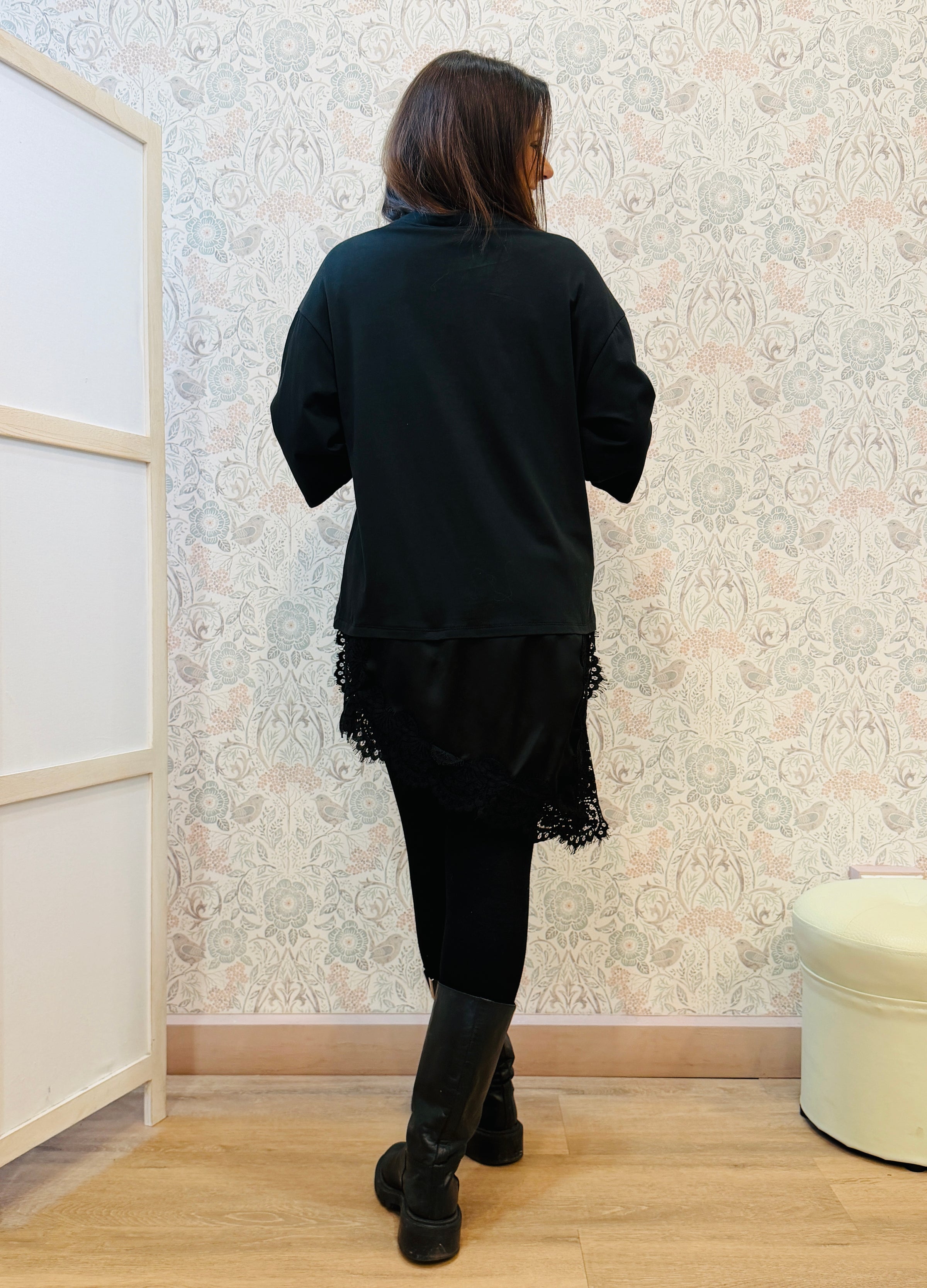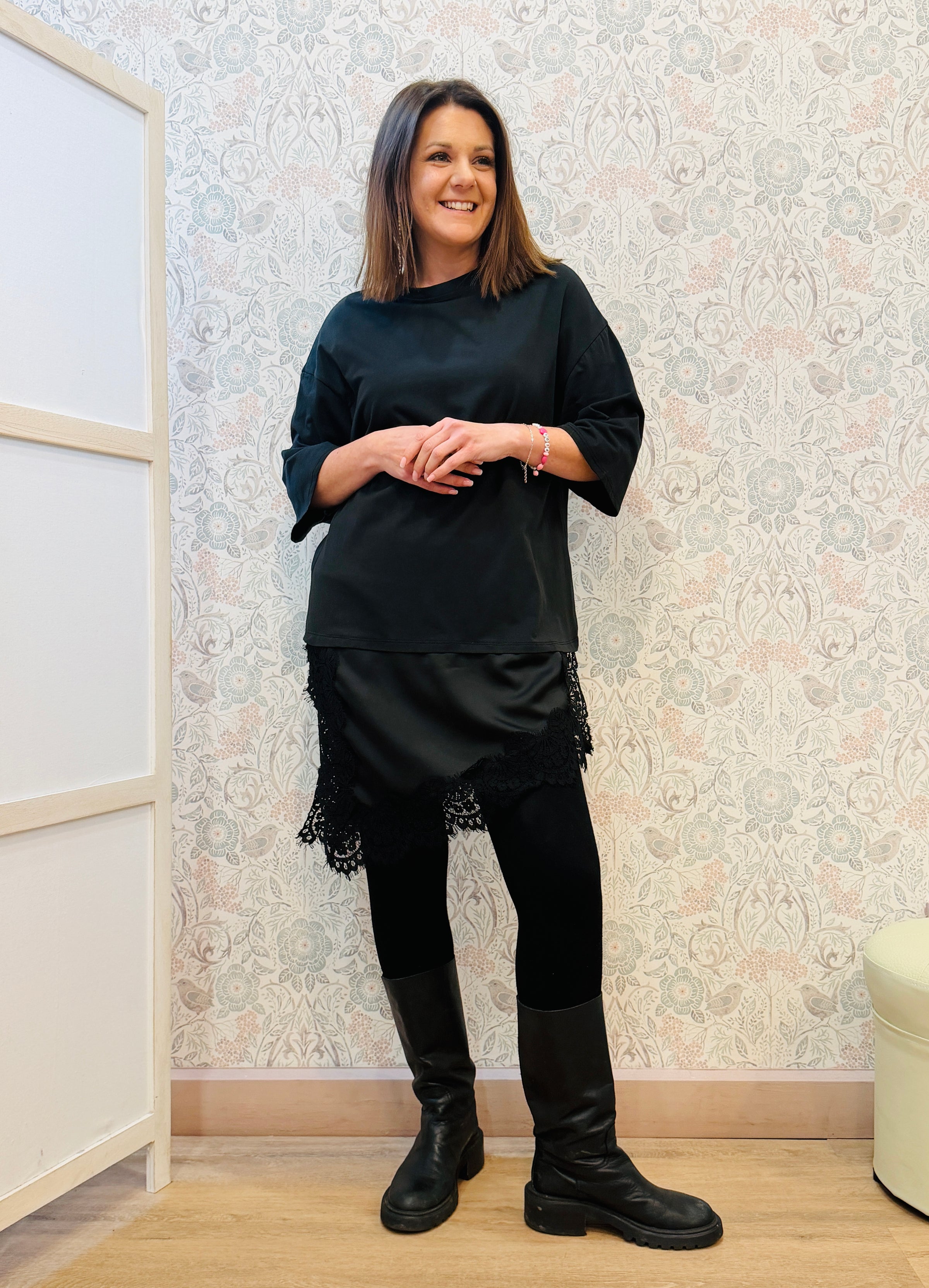T-shirt a manica corta lunga con scollo tondo, taglio dritto e leggermente svasato, con banda finale in raso e bordo di pizzo.