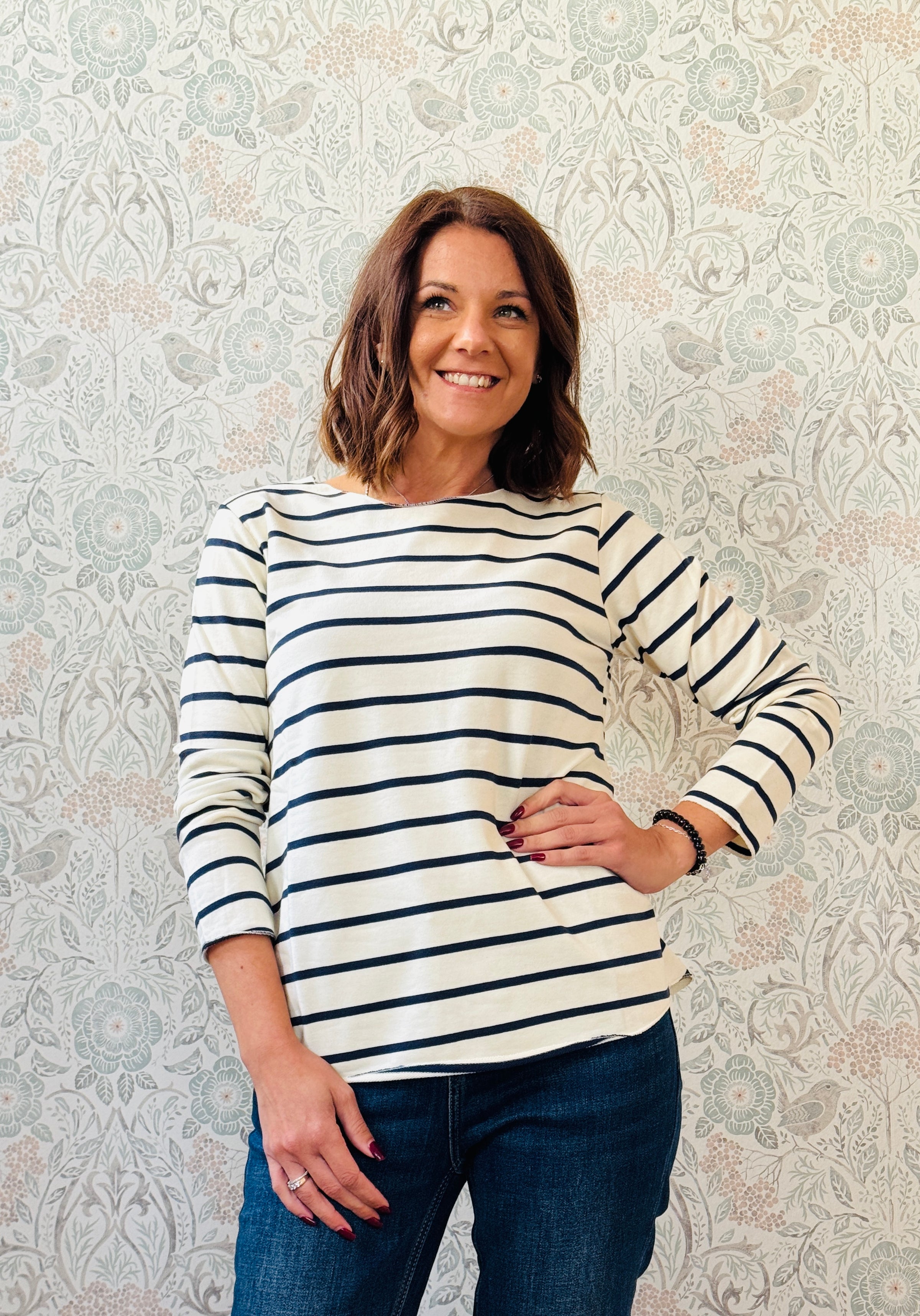 T-shirt a manica lunga con fantasia a righe, scollo a barchetta e taglio svasato.