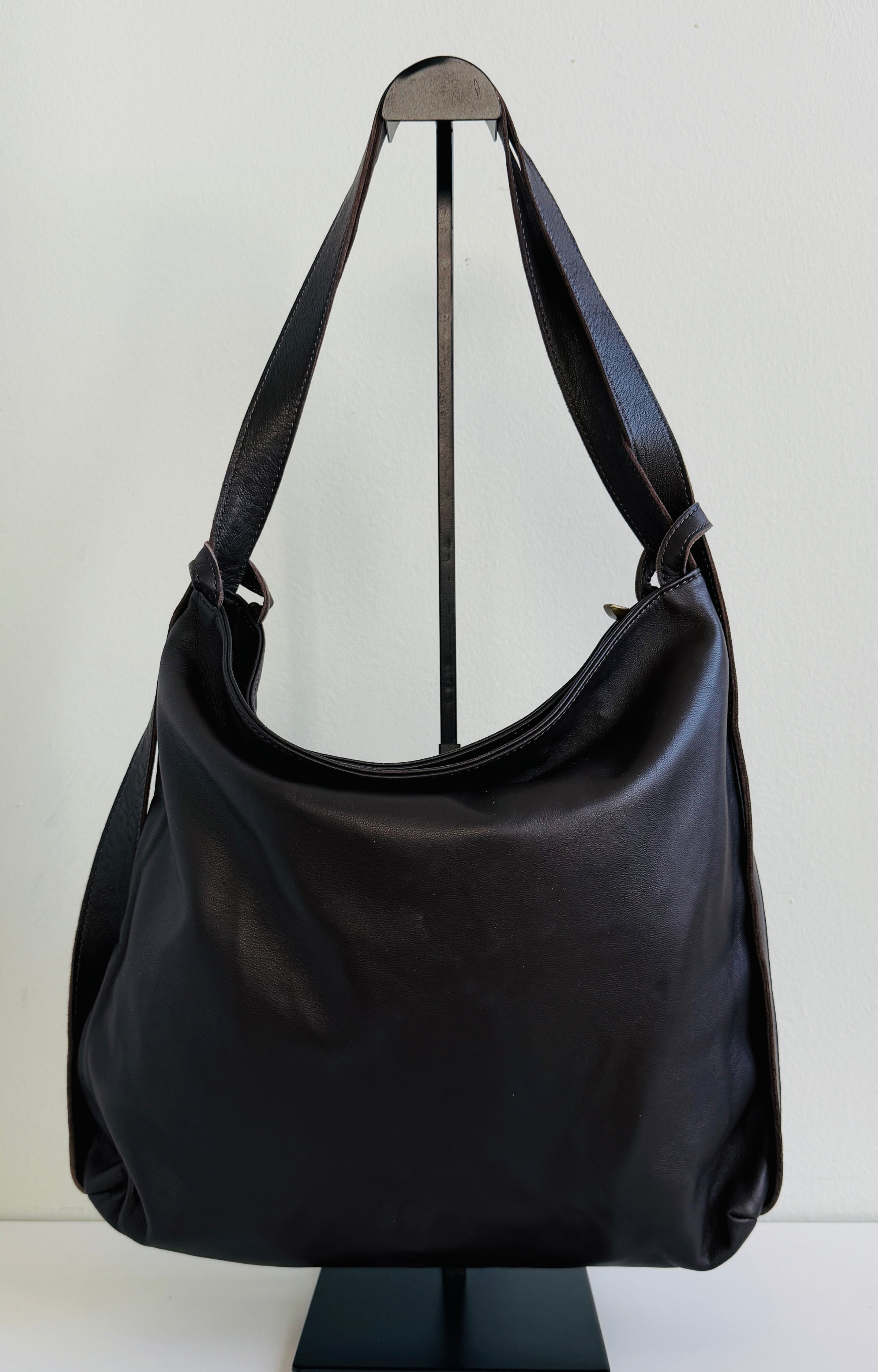 Zaino in pelle liscia marrone caffe'con chiusura a zip, tasca interna con zip e tasca esterna con zip. Possibilita' di indossarlo come borsa oppure come zaino.