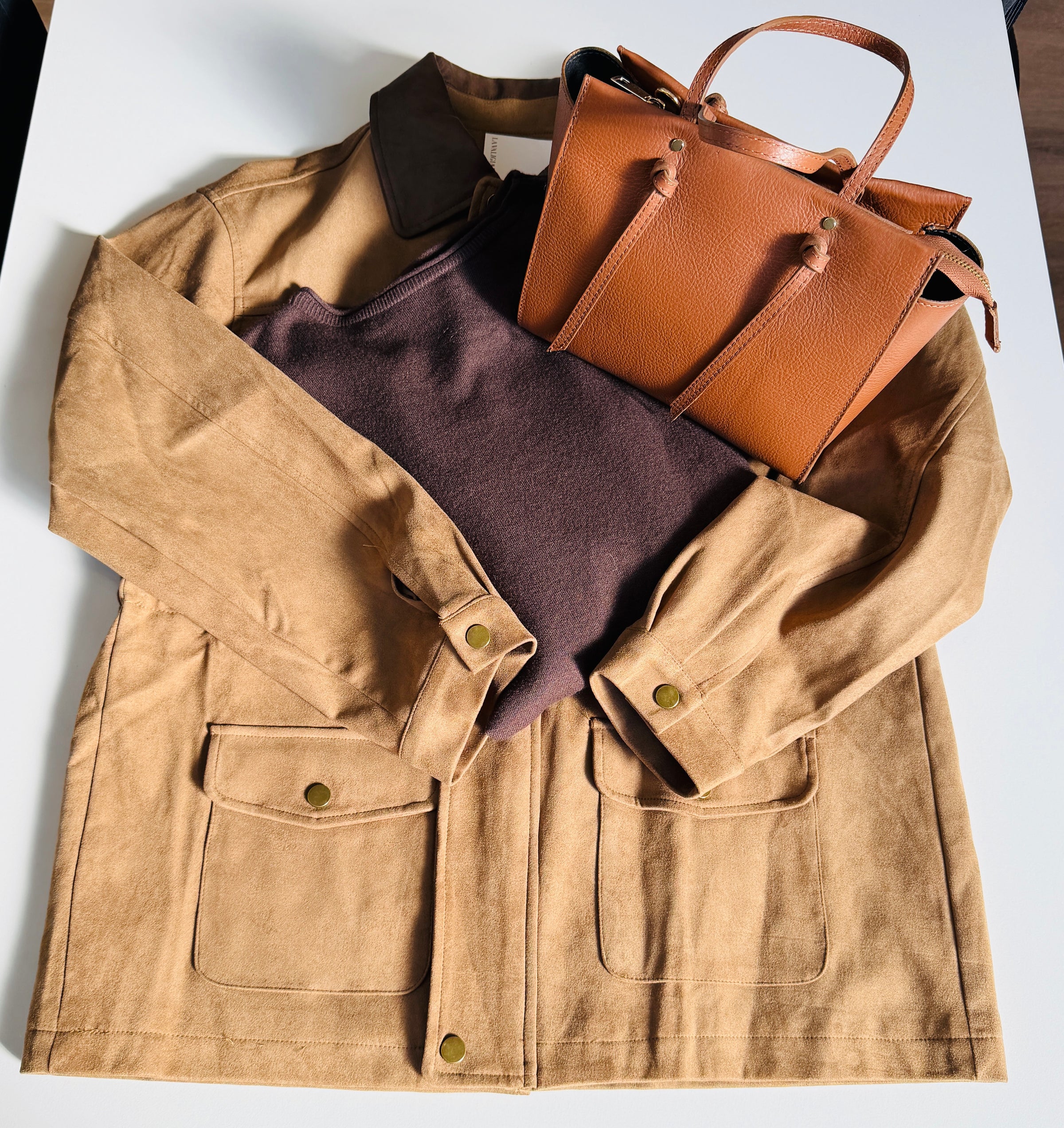 Box composta da : maglione rihanna marrone (50%viscosa, 28%poliestere e 22%nylon),con scollo tondo dal taglio svasato e con vestibilita' morbida; giacca dublino (90% poliestere e 10%spandex), scamosciata con colletto, chiusura con zip coperta e tasche laterali a vita,aperte con chiusura con bottone; e borsa bauletto color cuoio(100%pelle).