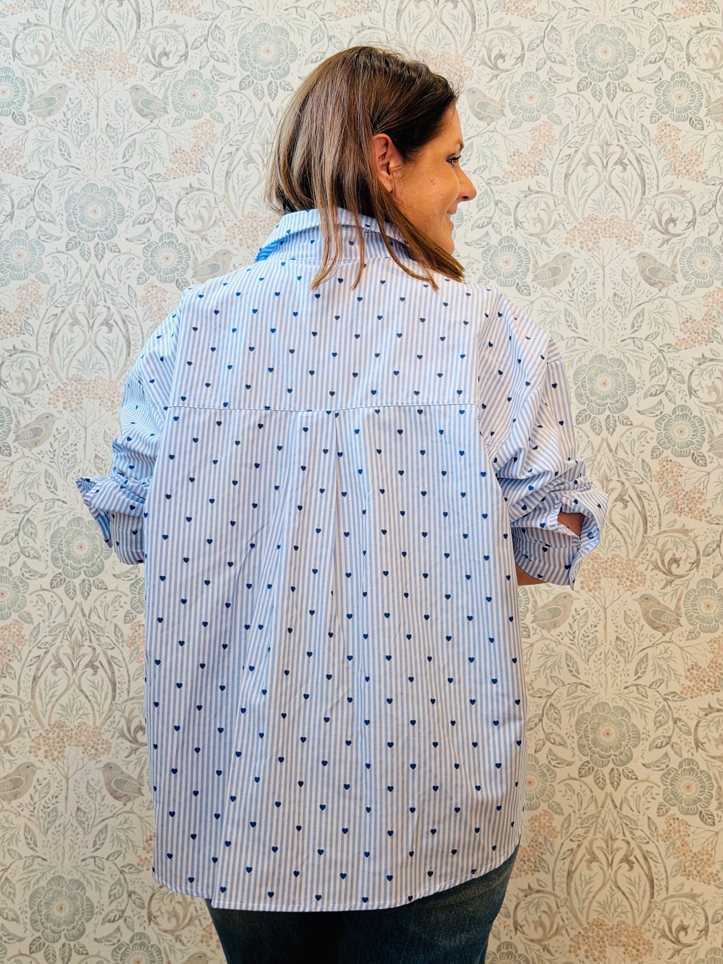 Camicia dal taglio classico con vestibilita' ampia e morbida. Fantasia a righe orizzontali bianca e blu con cuoricini ricamati.