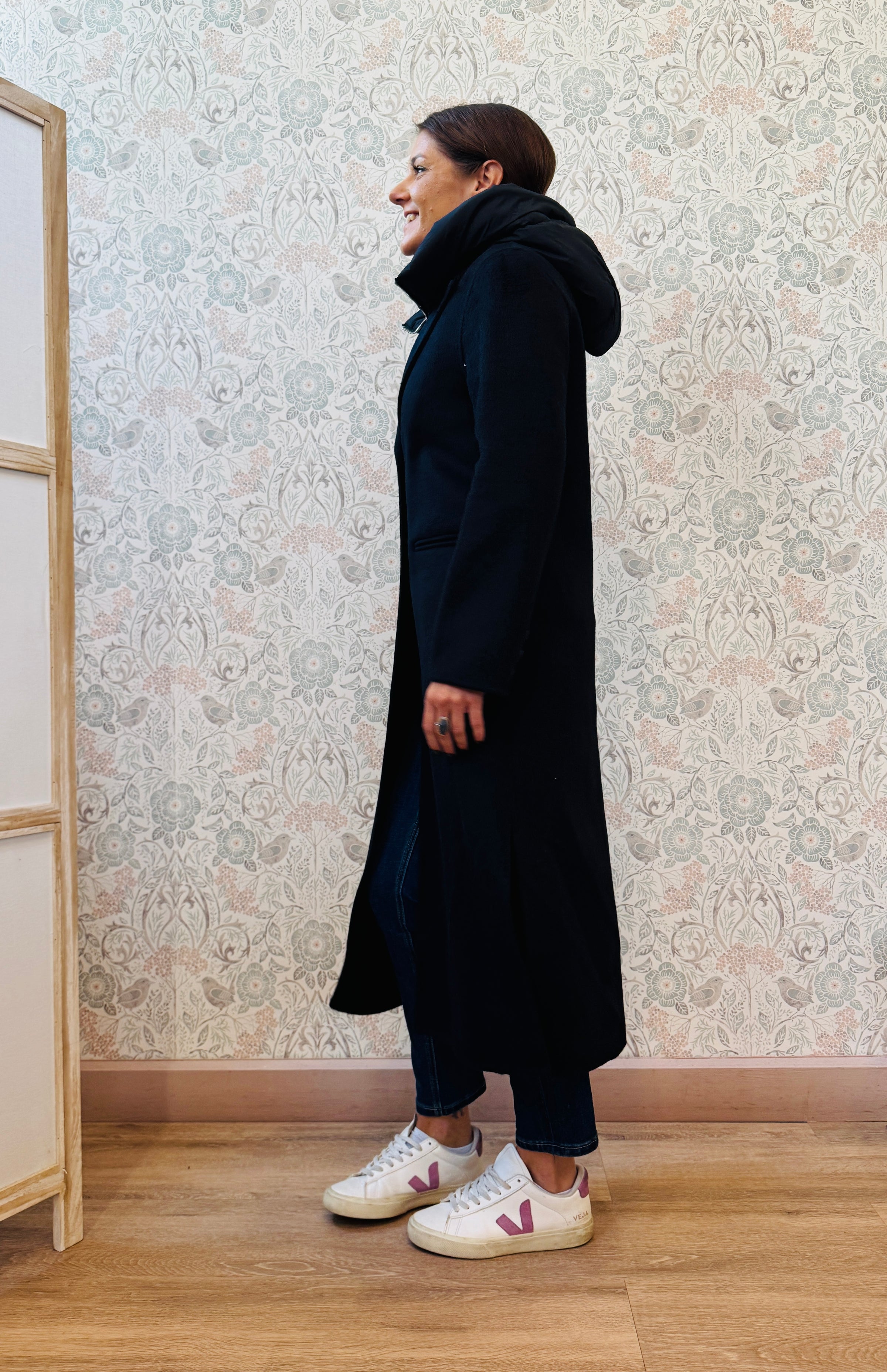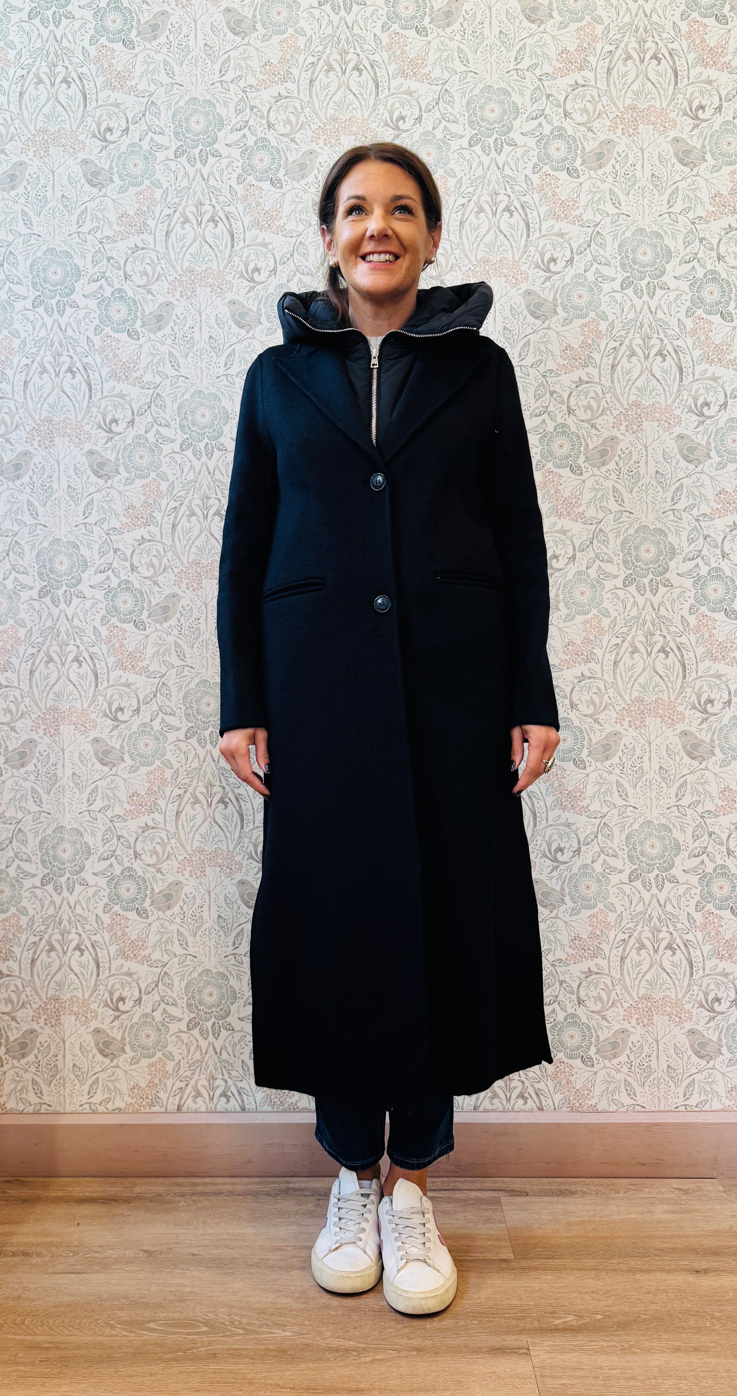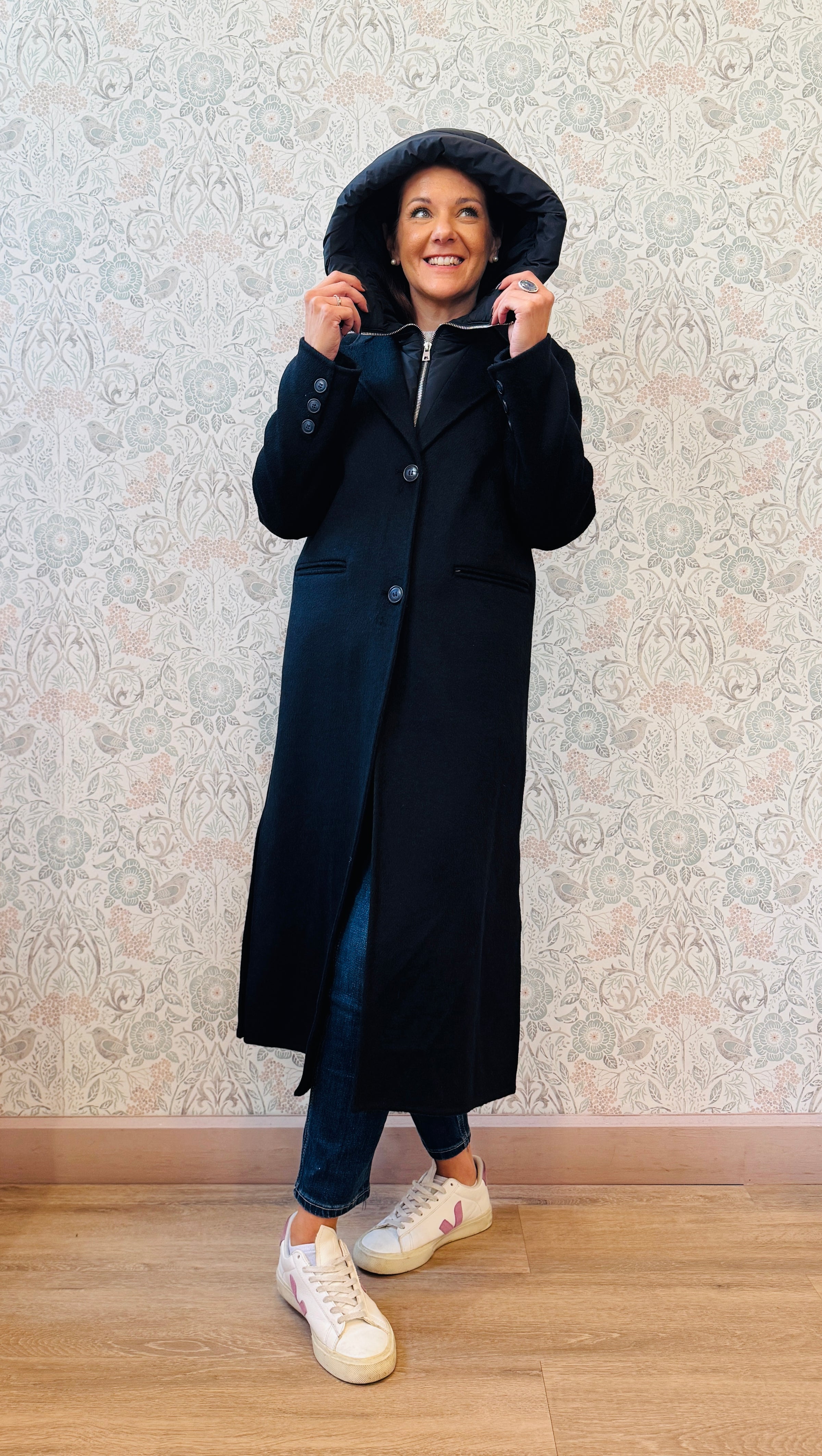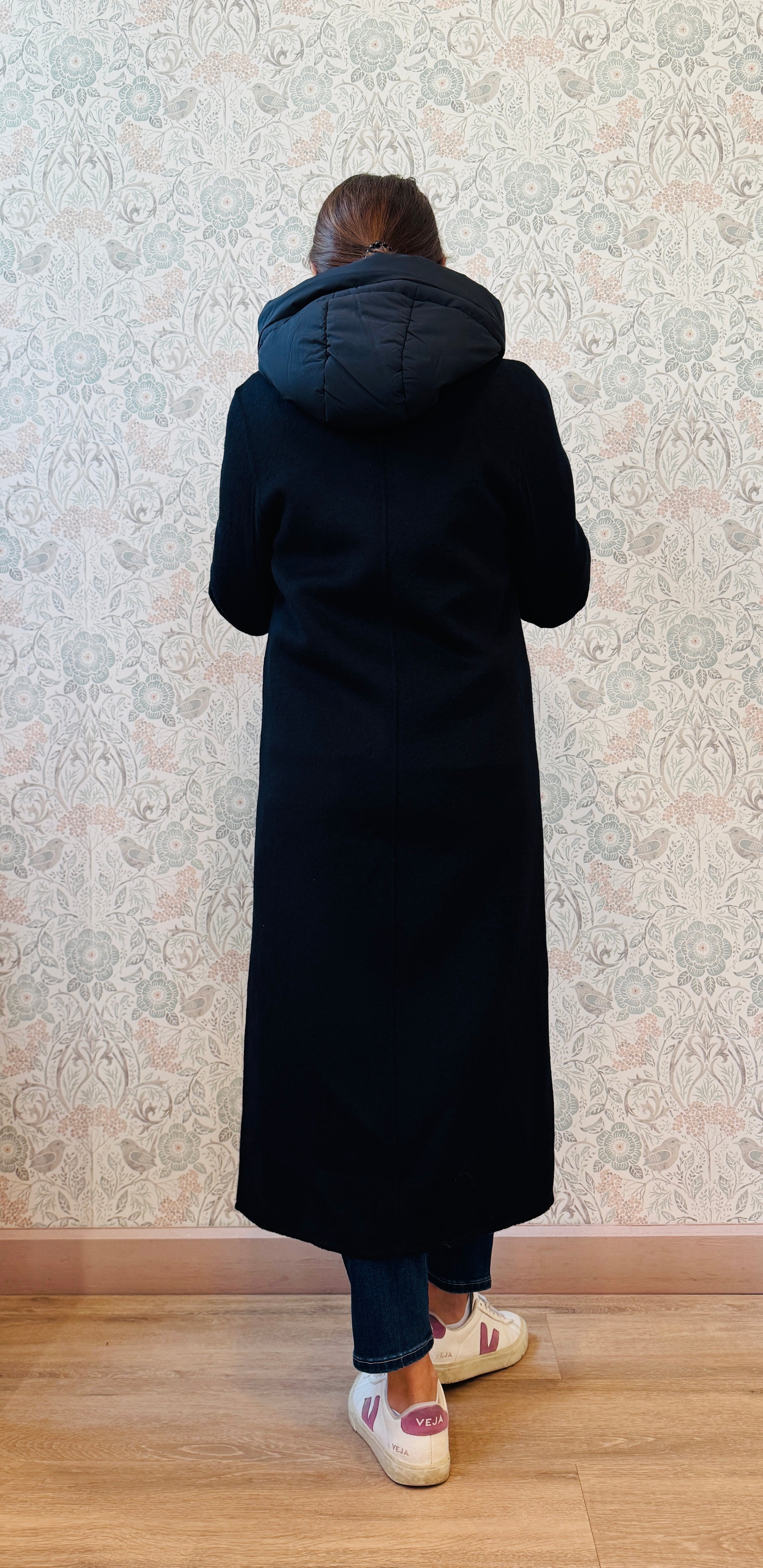 Cappotto lungo color blu notte con scollo a V e chiusura ad asola con bottoni tono su tono e tasche sul davanti aperte e visibili. Imbottitura con cappuccio removibile.