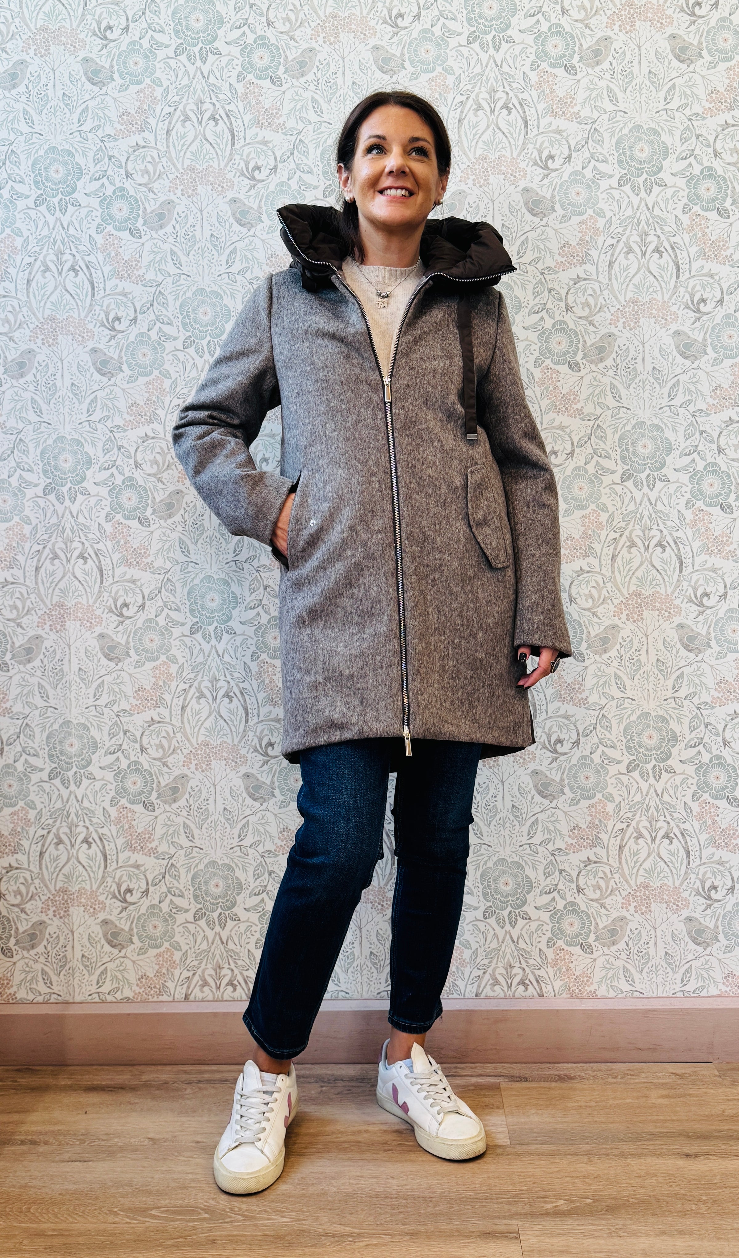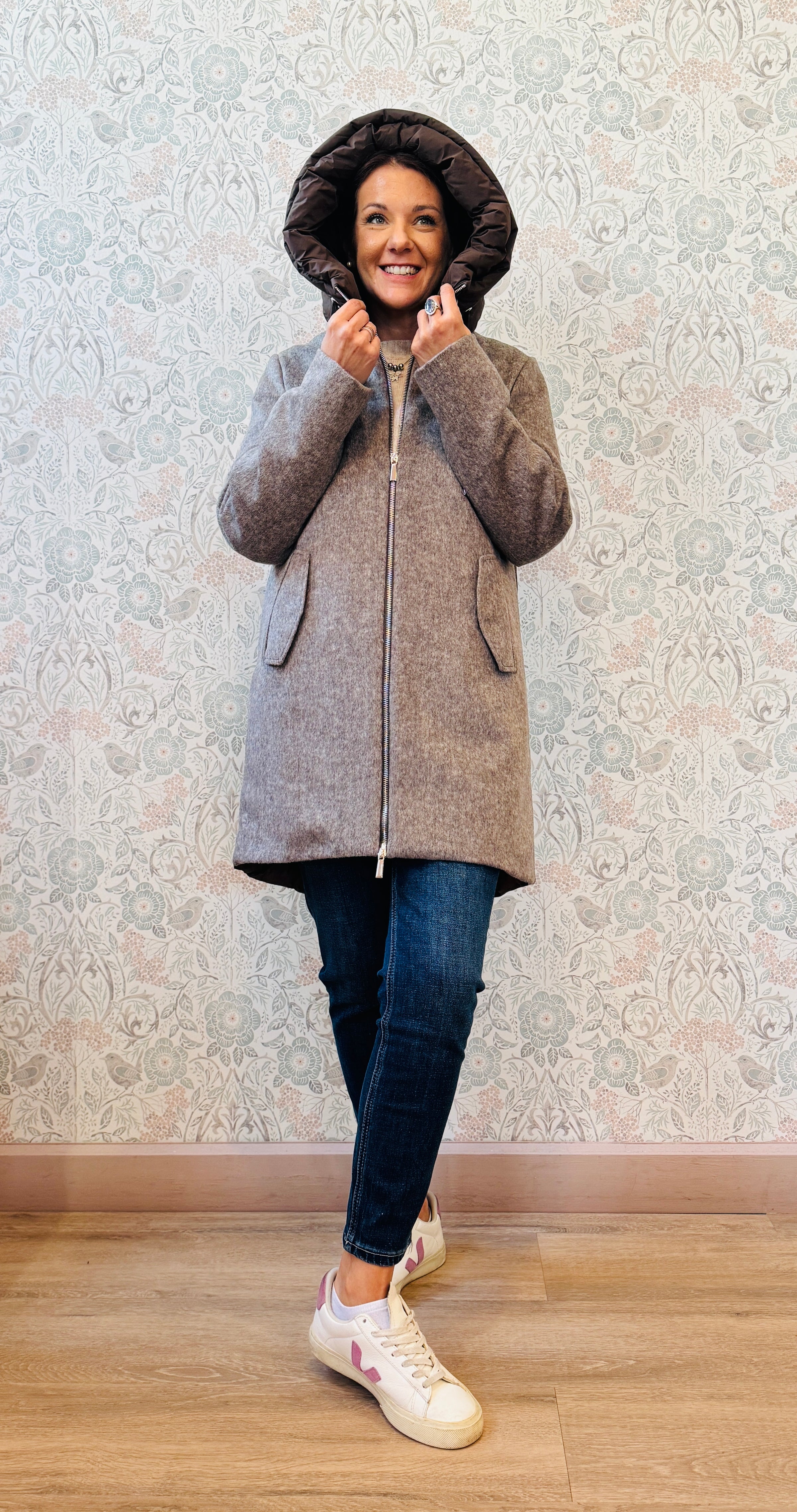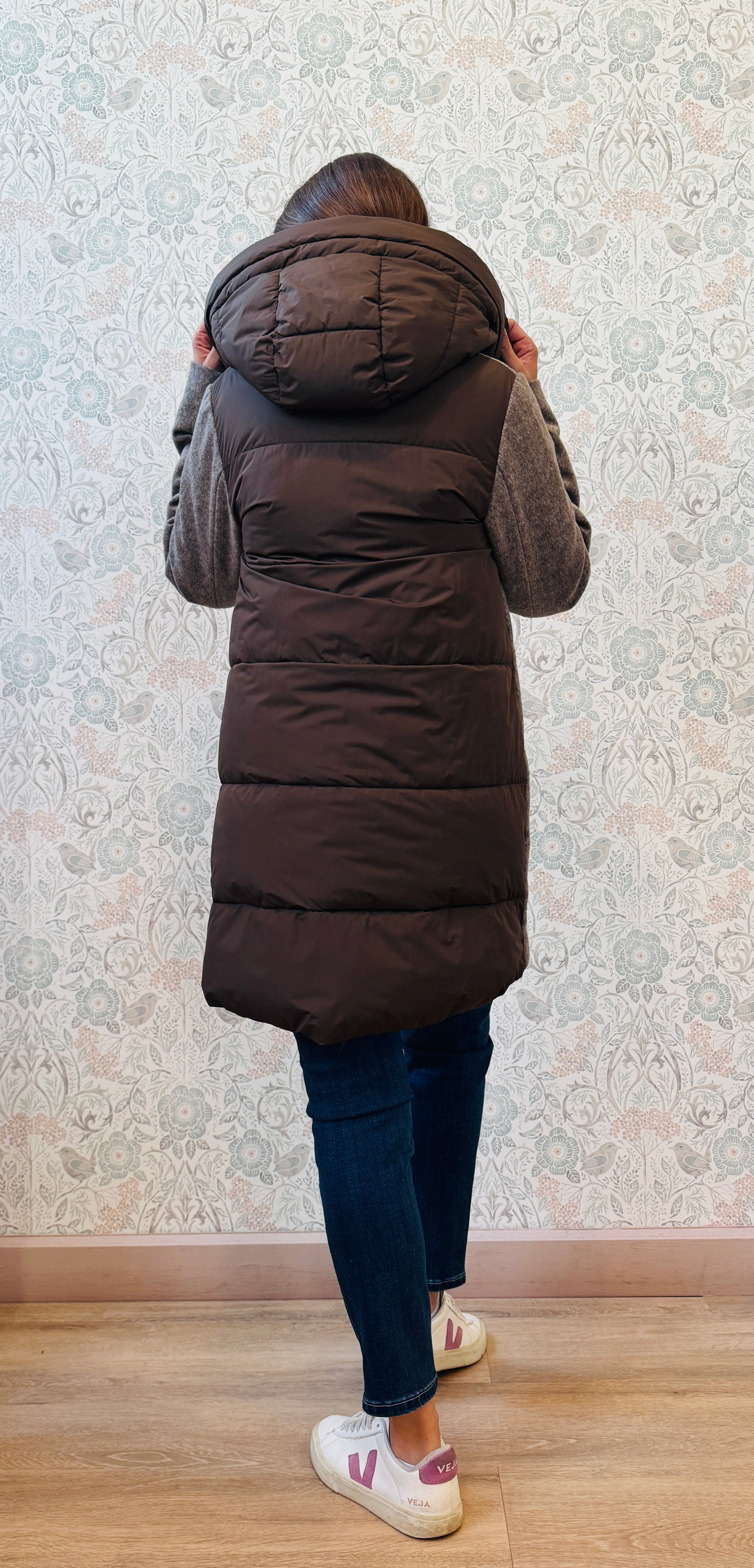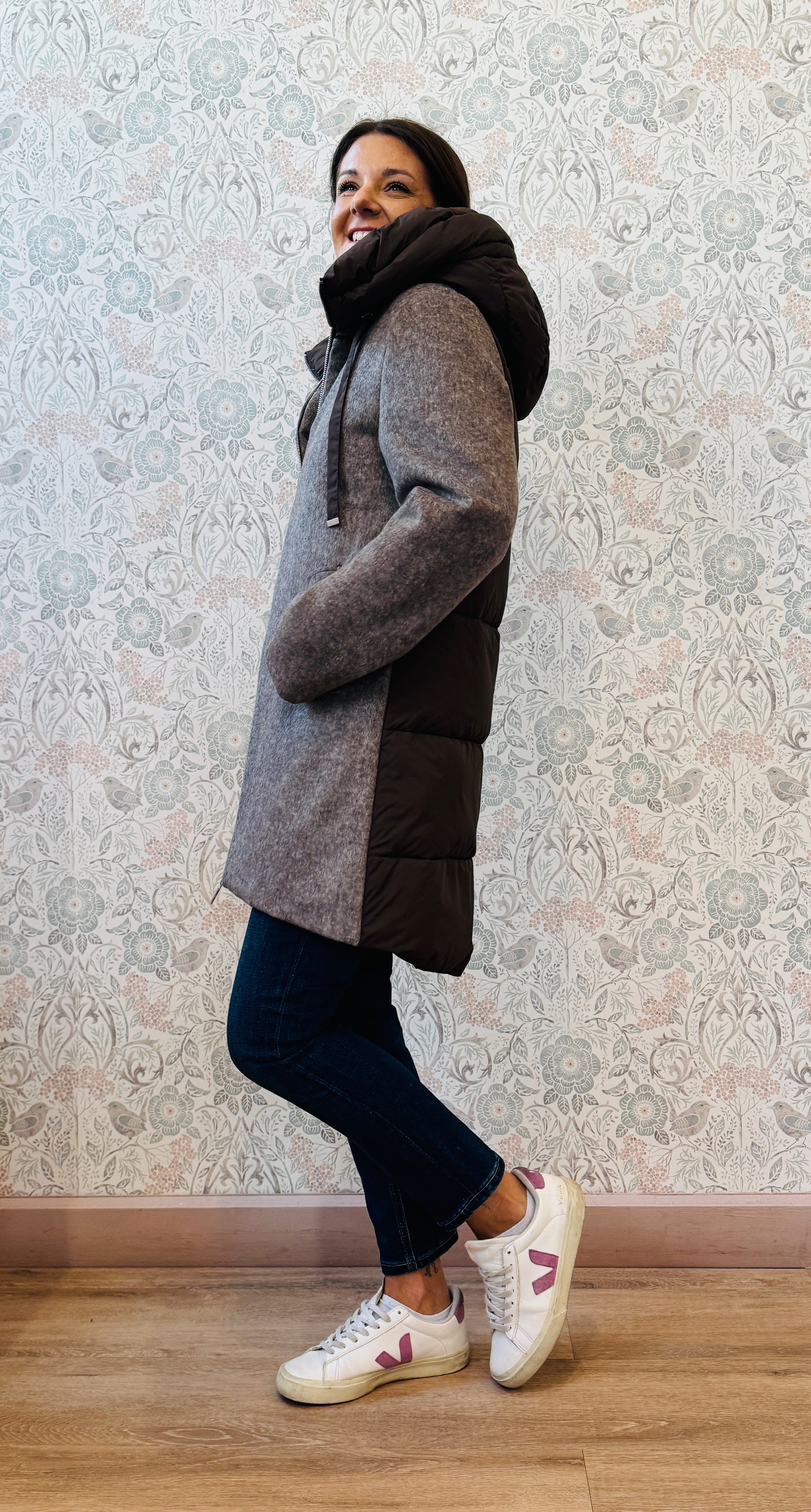 Giacca con chiusura zip e tasche sul davanti aperte e visibili, cappotto sul davanti color marrone melangè e piumino sul retro color marrone . Cappuccio e imbottitura interna.