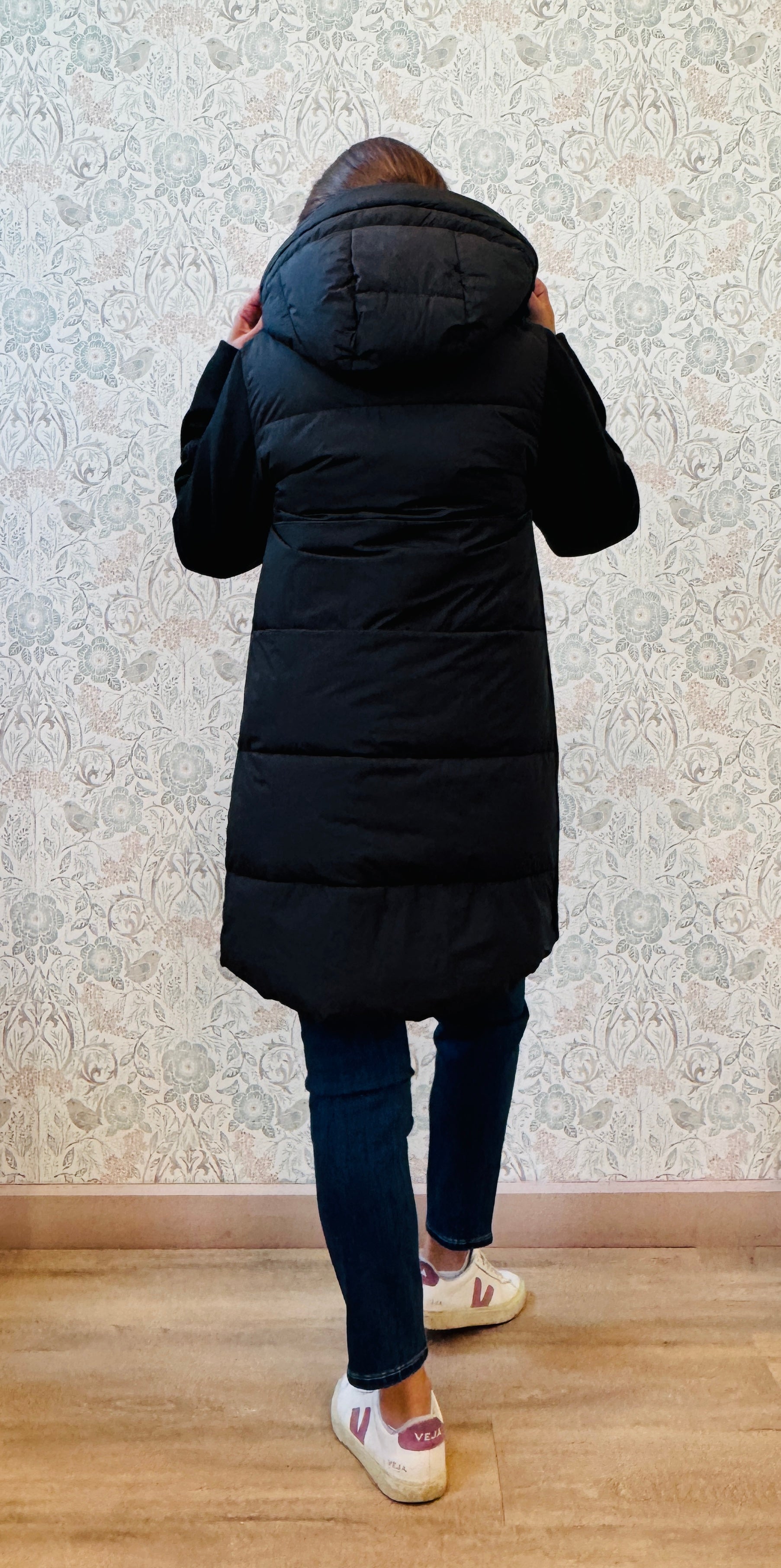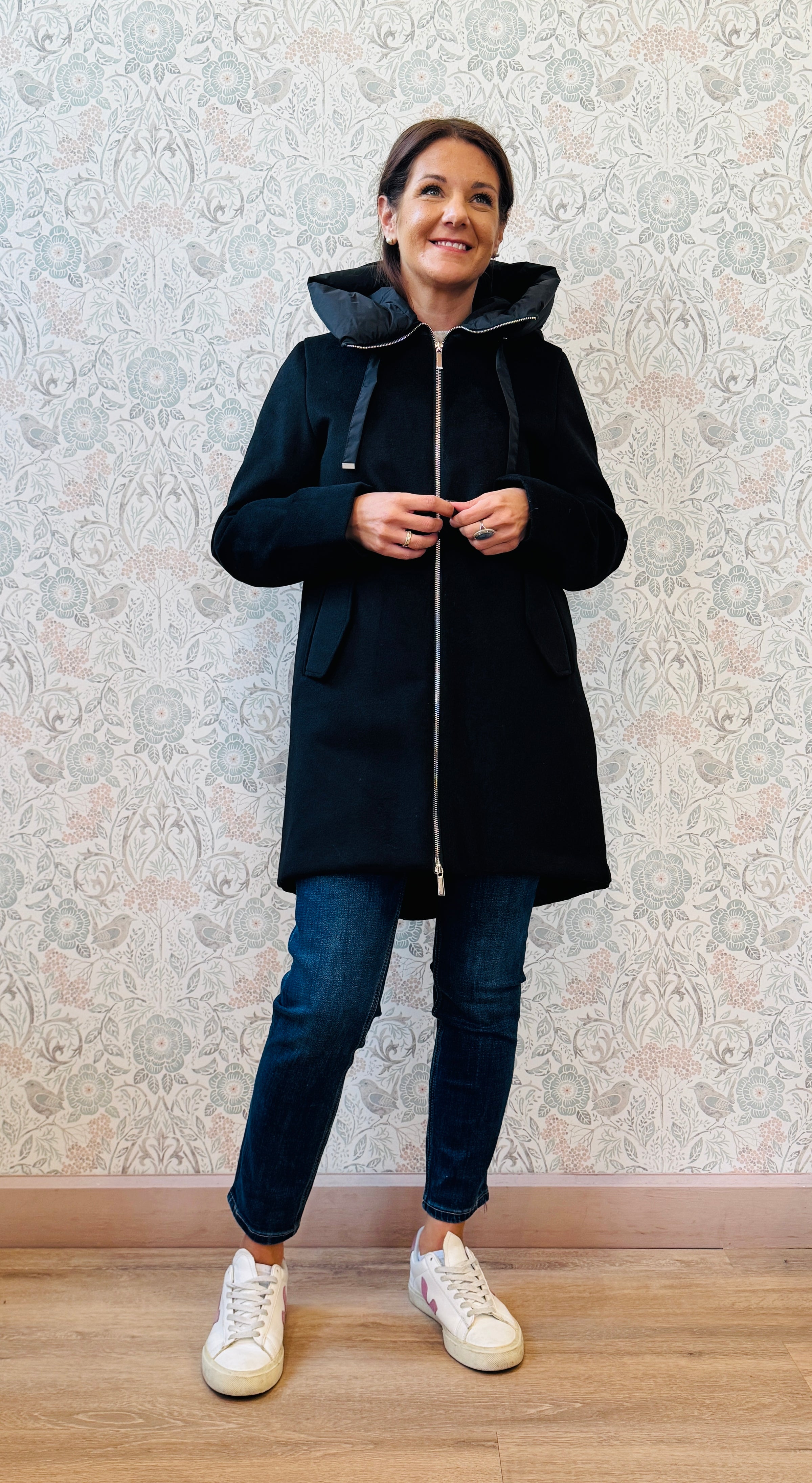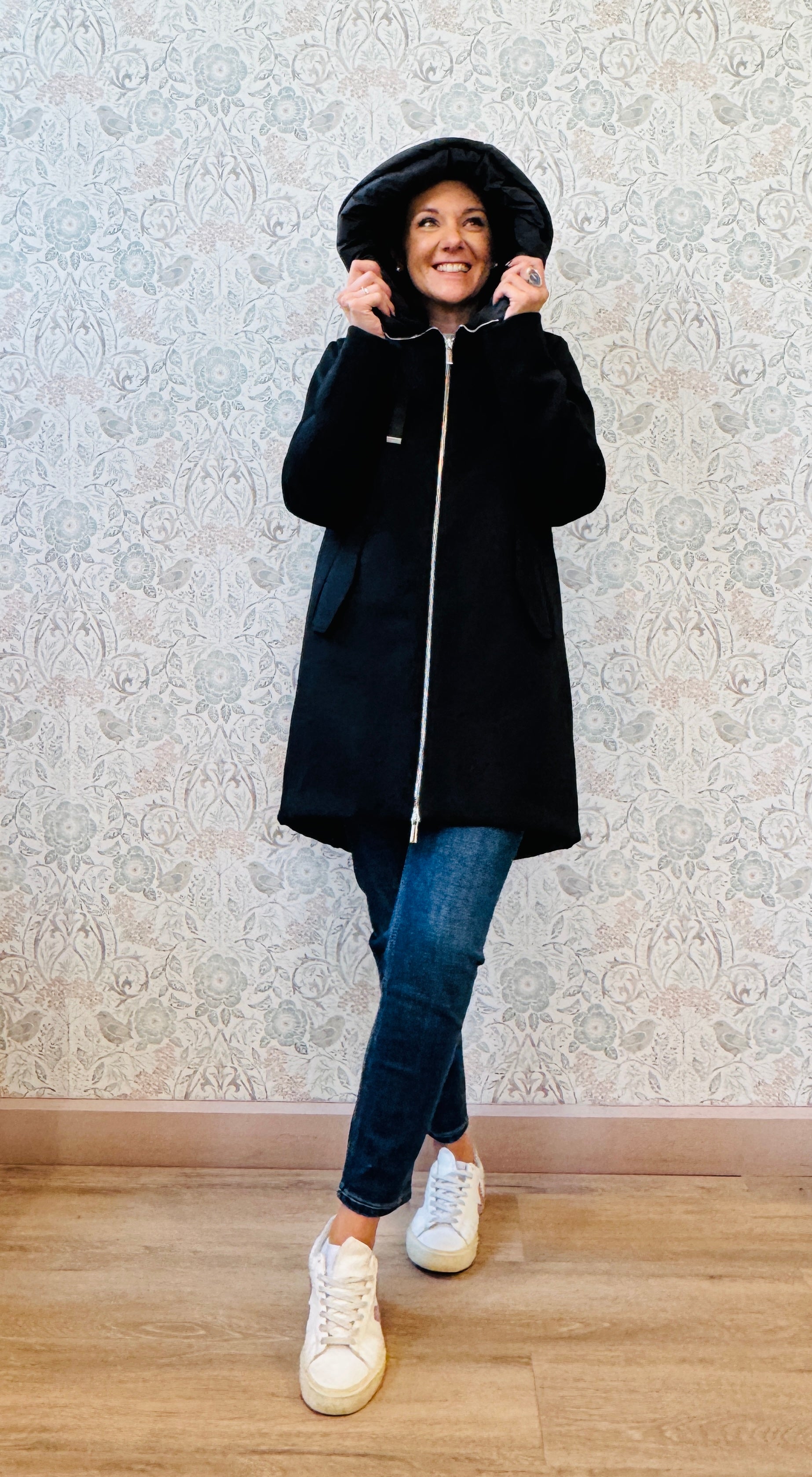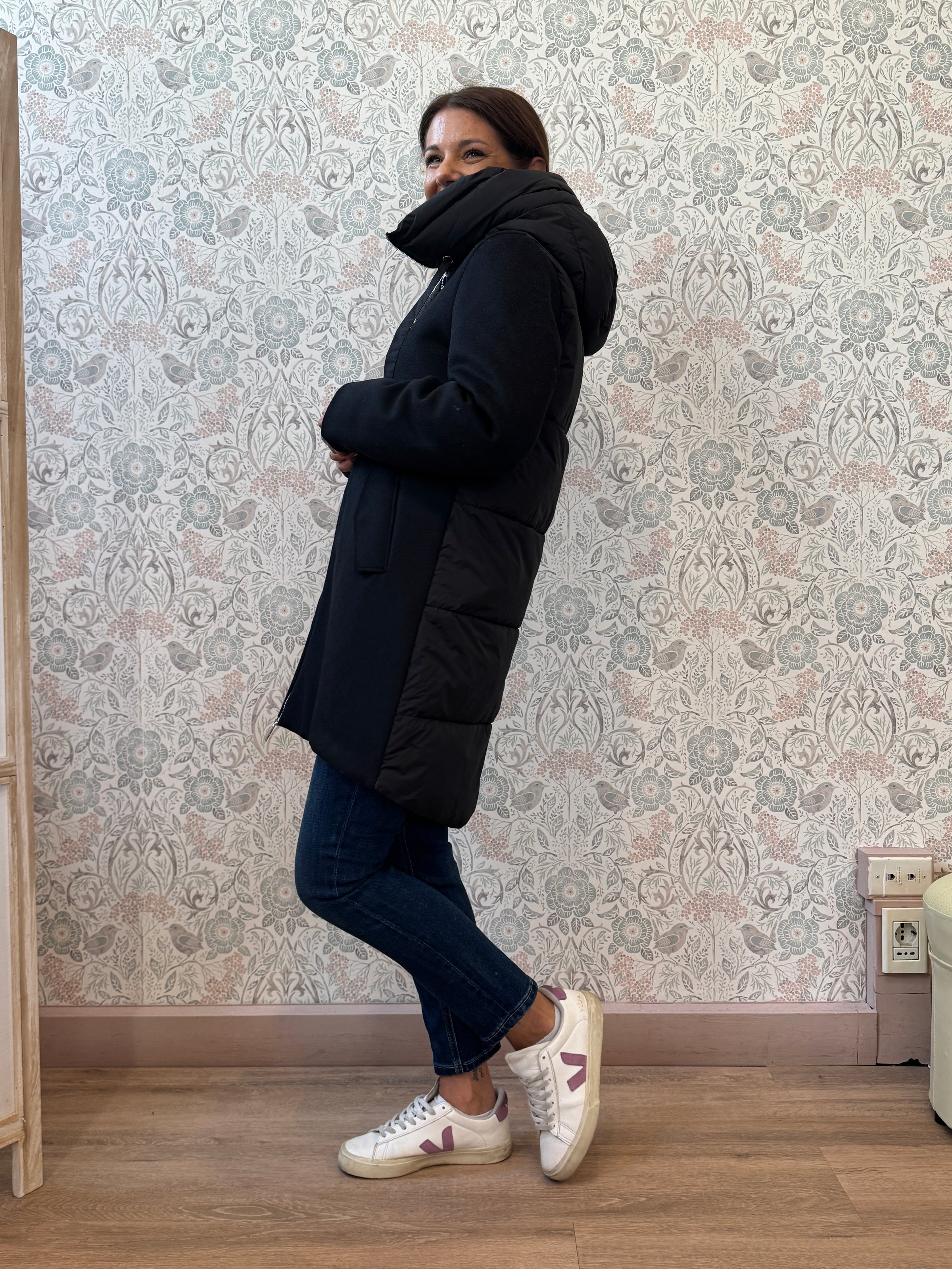Giacca con chiusura zip e tasche sul davanti aperte e visibili, cappotto sul davanti color nero e piumino sul retro color nero. Cappuccio e imbottitura interna.