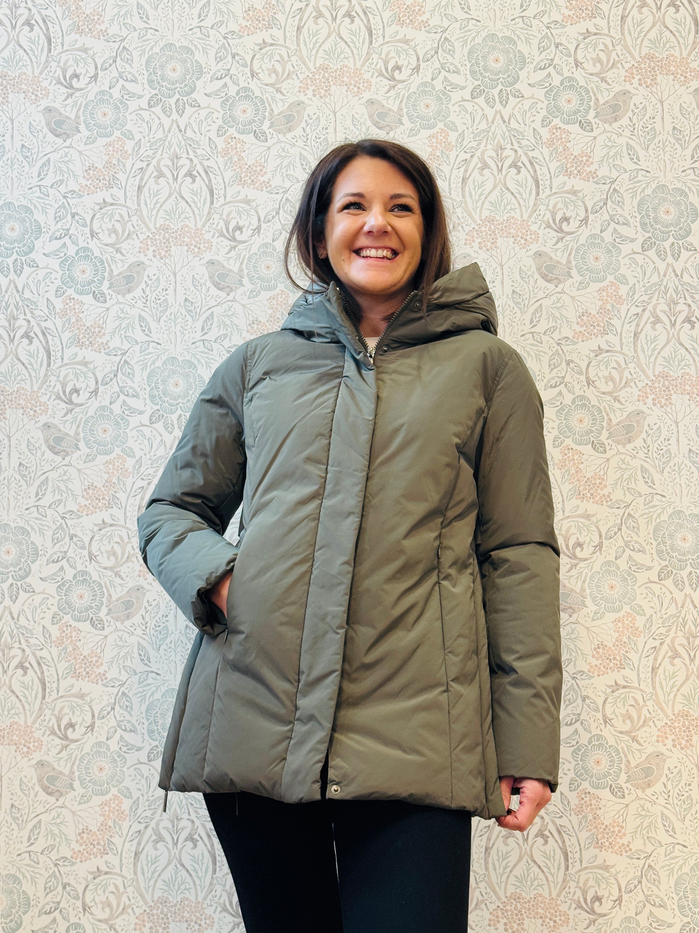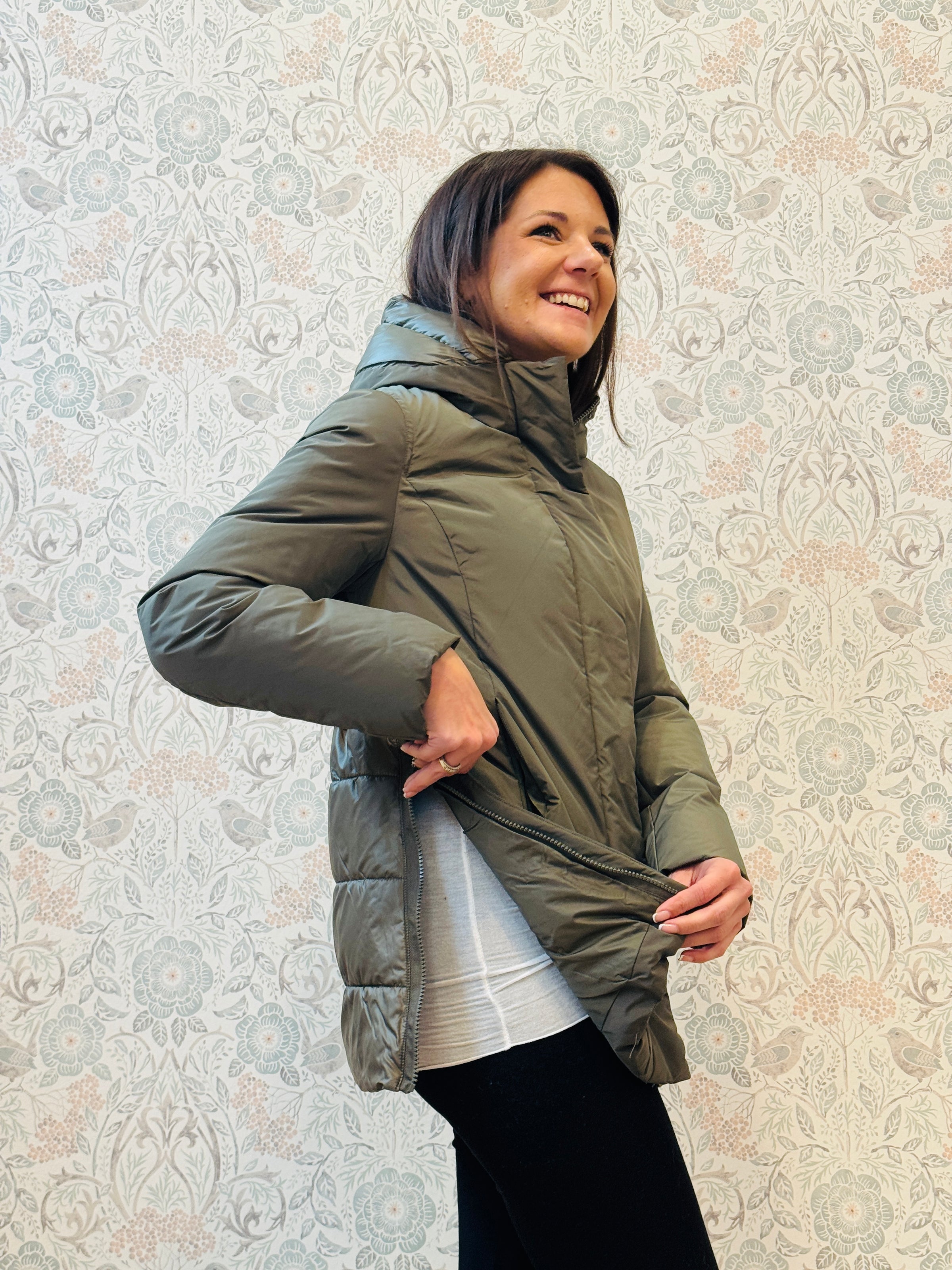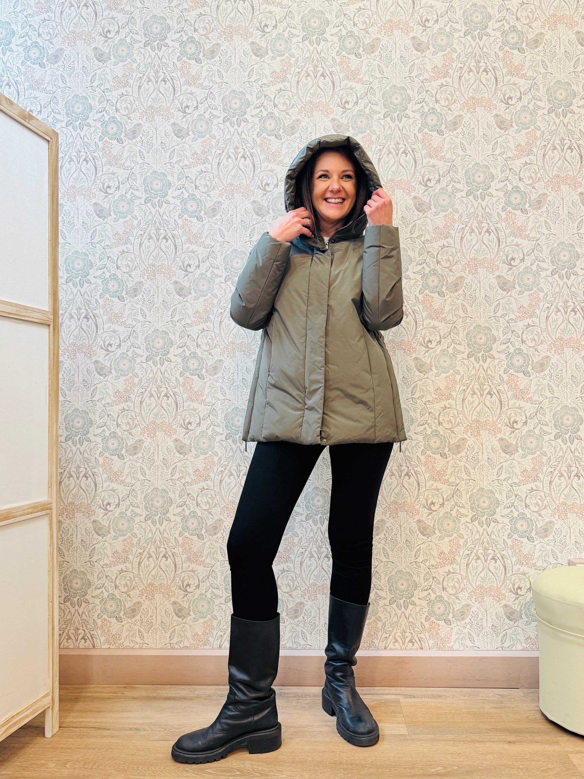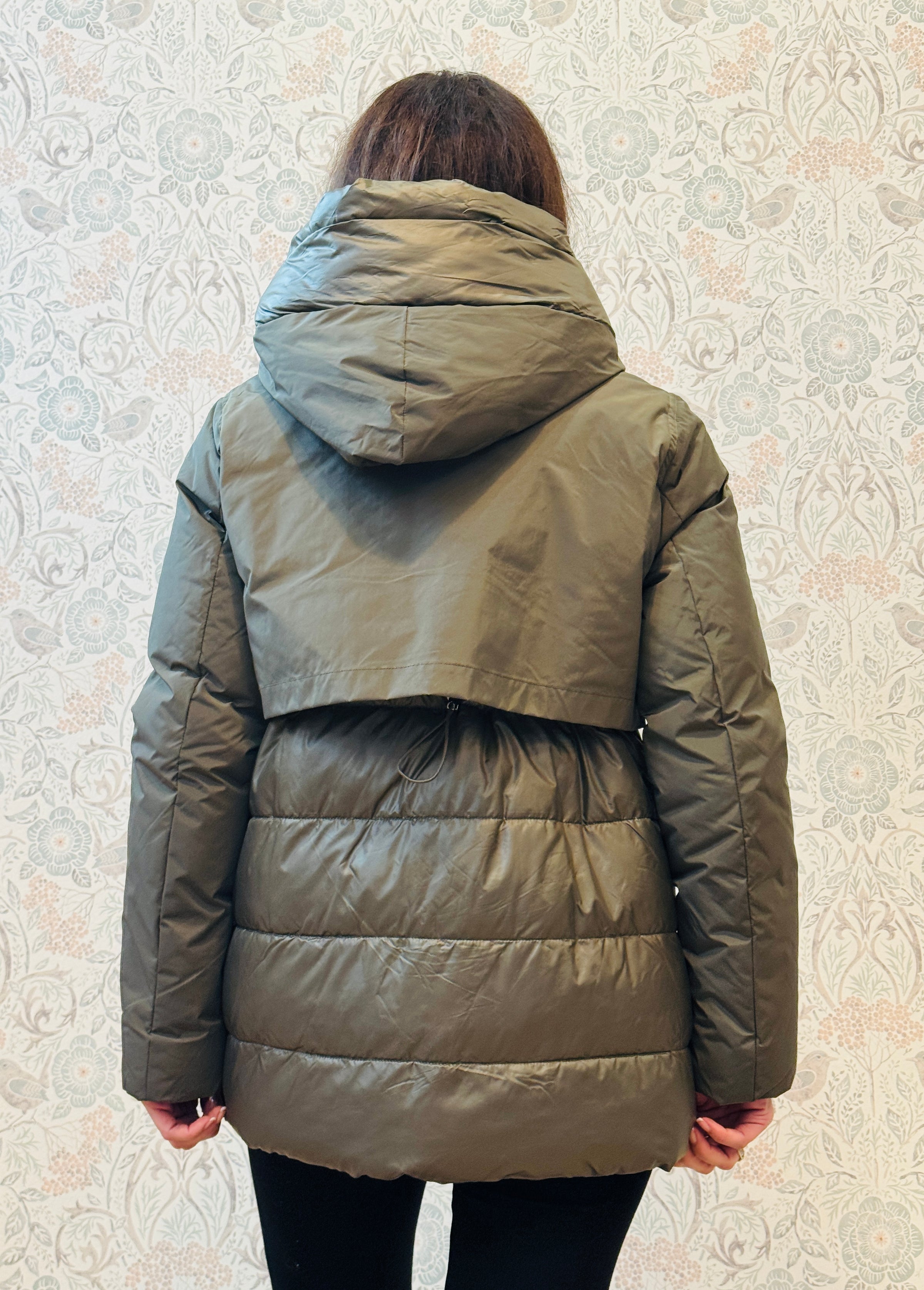 Giacca imbottita veder militare con cappuccio, chiusura con zip e bottoni a pressione, tasche laterali con zip. Apertura laterale con zip sui fianchi e elastico in vita da poter stringere.