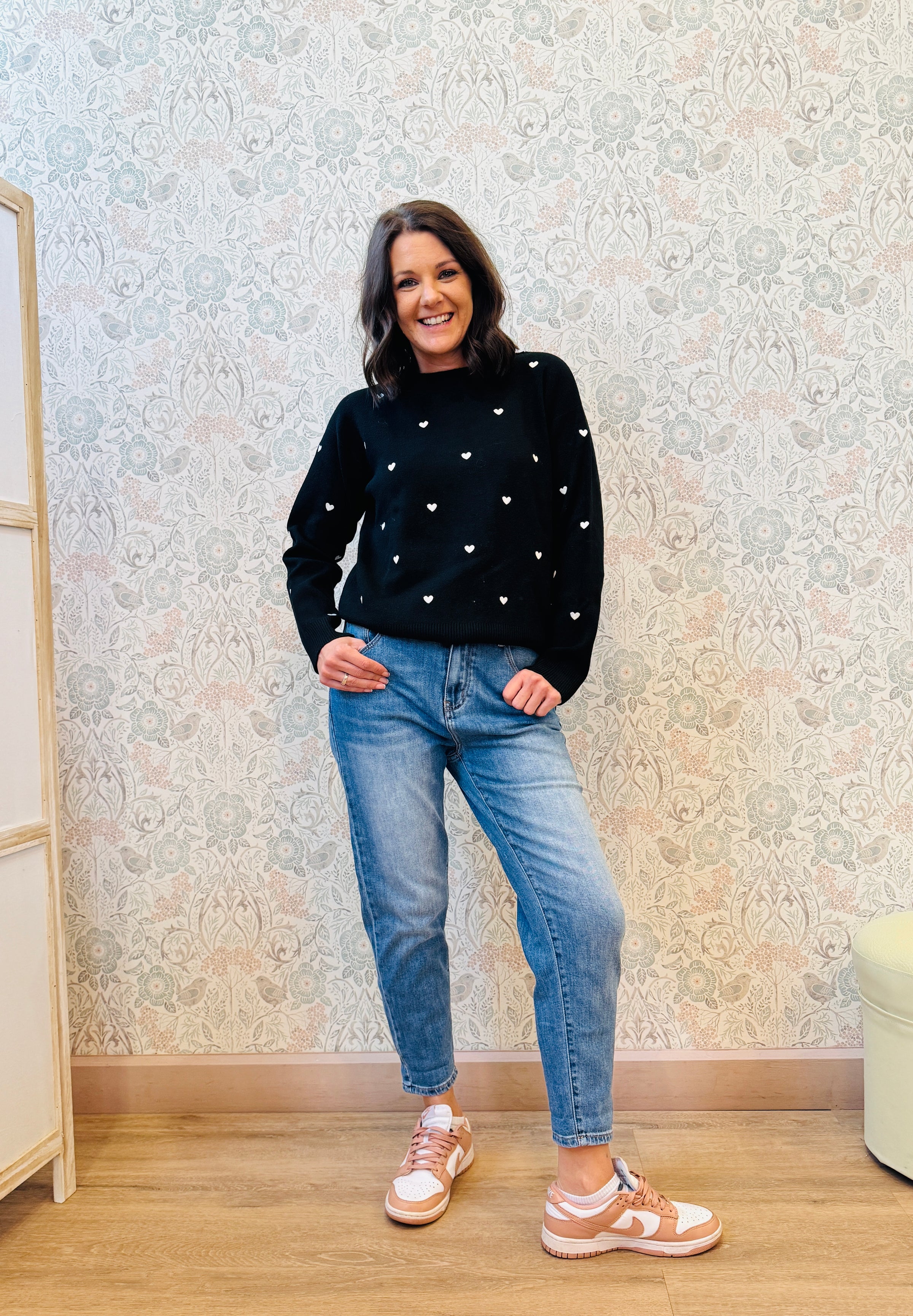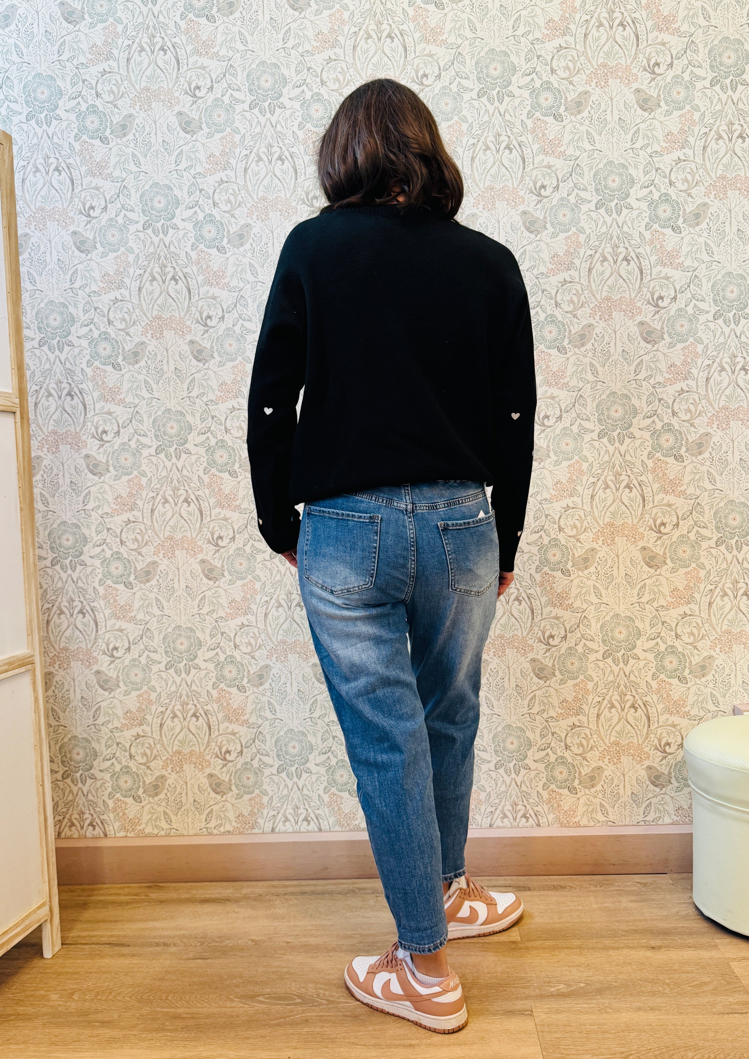 Maglione con collo tondo nero con cuoricini ricamati beige. Vestibilita' morbida e taglio leggermente svasato.