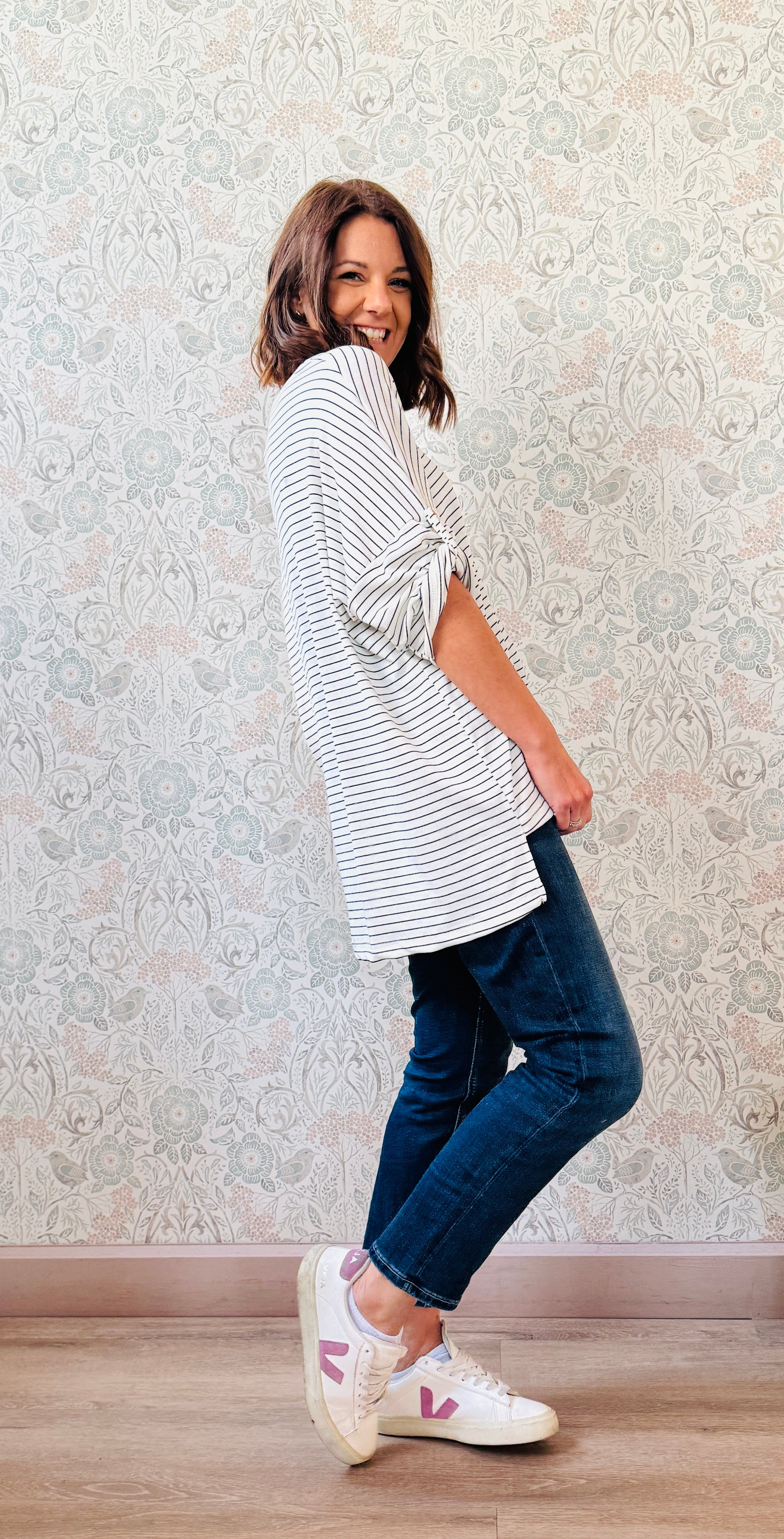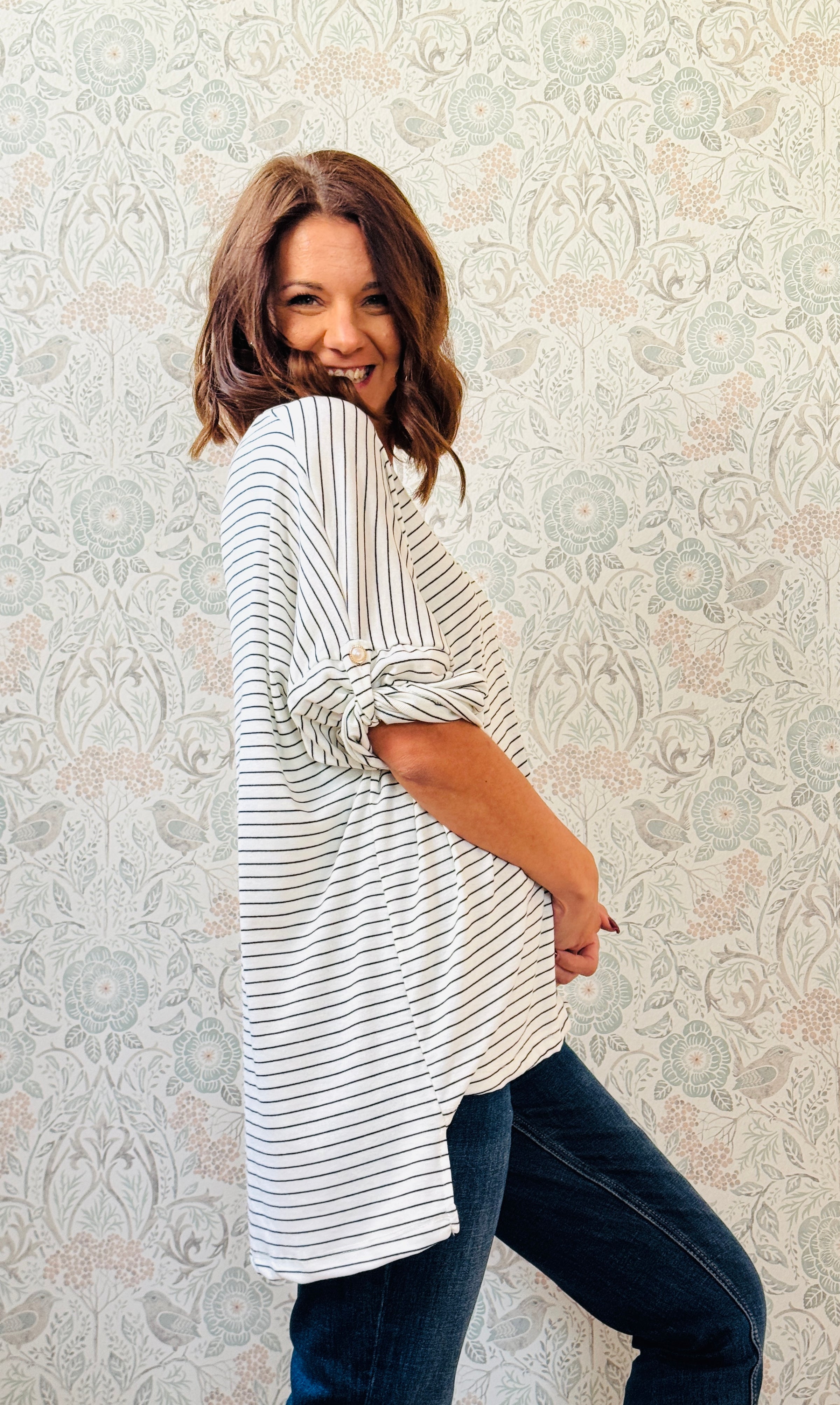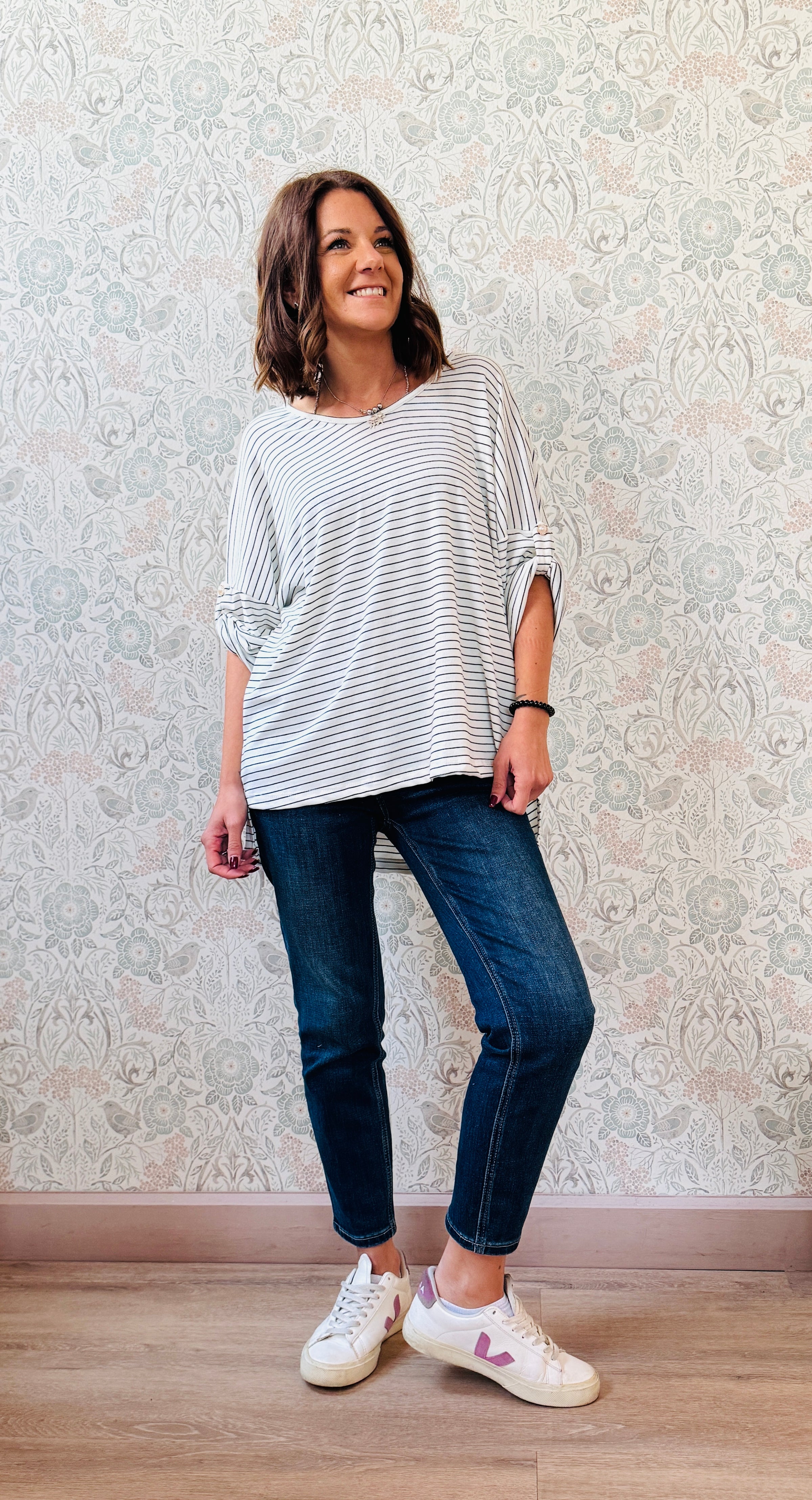T-shirt Manica Lunga color panna con righe sottili nere, con scollo a V con dettaglio perla sul risvolto della manica (risvolto removibile). Vestibilità molto ampia e morbida.