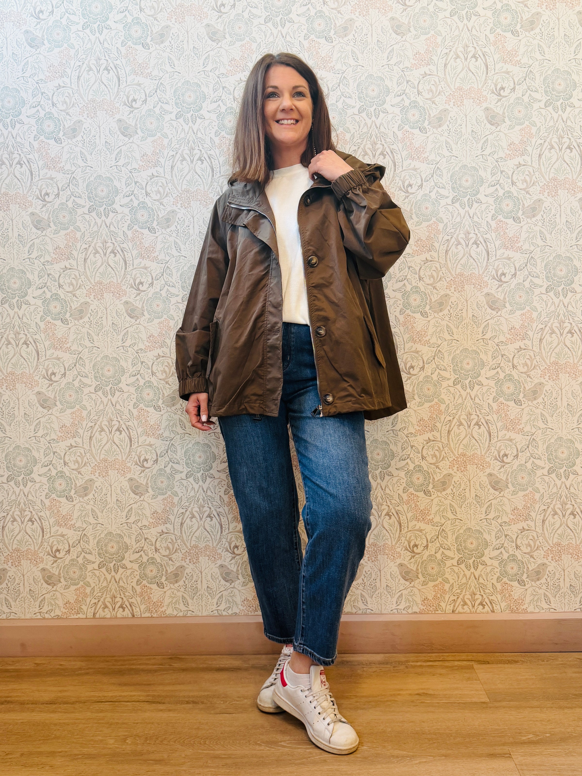 Trench con chiusura zip e chiusura con bottoni ad asola, tasche laterali aperte e visibili e cappuccio.