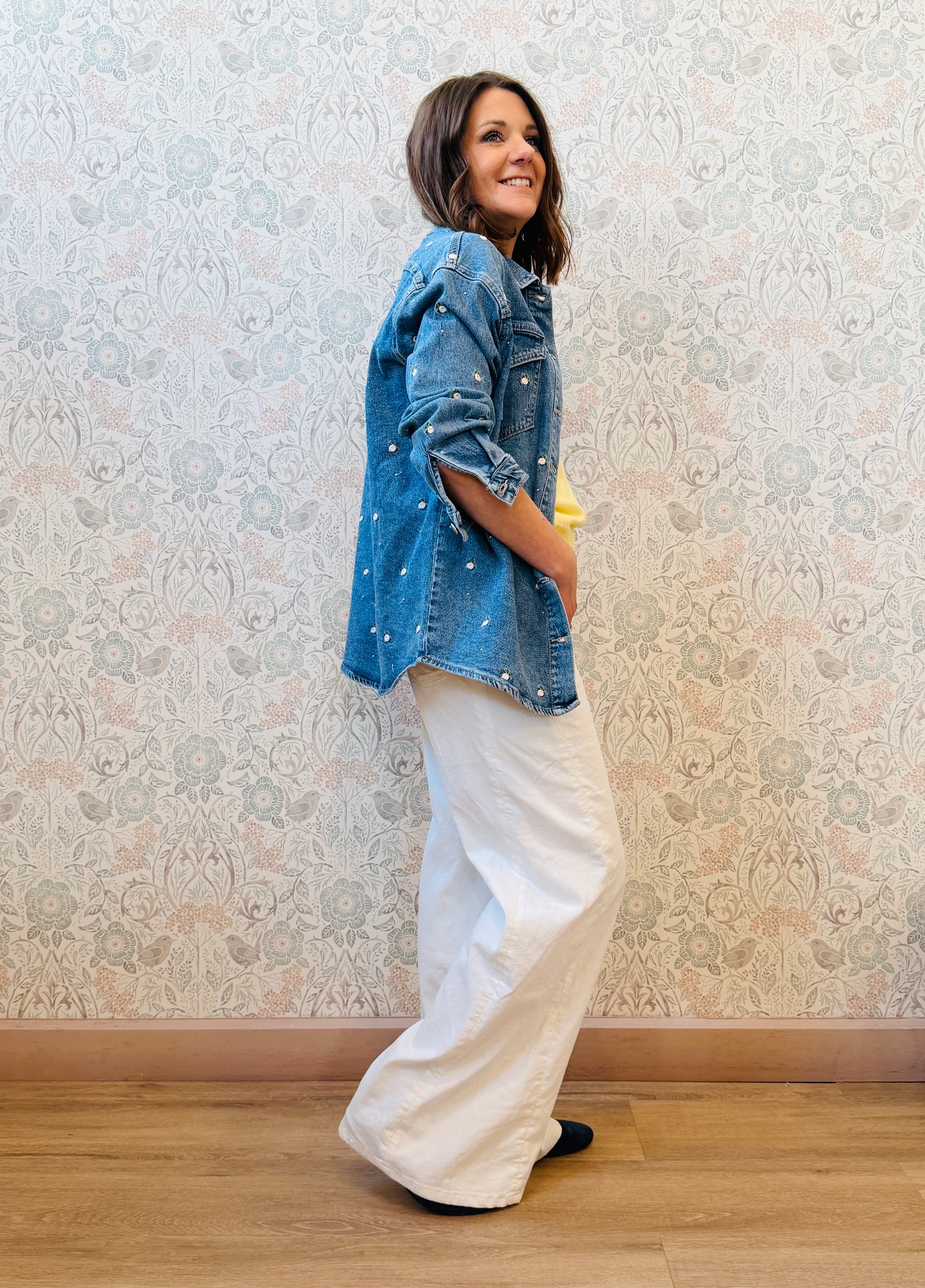 Giacca denim con tasche laterali aperte e visibili, roselline ricamate e vestibilita' over.