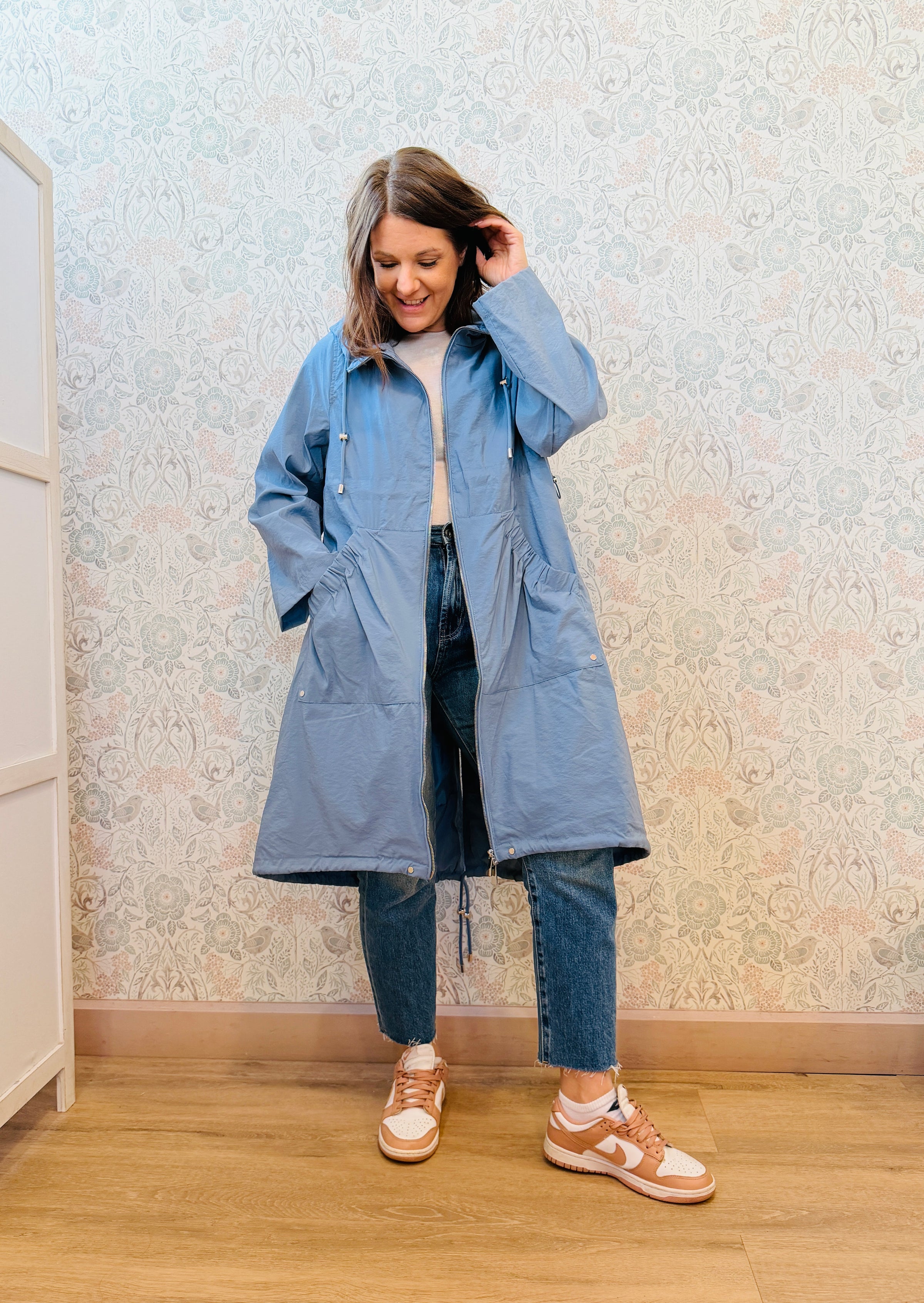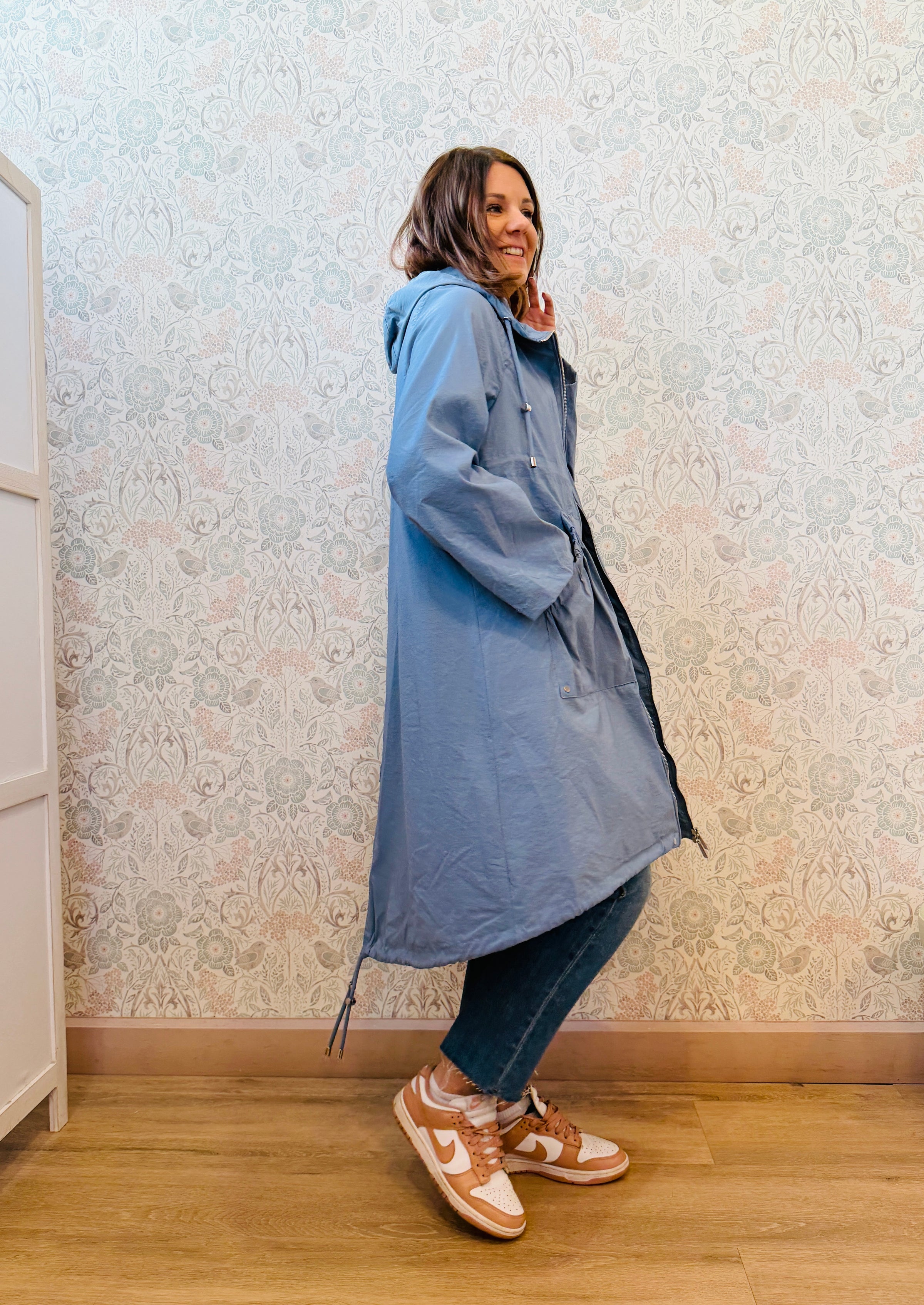 Giacca 100 grammi con cappuccio, chiusura zip, tasche laterali aperte e visibili e elastico in vita e sul bordo finale. Vestibilita' ampia e comoda, fit over.