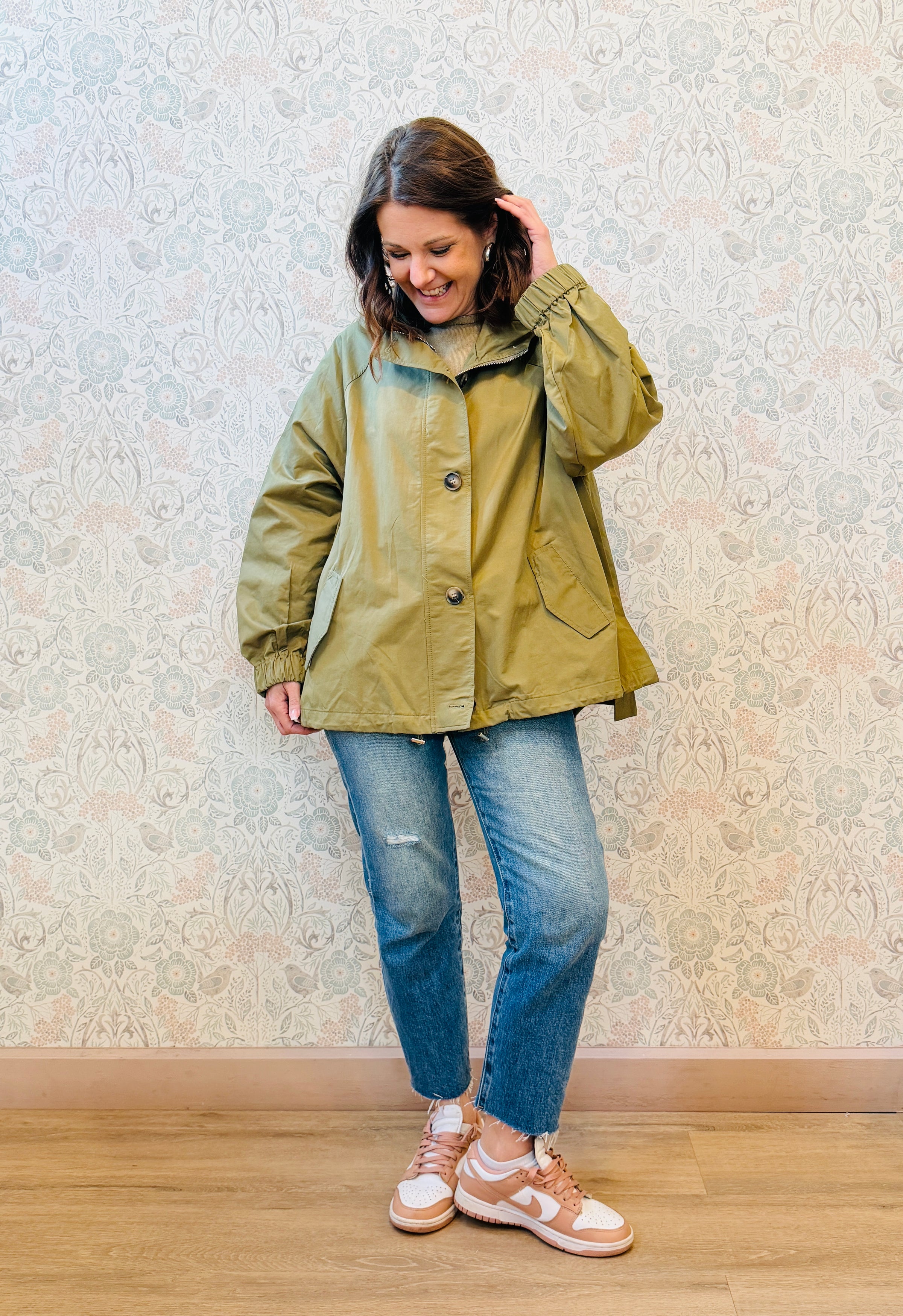 Trench con chiusura zip e chiusura con bottoni ad asola, tasche laterali aperte e visibili e cappuccio.