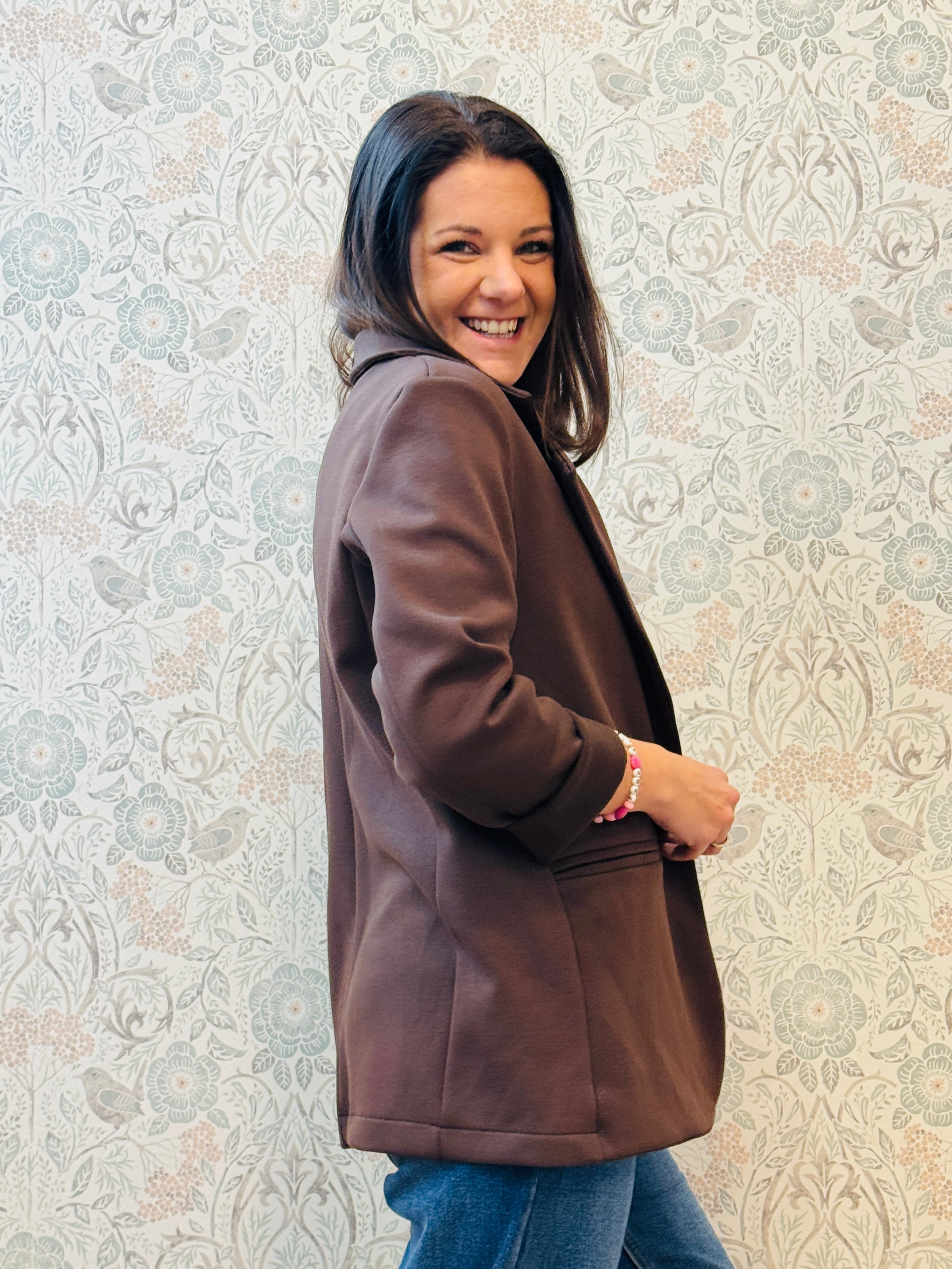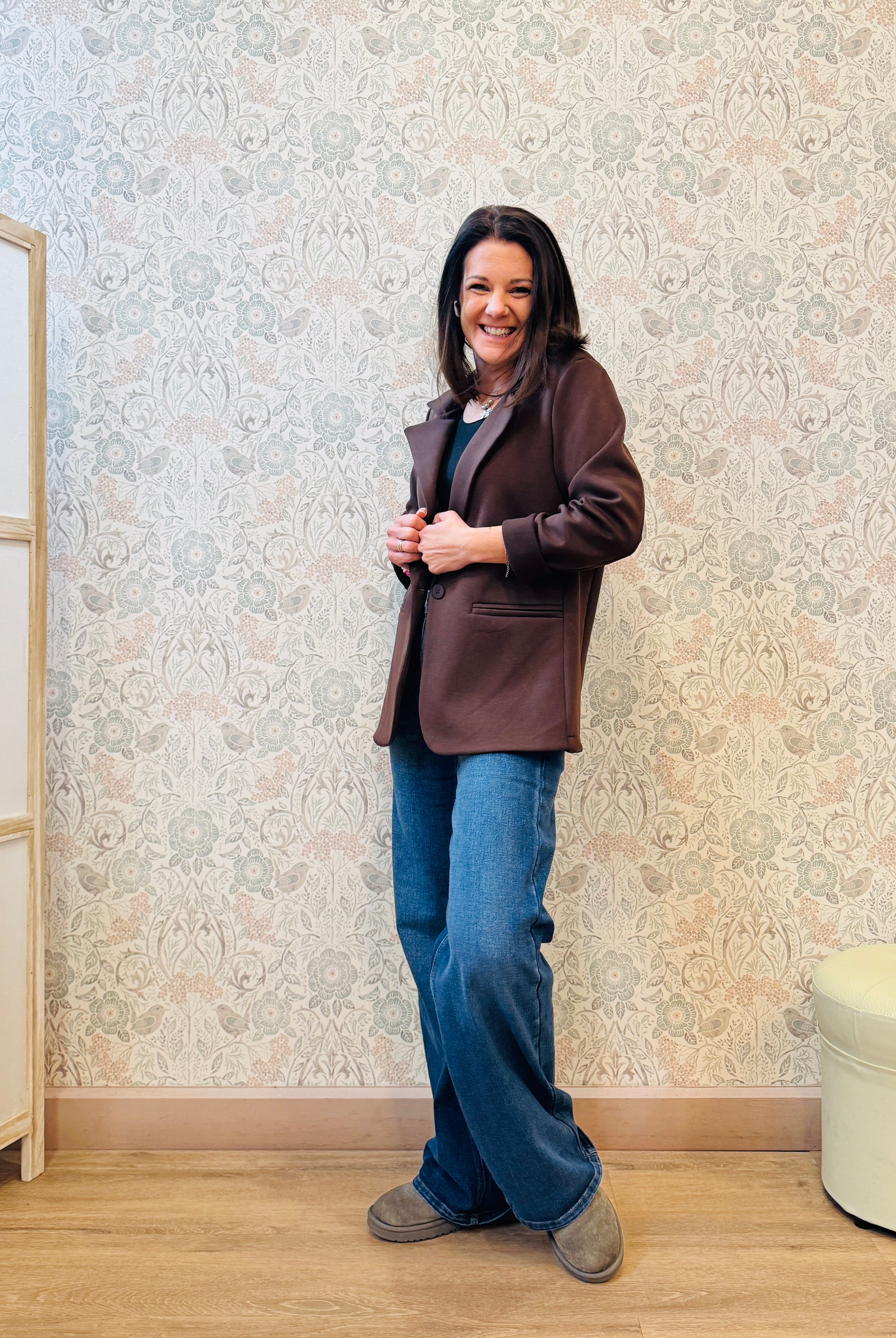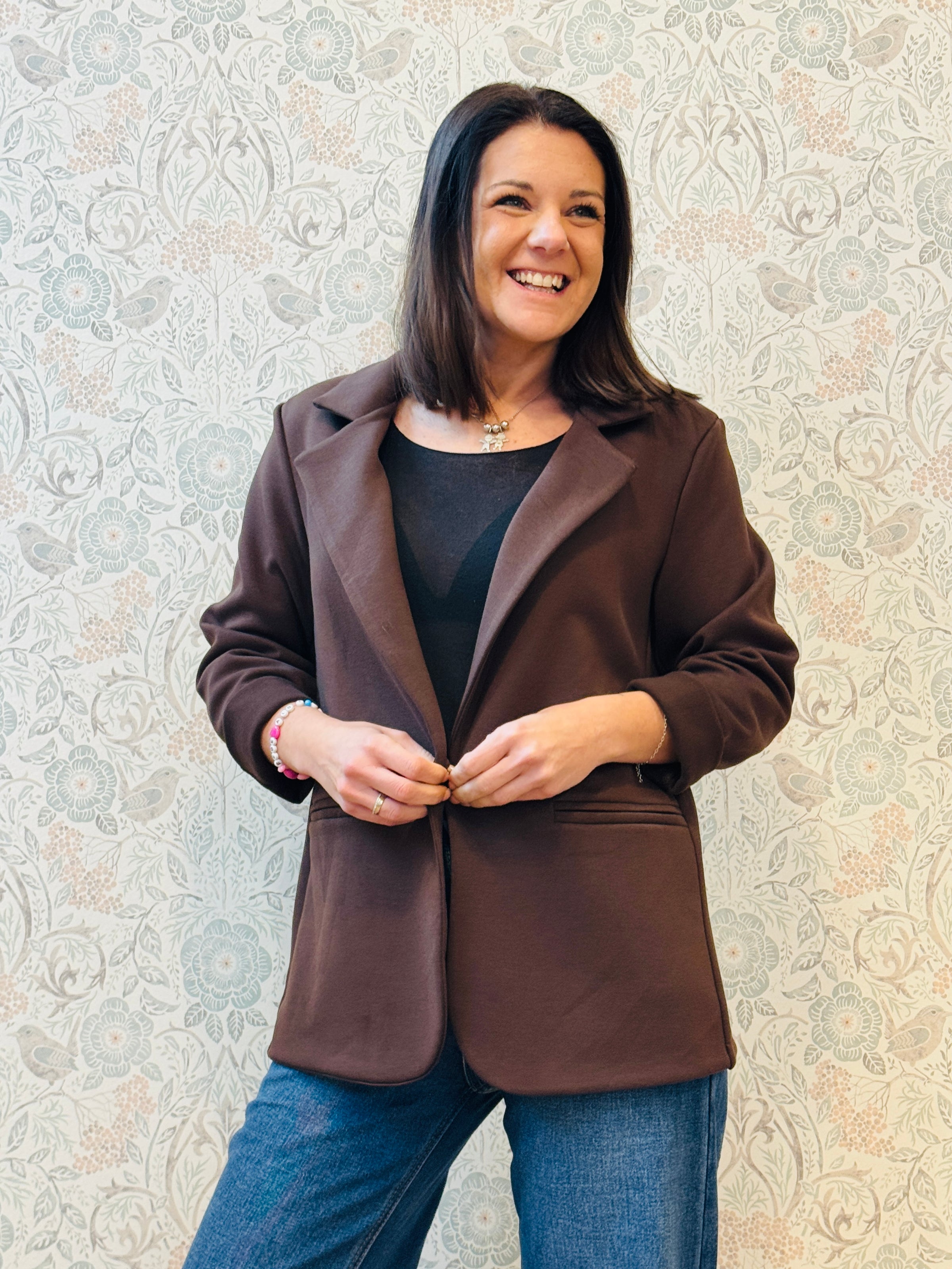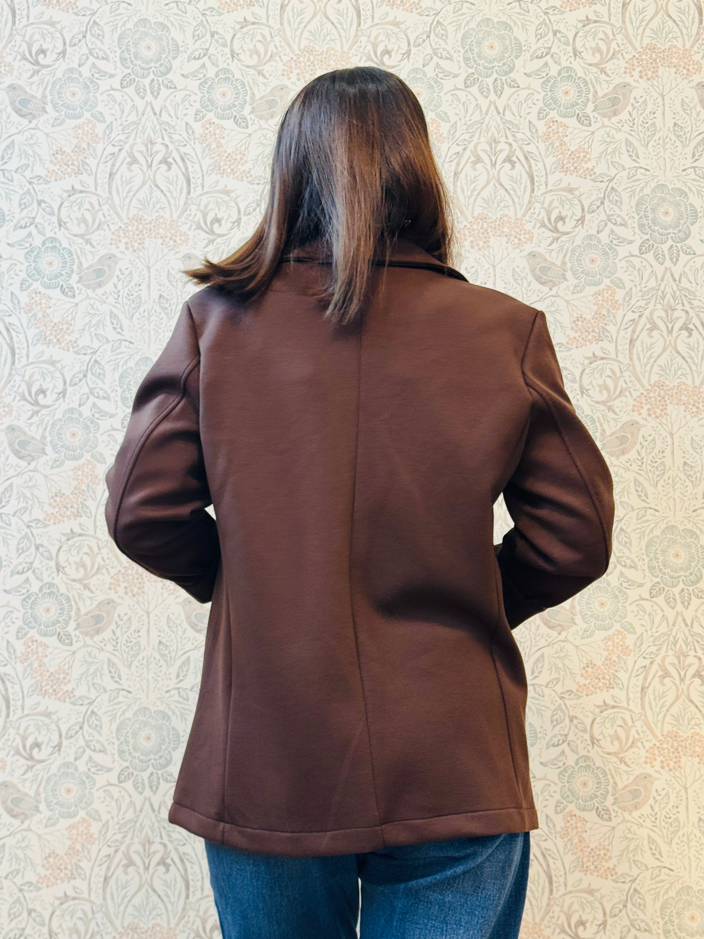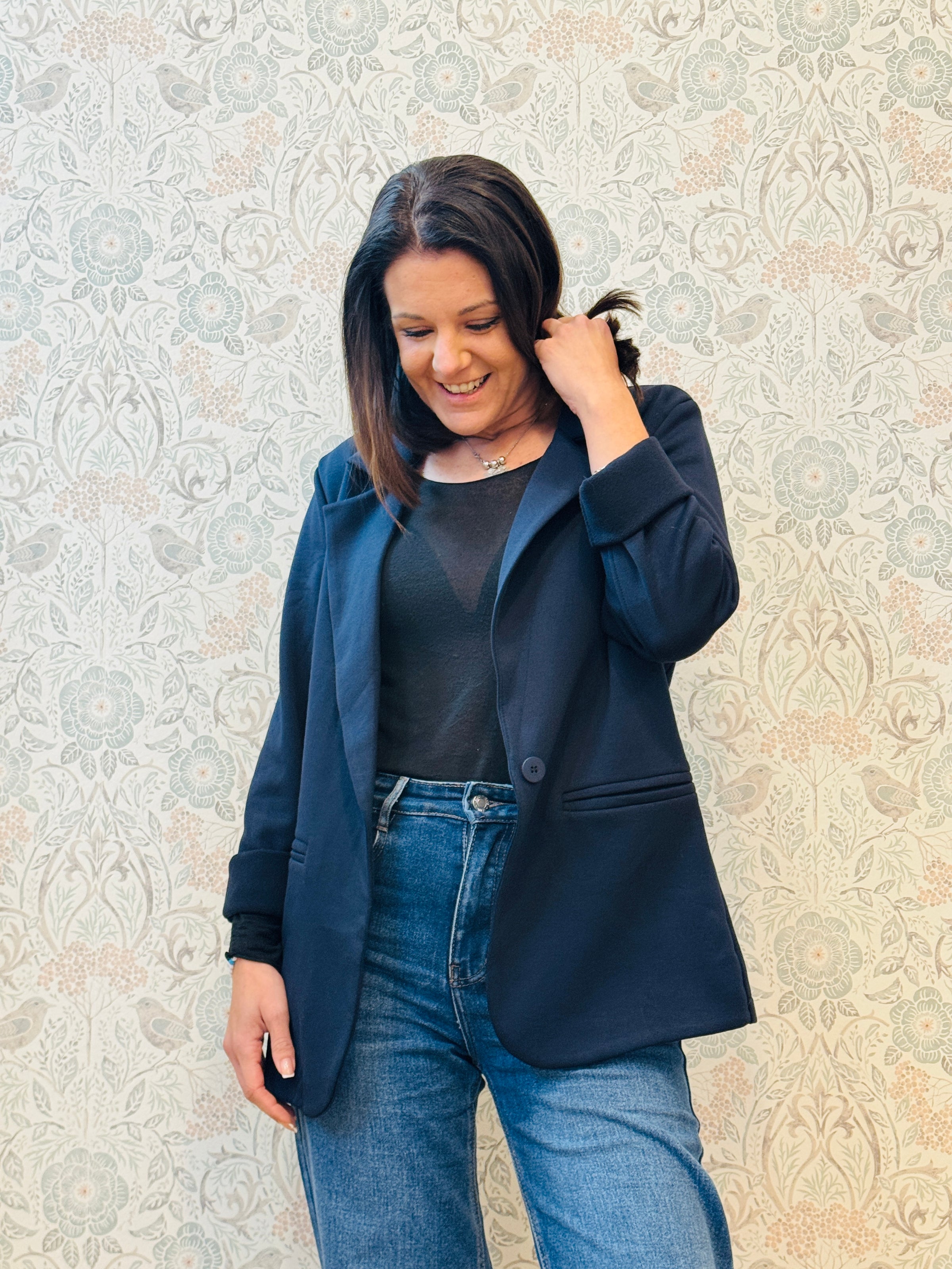 Blazer in felpa dal taglio classico con chiusura ad unico bottone ad asola e tasche laterali decorative.