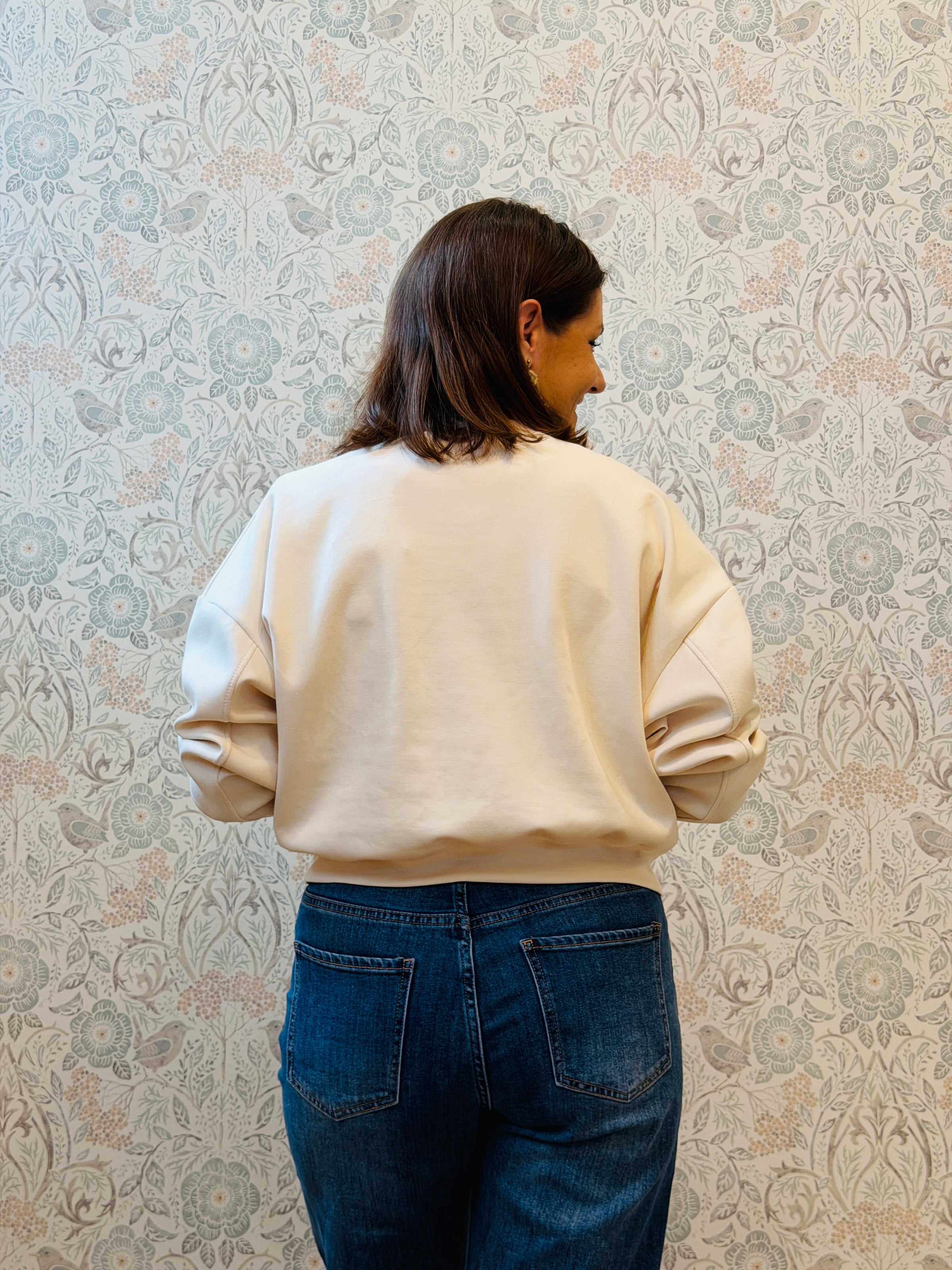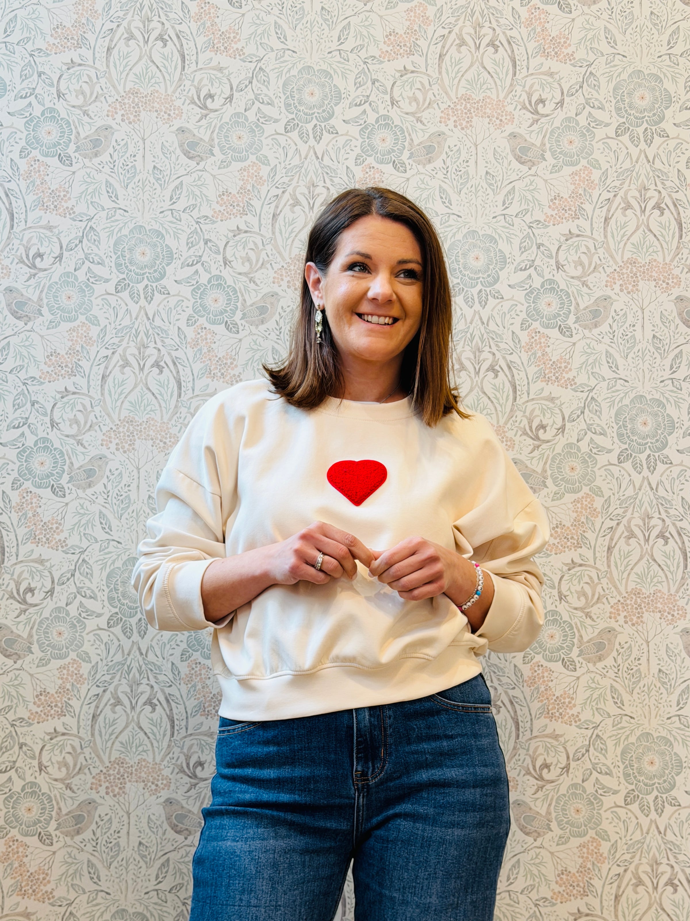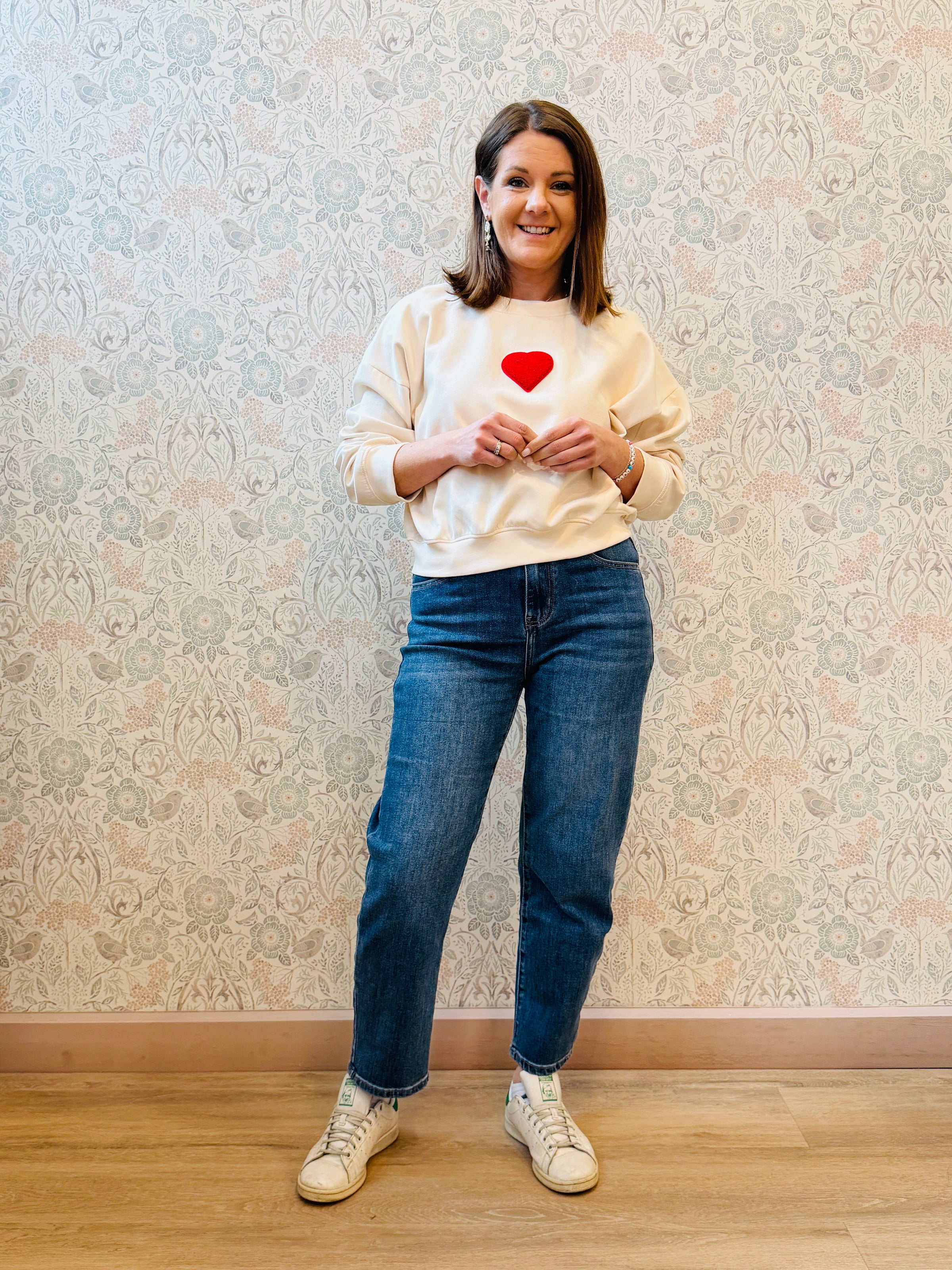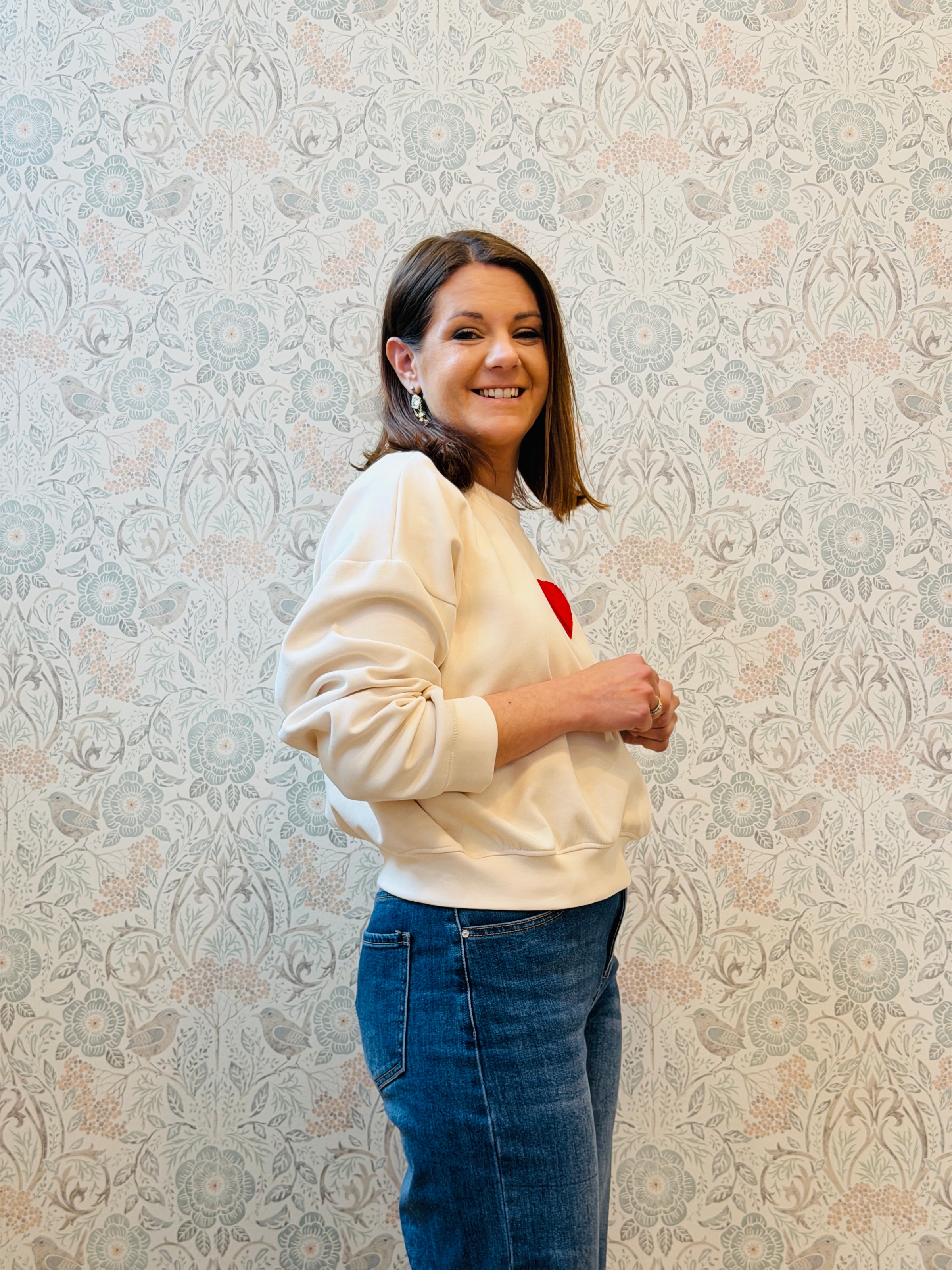 Felpa con scollo tondo color panna a manica lunga con bordi arricciati. Cuore rosso centrale cucito.