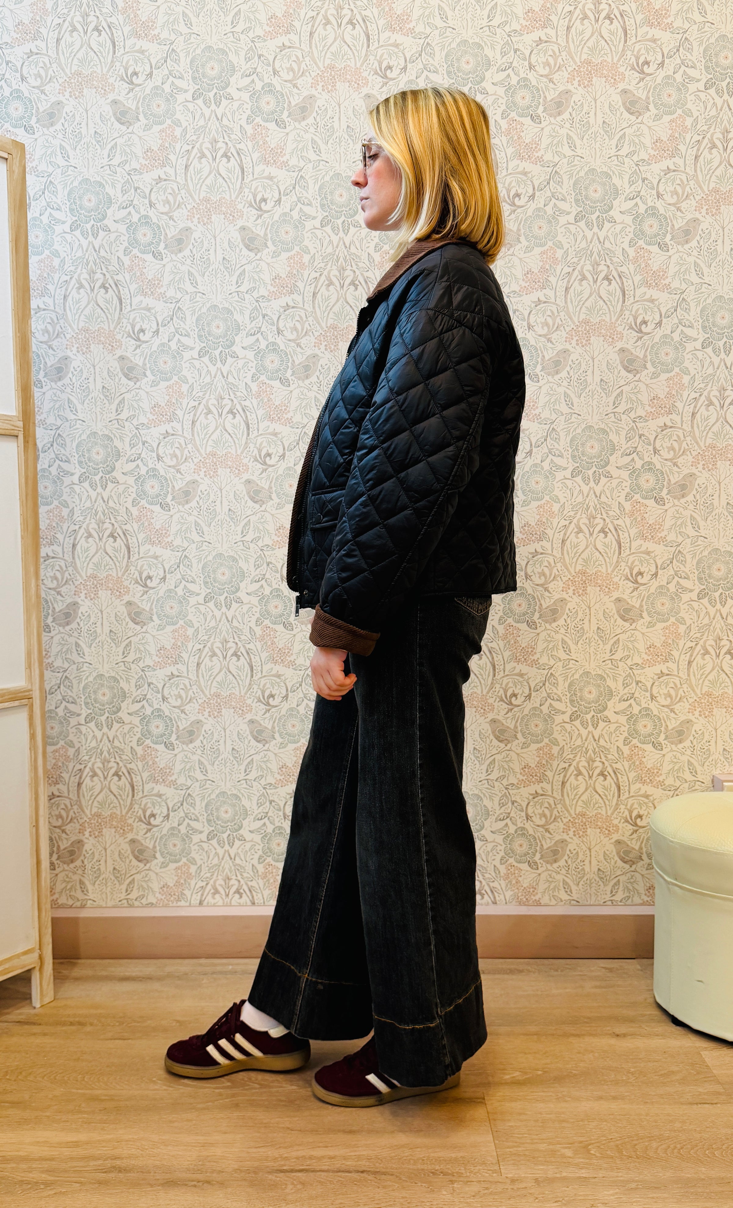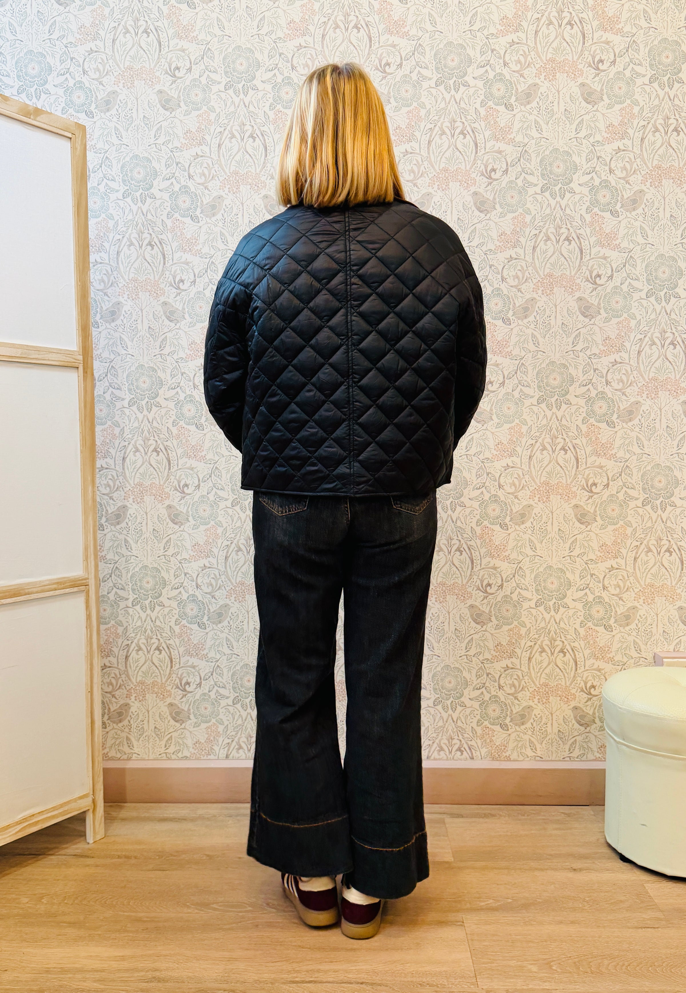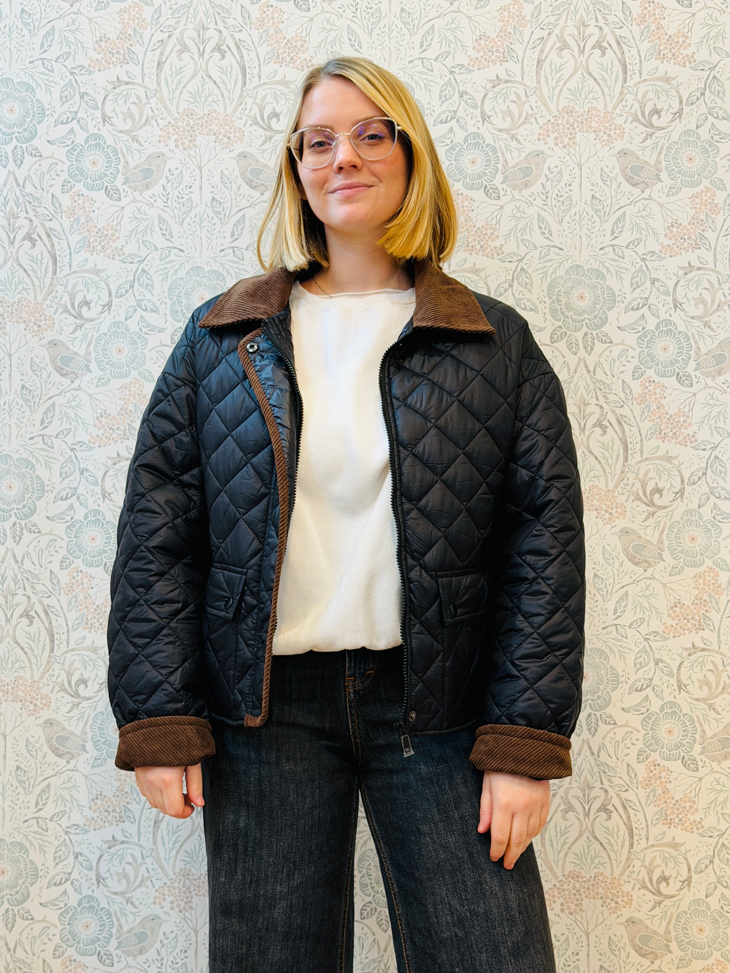 Giacca in tessuto quilted con colletto in velluto, bottoni a pressione con tasche a vista aperte con bottoni a pressione.