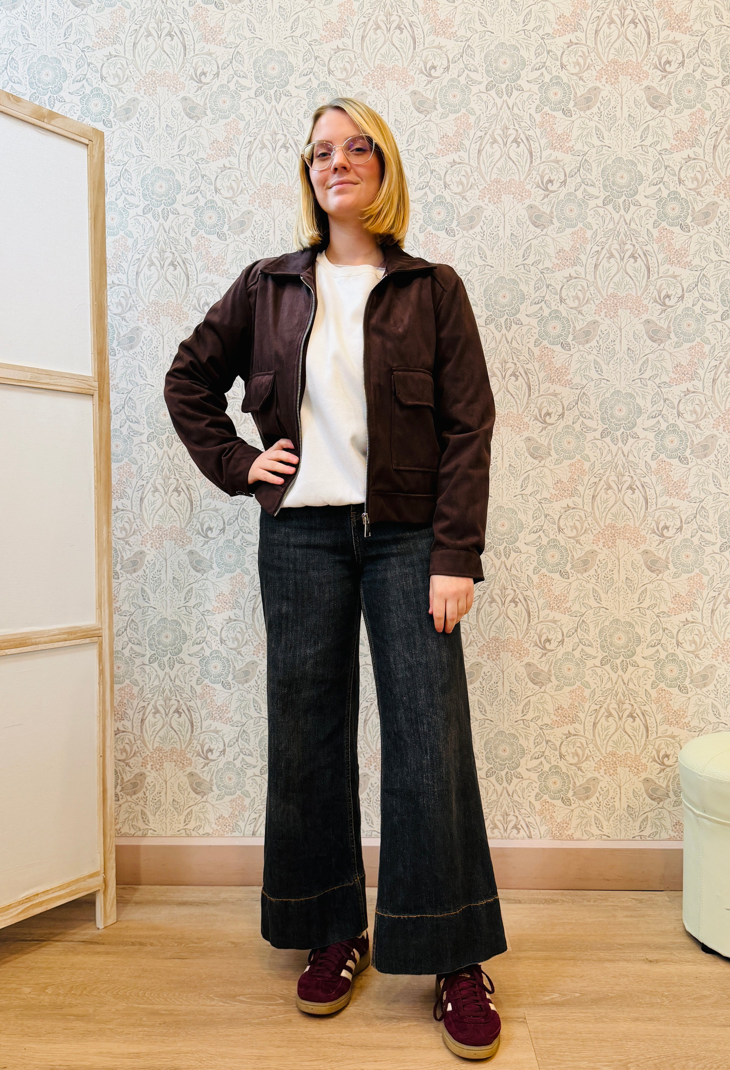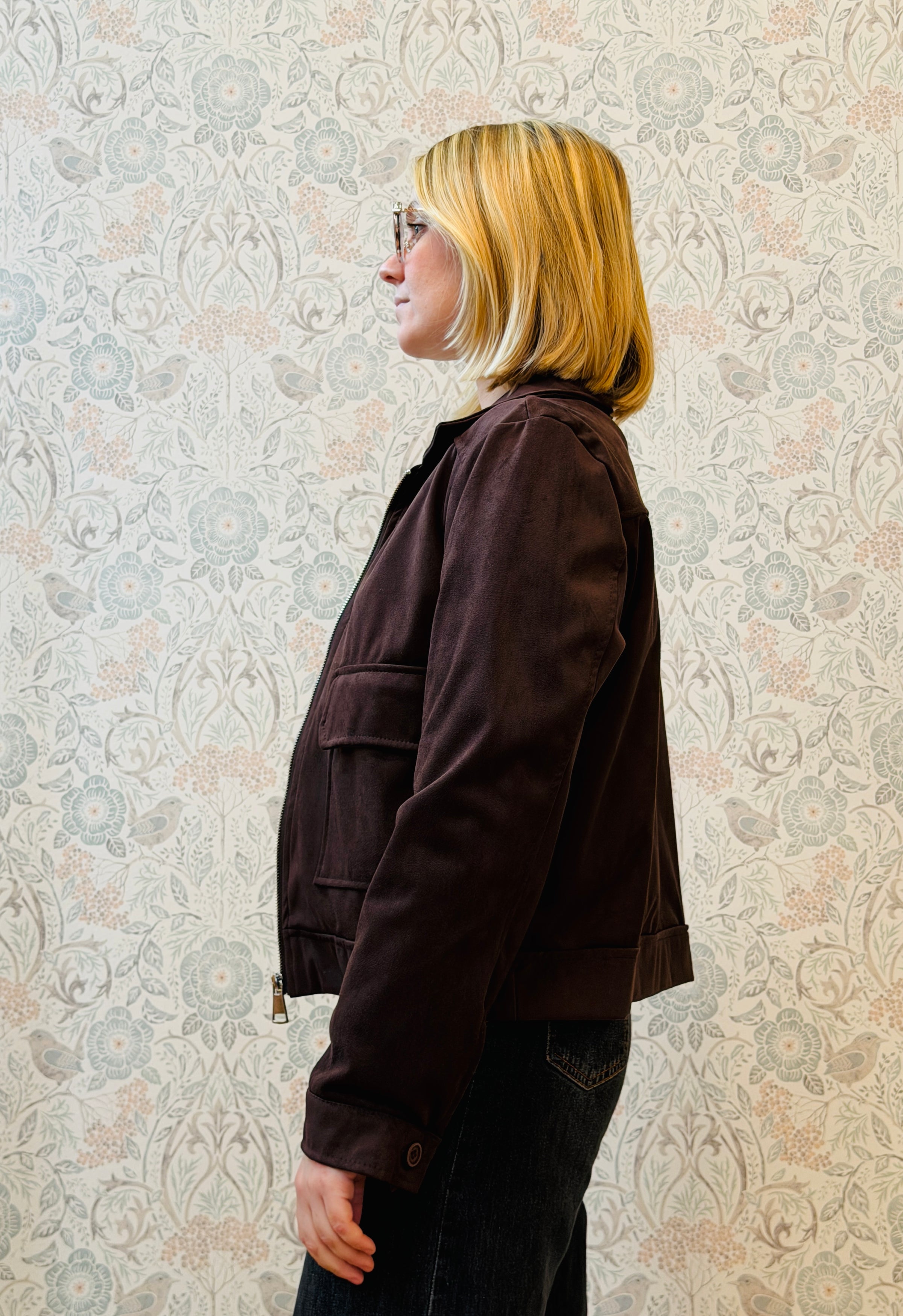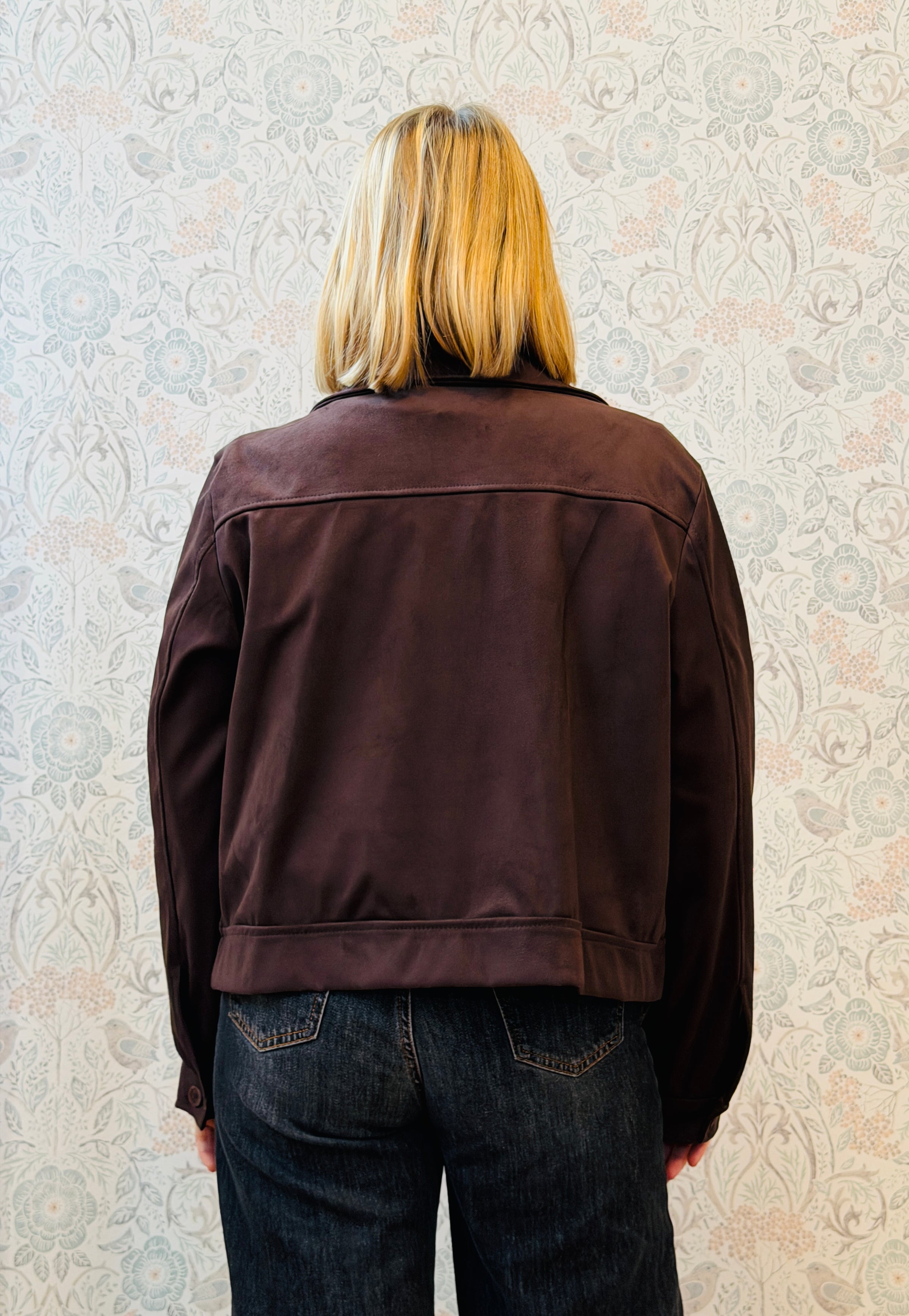 Giacca effetto camoscio con zip e colletto, con tasche aperte sul davanti.