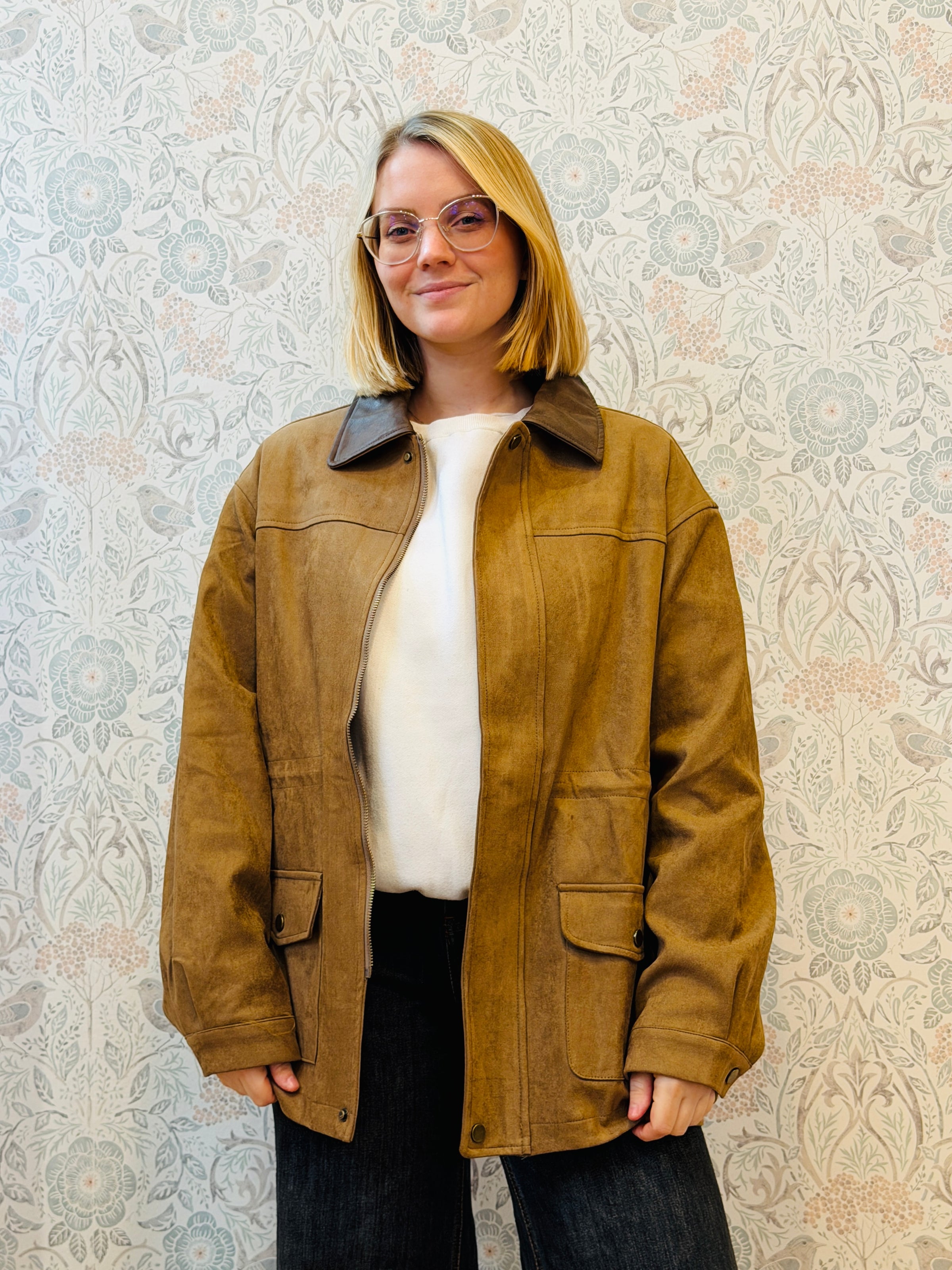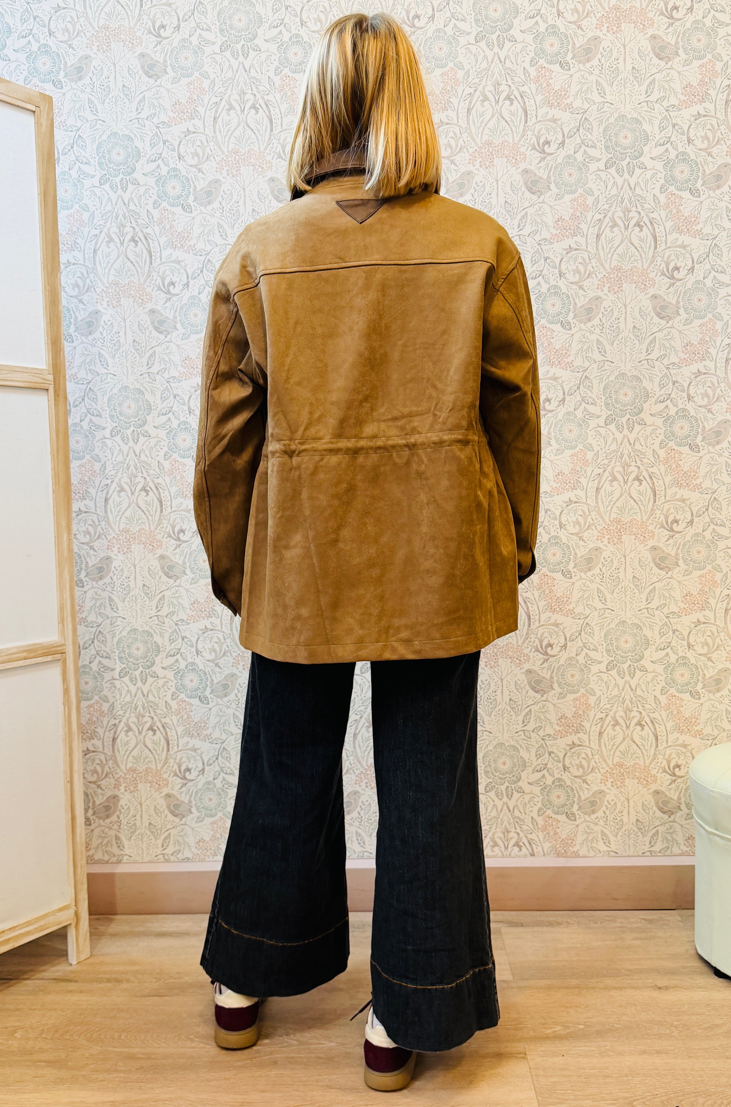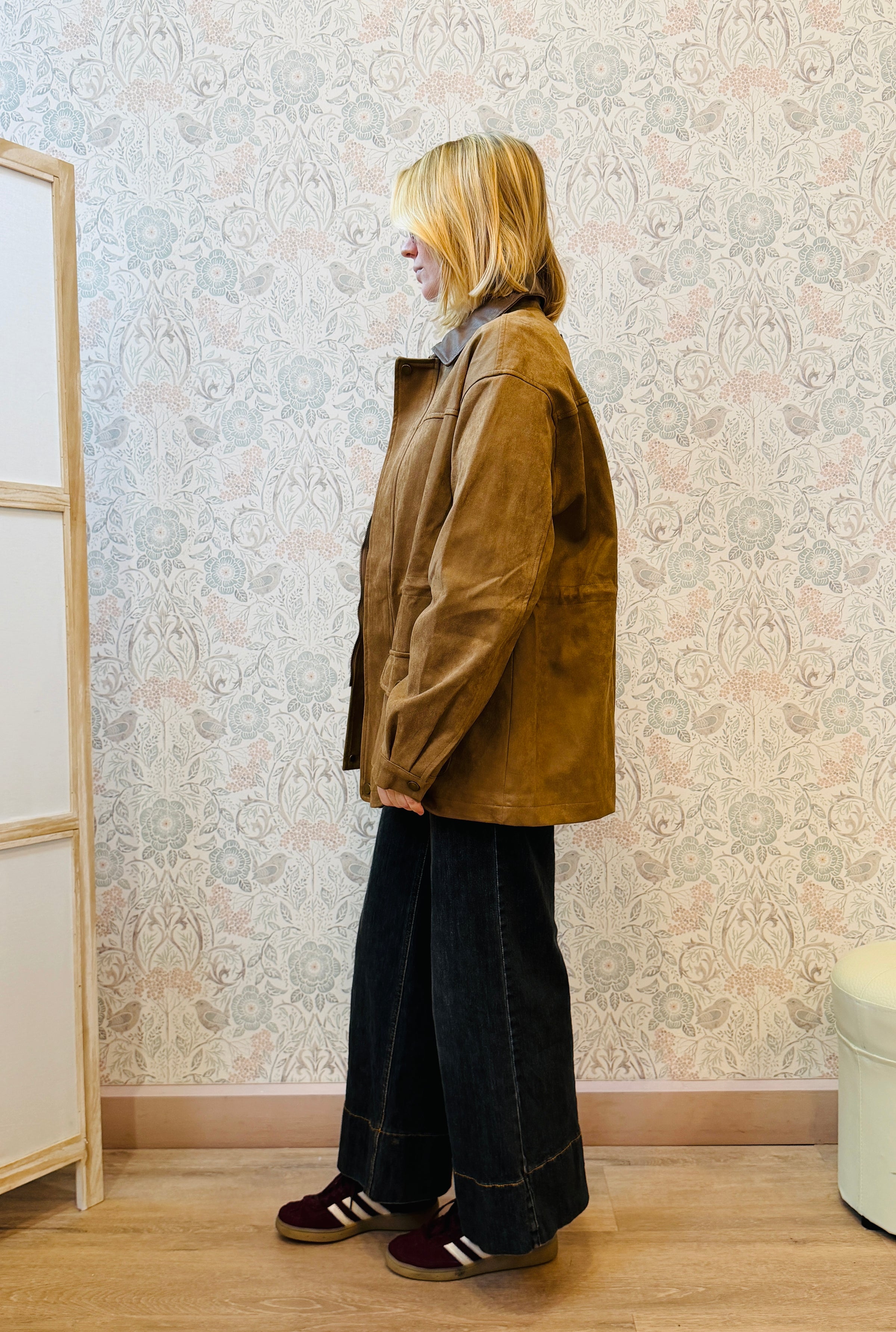 Giacca scamosciata con colletto, chiusura con zip coperta e tasche laterali a vita,aperte con chiusura con bottone.