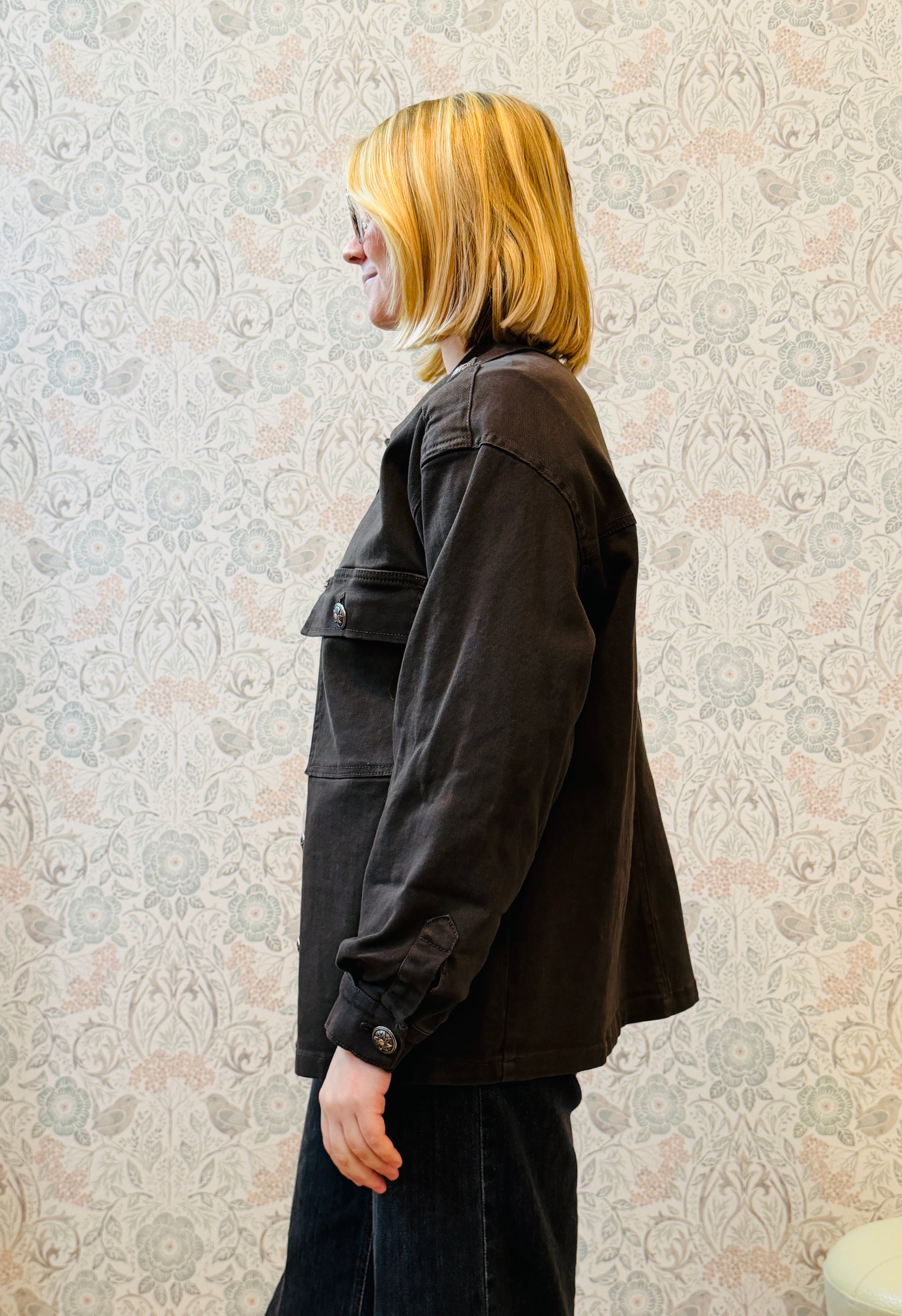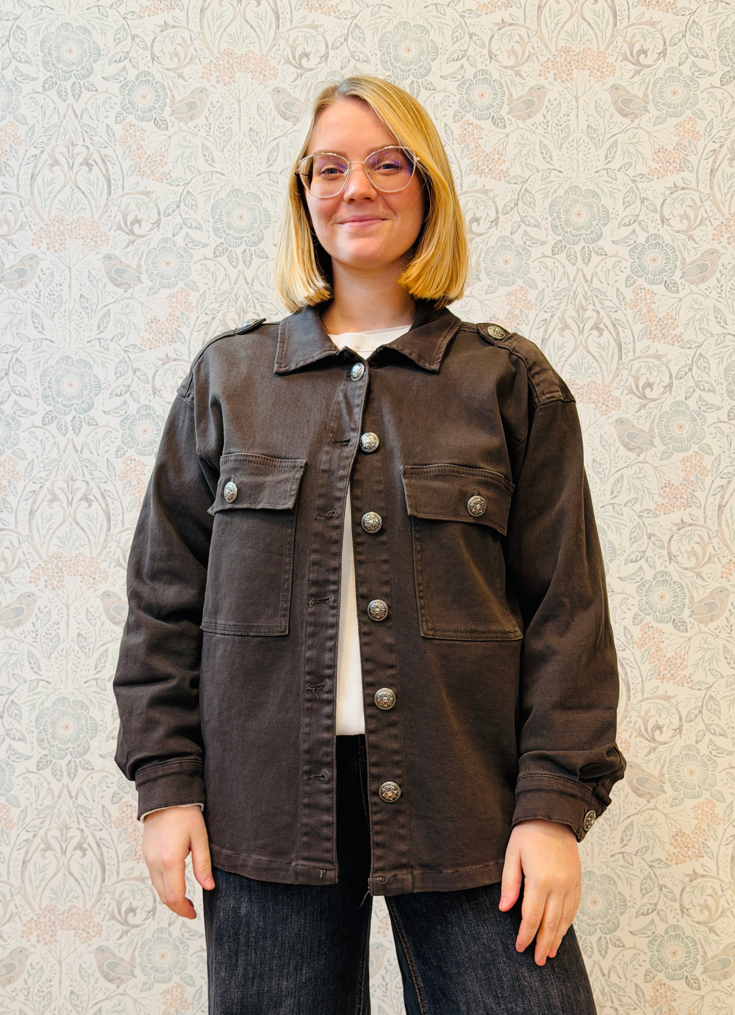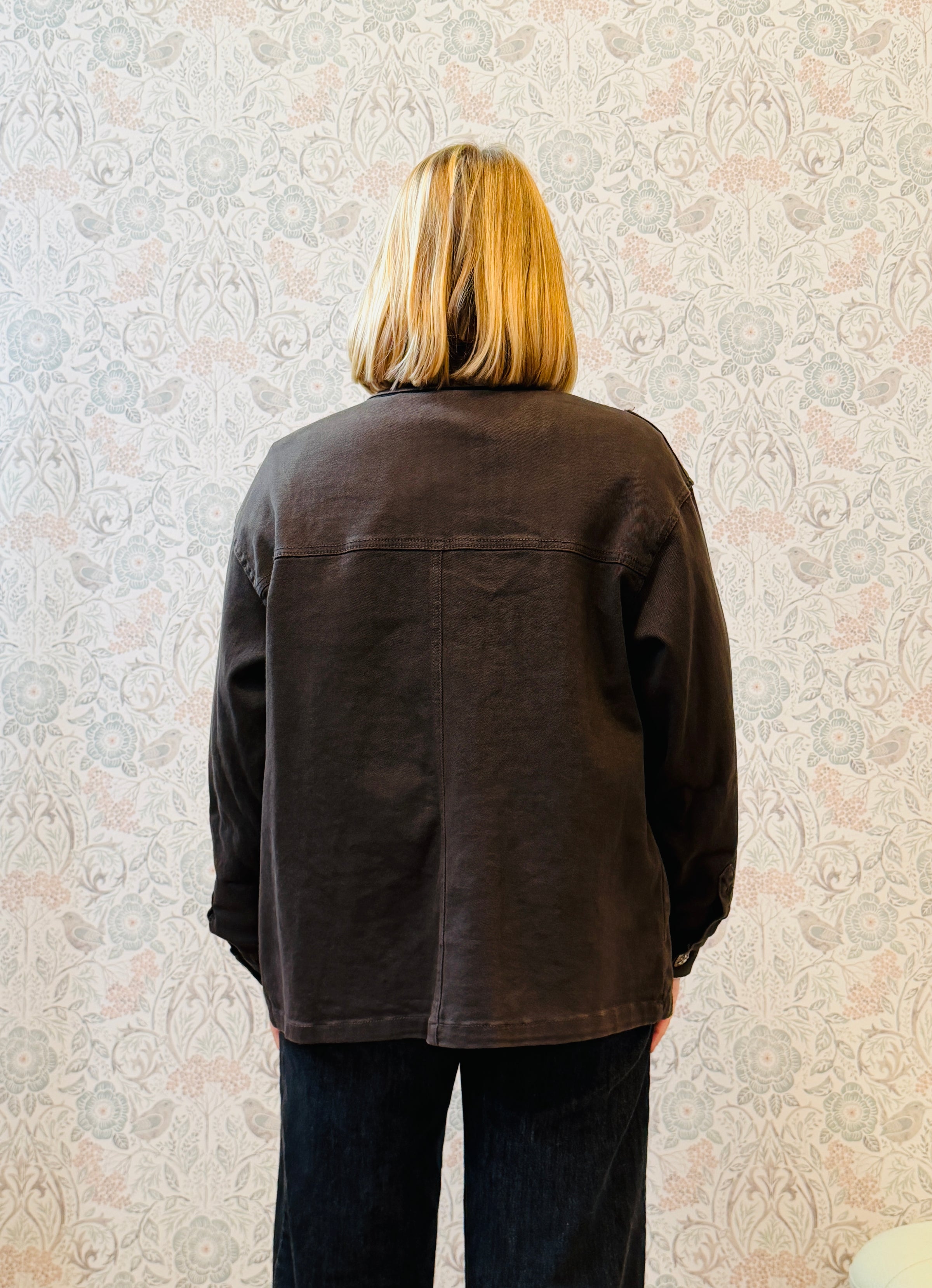 Giacca taglio regolare, colletto e tasche sul davanti. Vestibilità morbida.