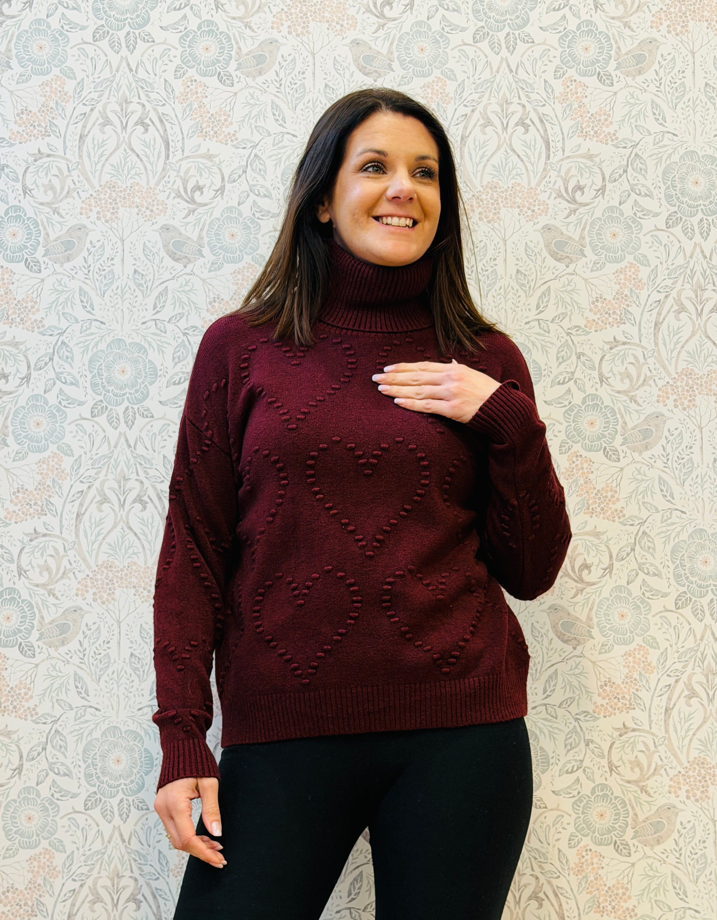 Maglione con collo alto doppio dal taglio dritto e dalla vestibilta' morbida. Dettagli con cuoricini in rilievo.