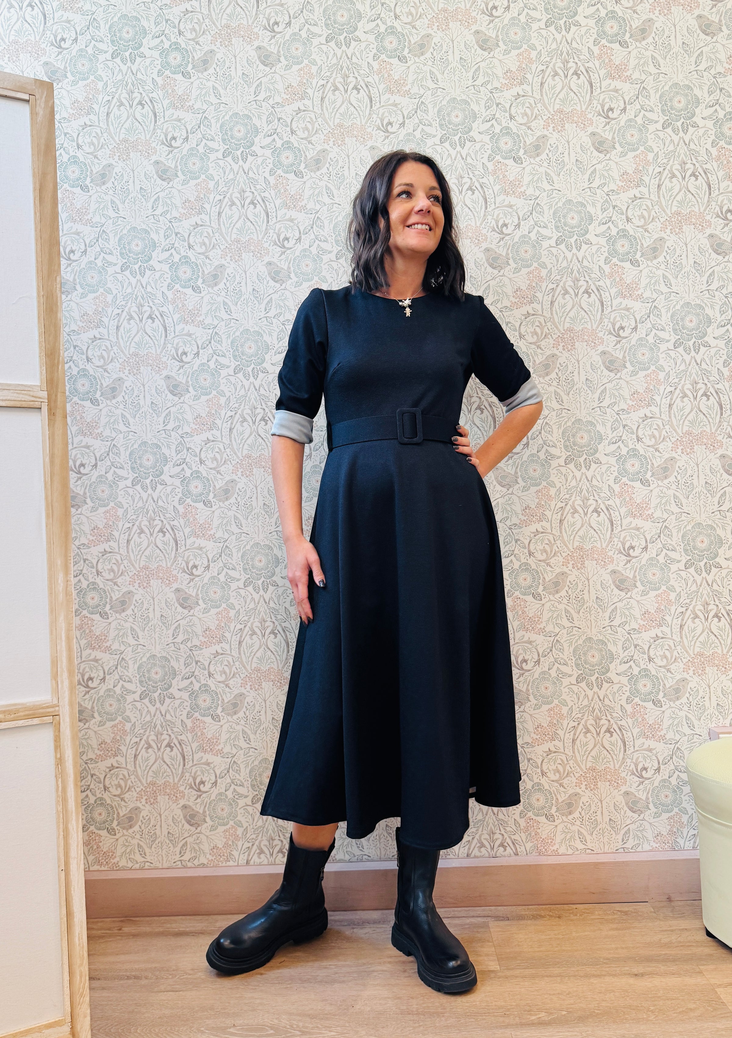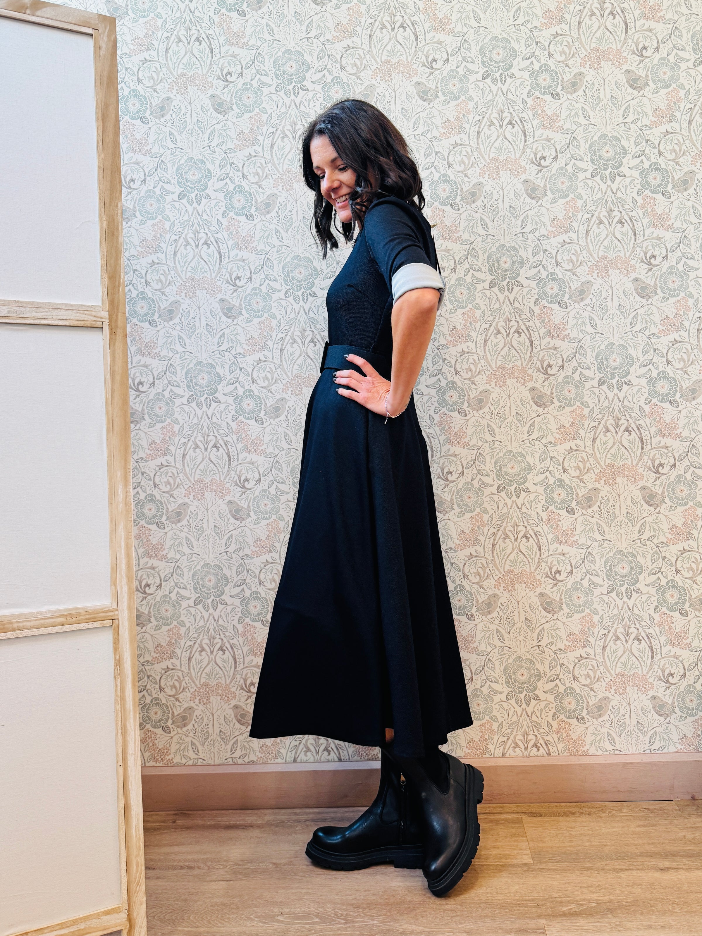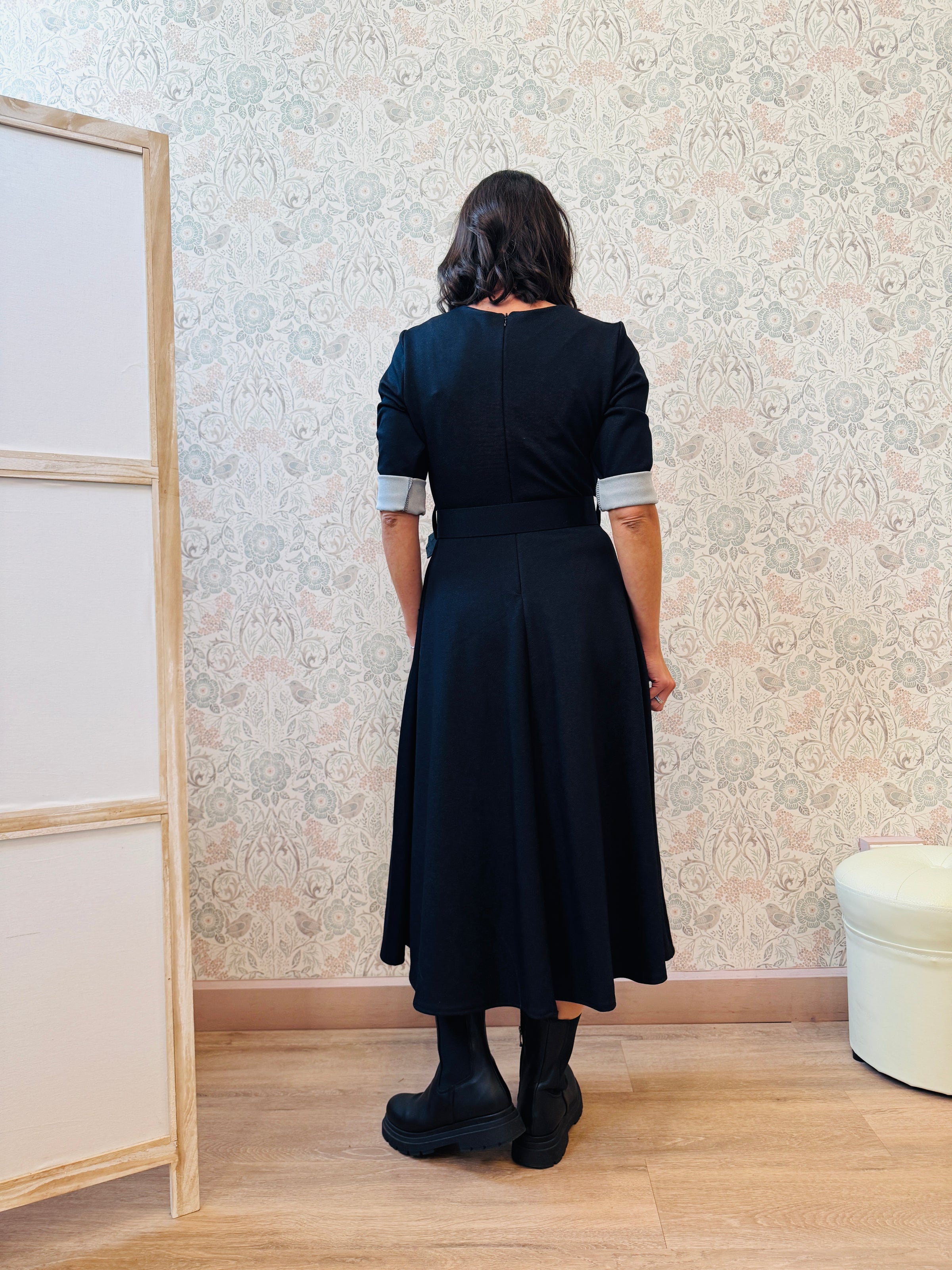 Abito lungo blu notte effetto denim con scollo tondo, chiusura con zip sul retro, cintura removibile in vita e maniche a tre quarti.