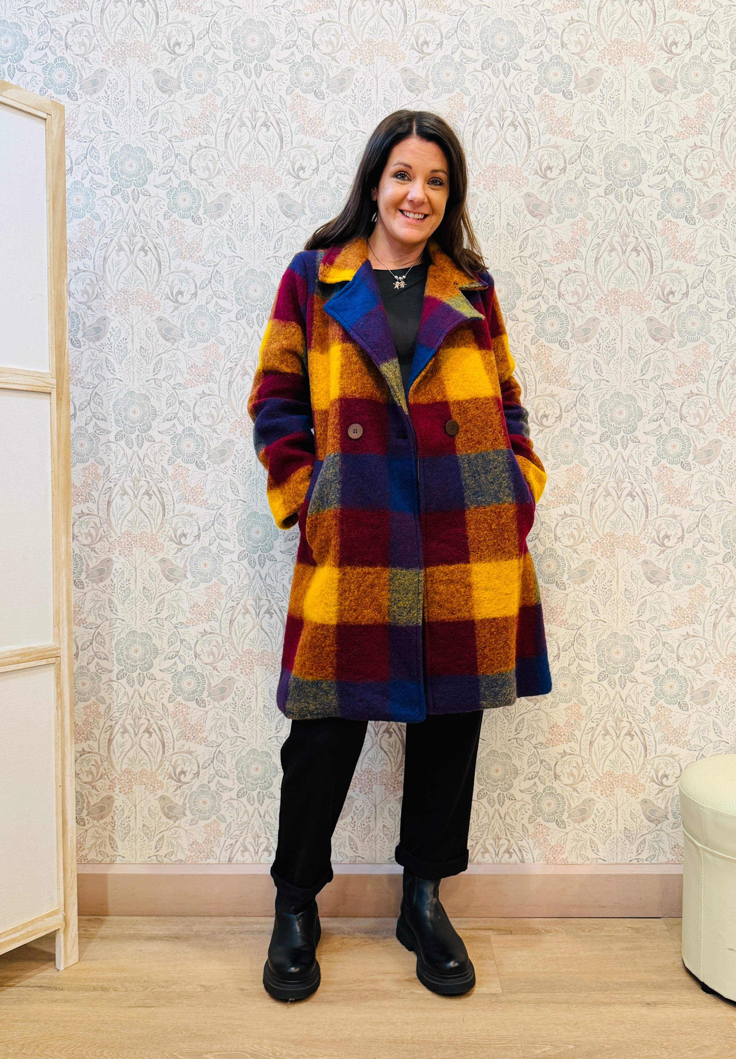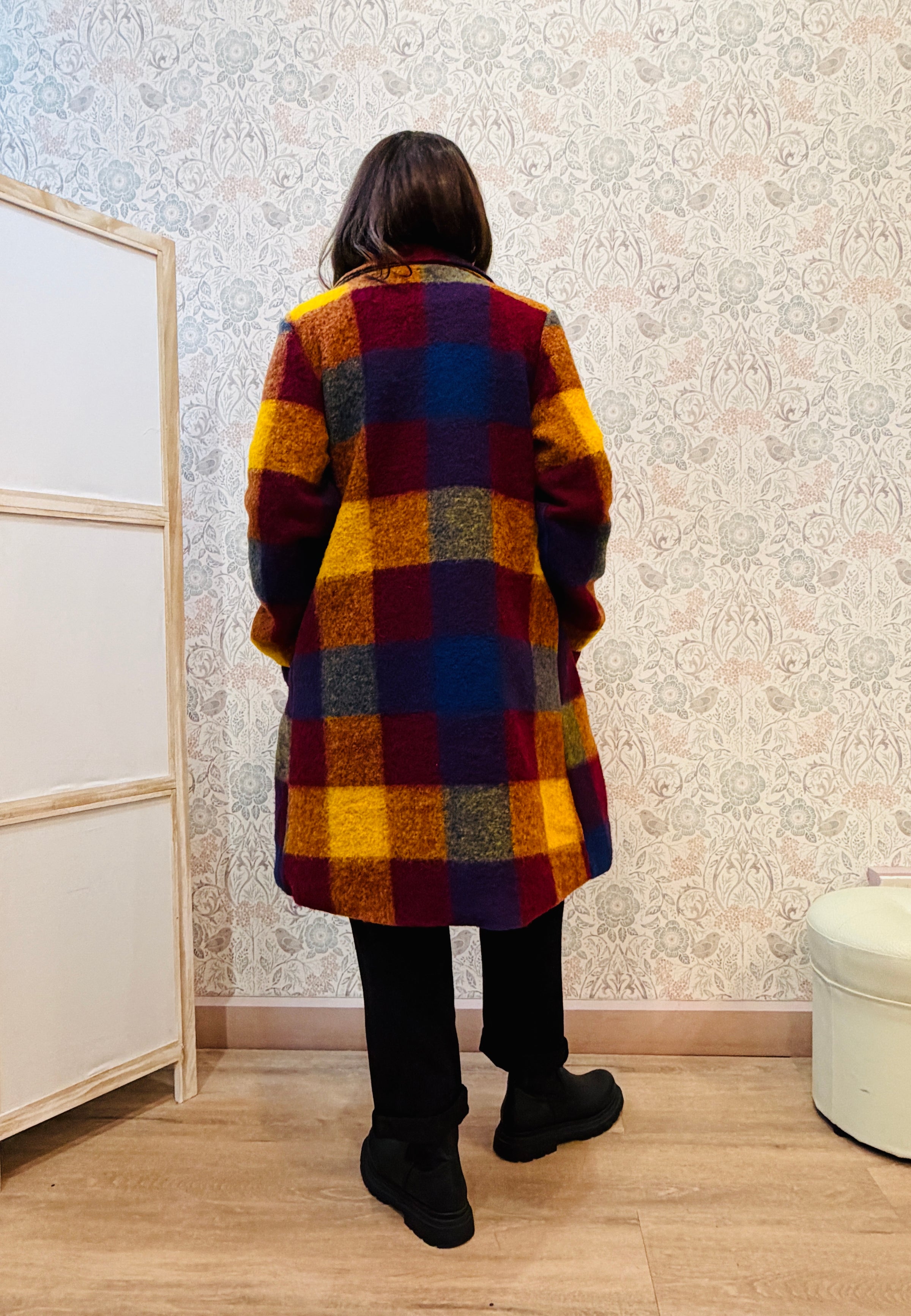 Cappotto lungo fino al ginocchio con fantesia a quadroni. <con bottone frontale per la chiusura.