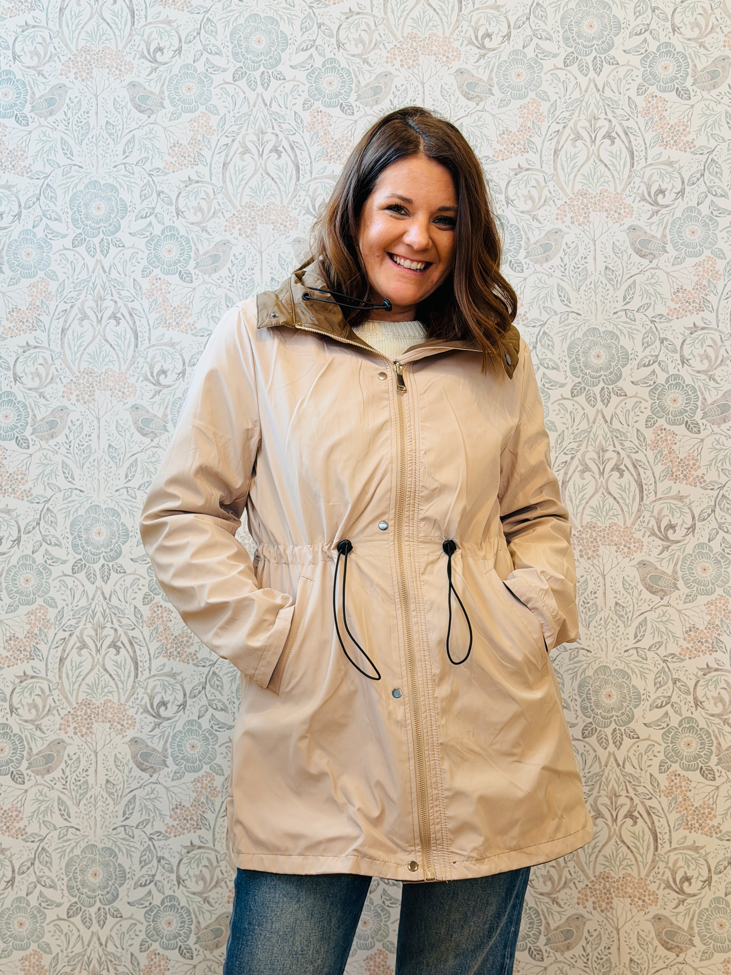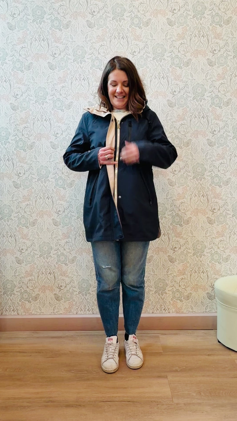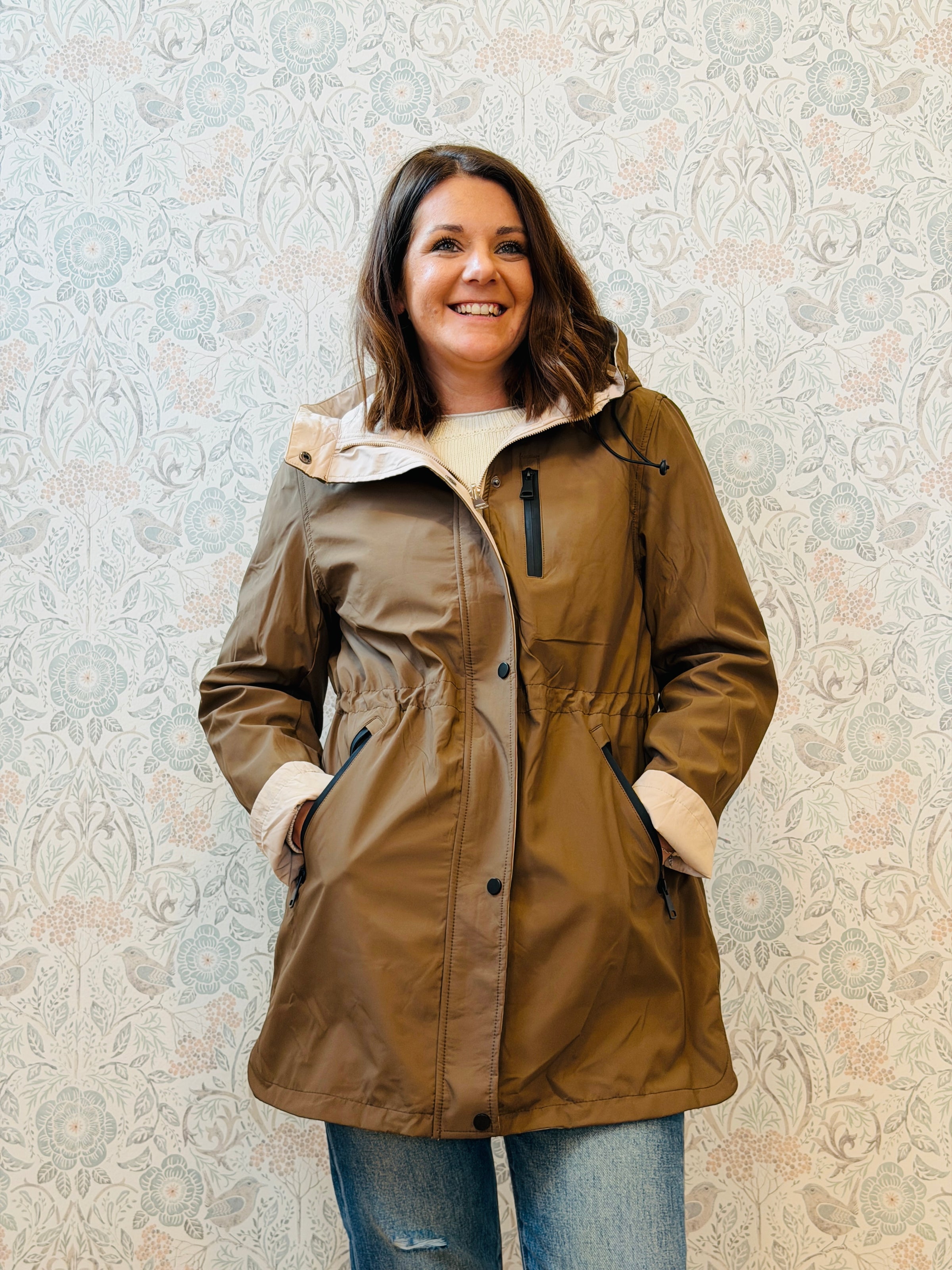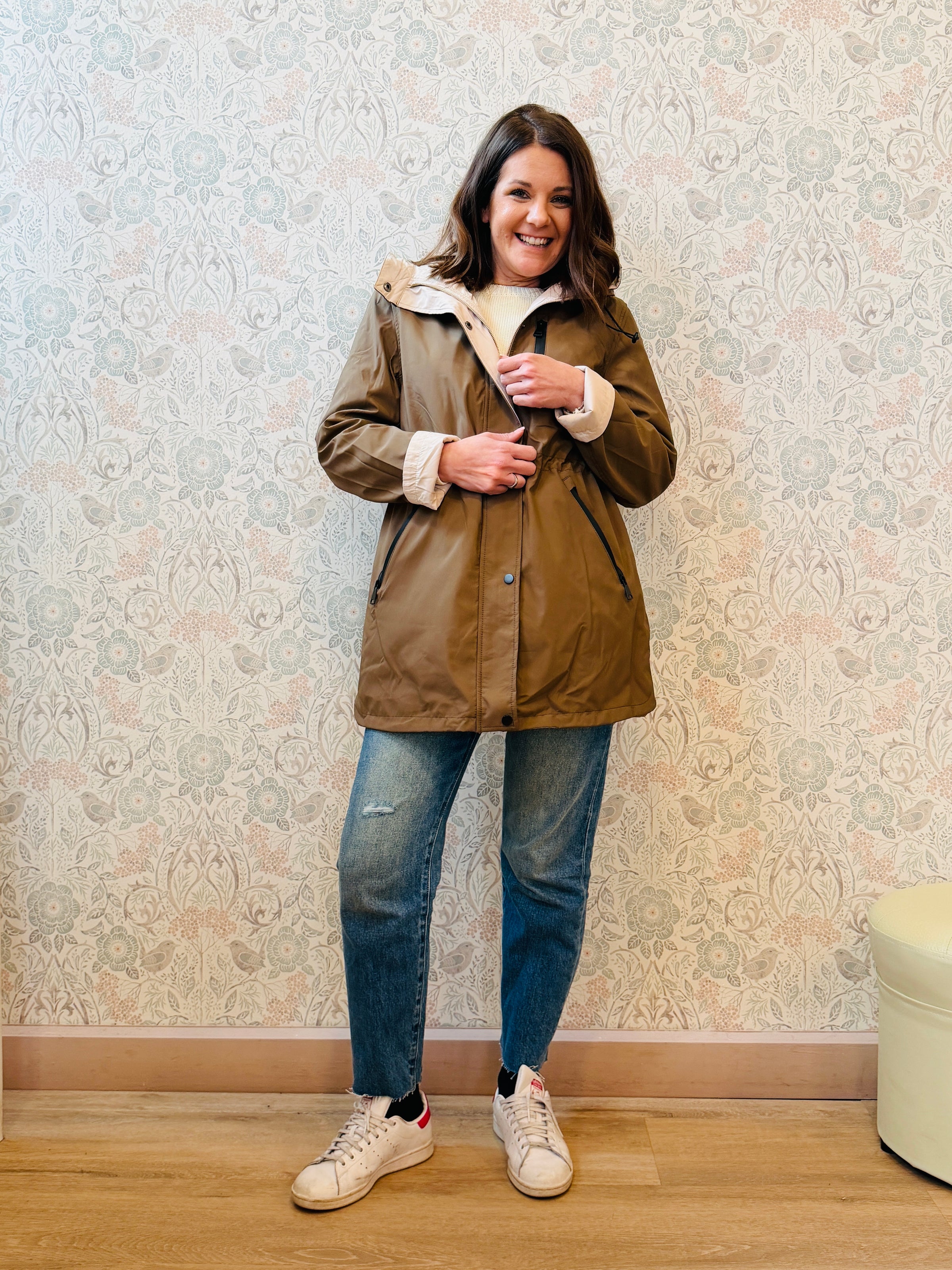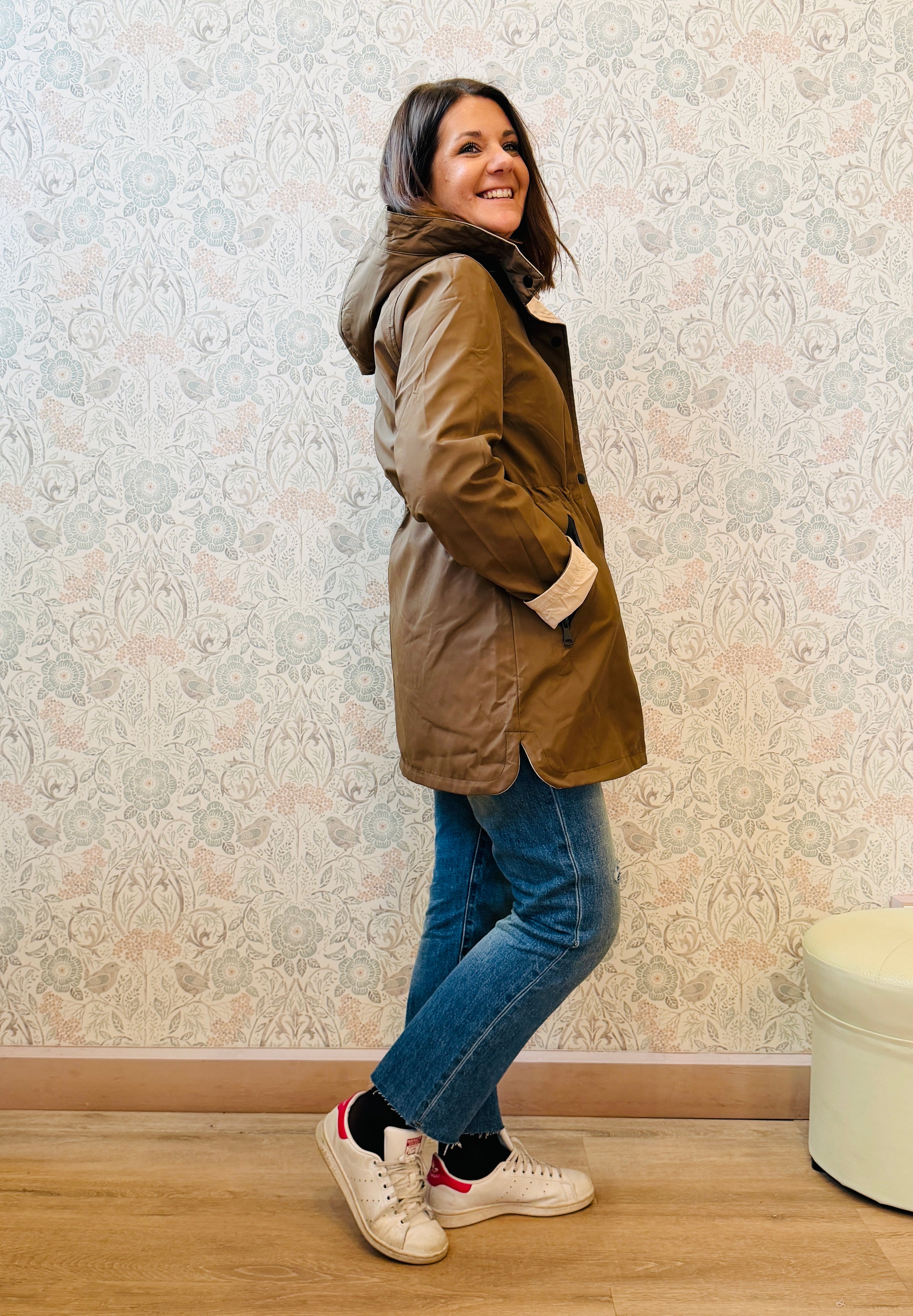 Giacca 100% grammi con cappuccio, chiusura a zip e bottoni a clip e tasche laterali con zip. Double face (lato tabacco e beige burro). Vestibilita' morbida e ampia.