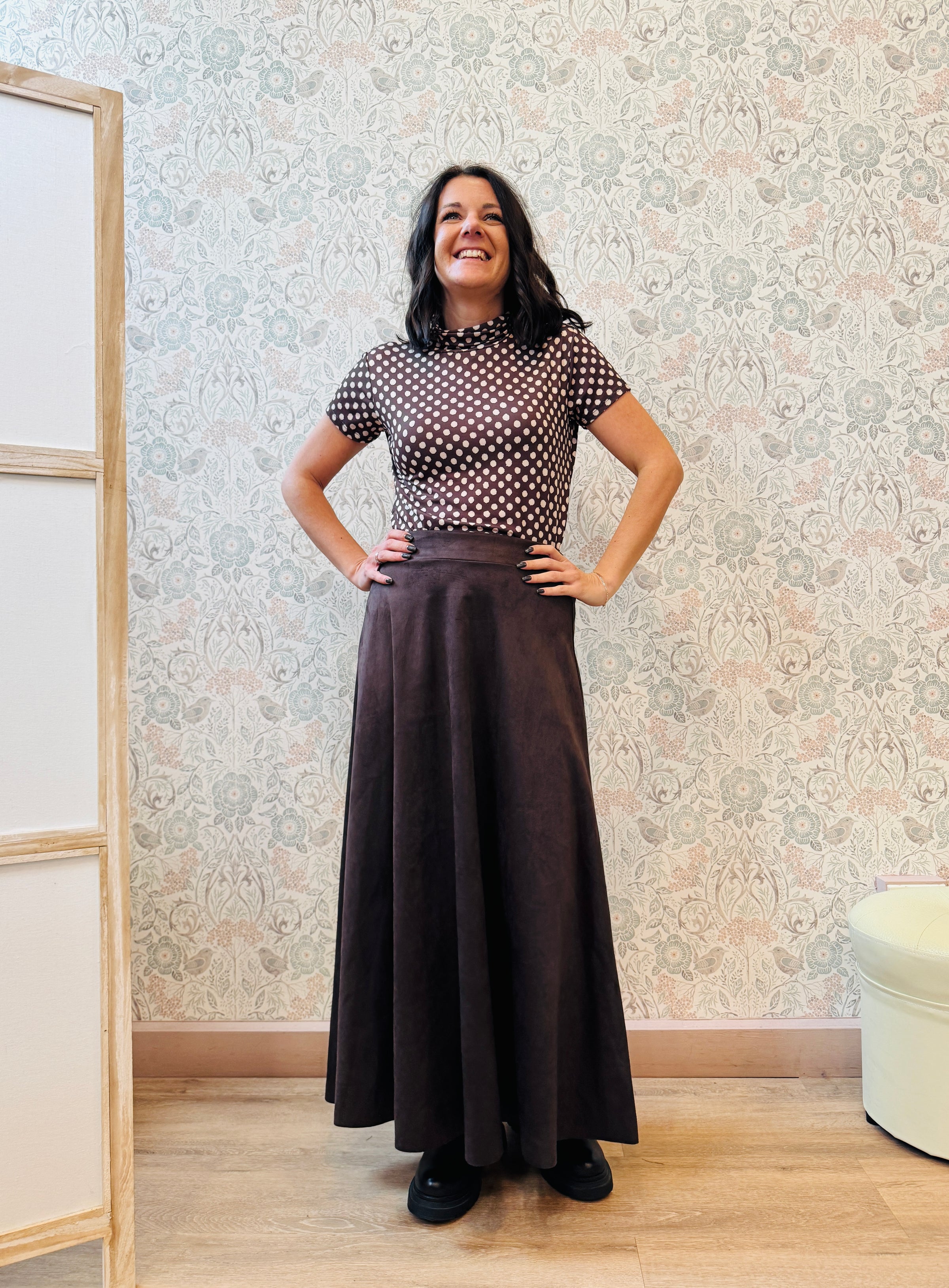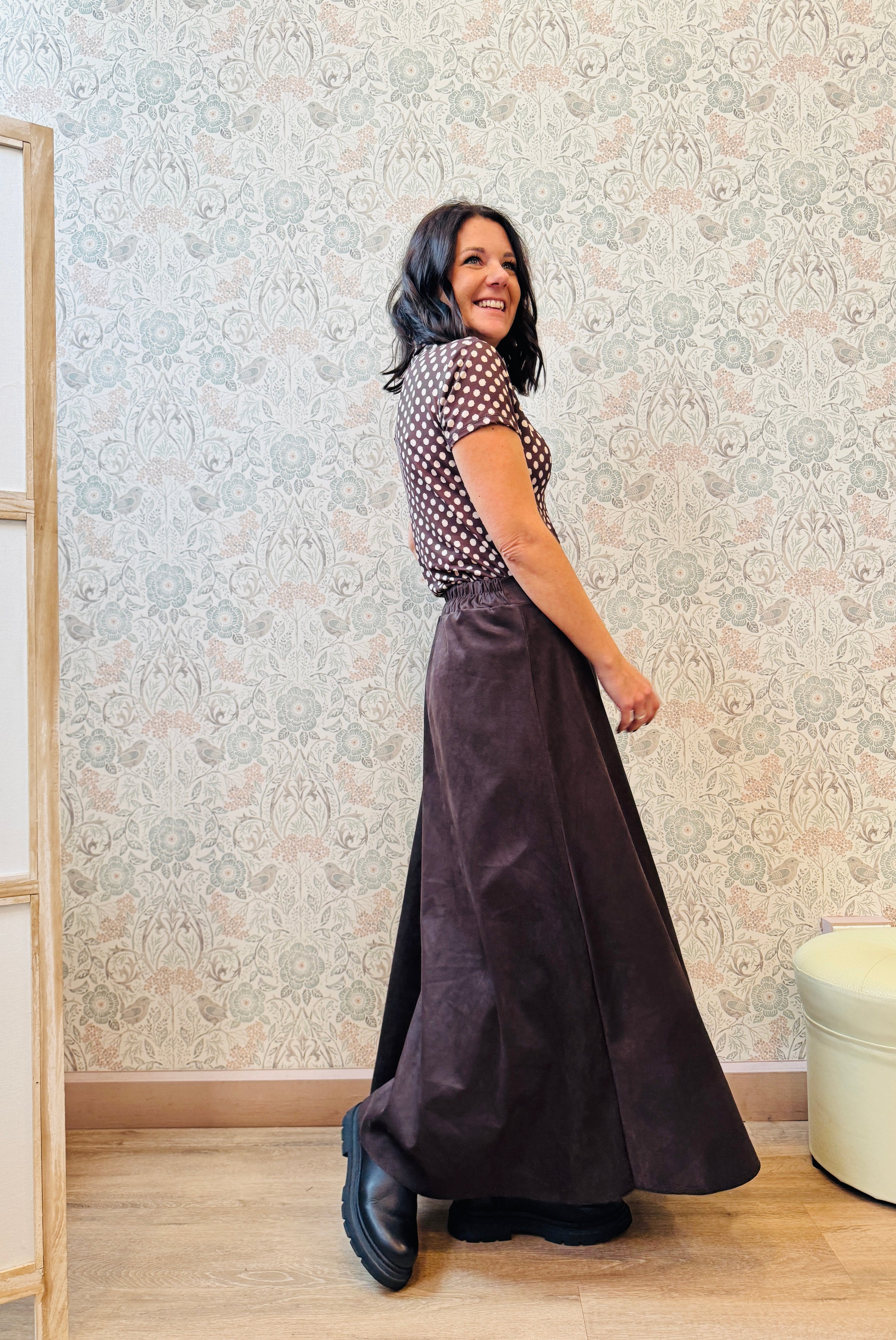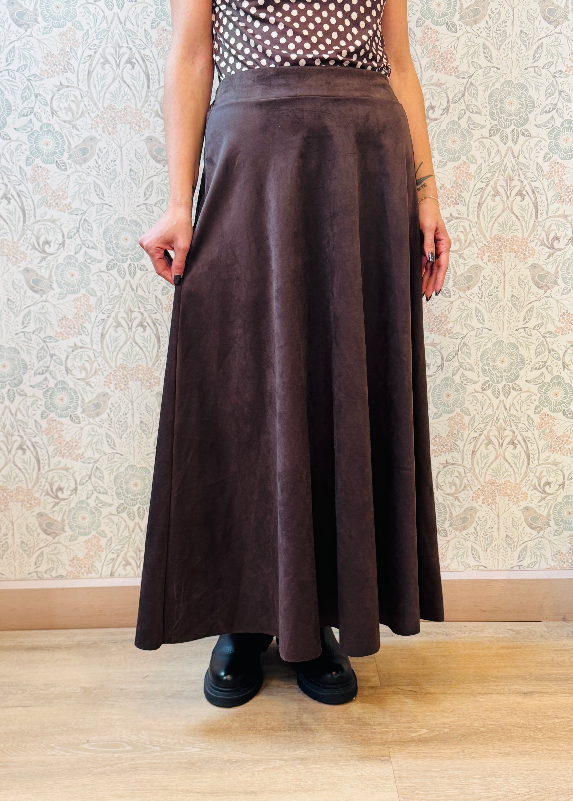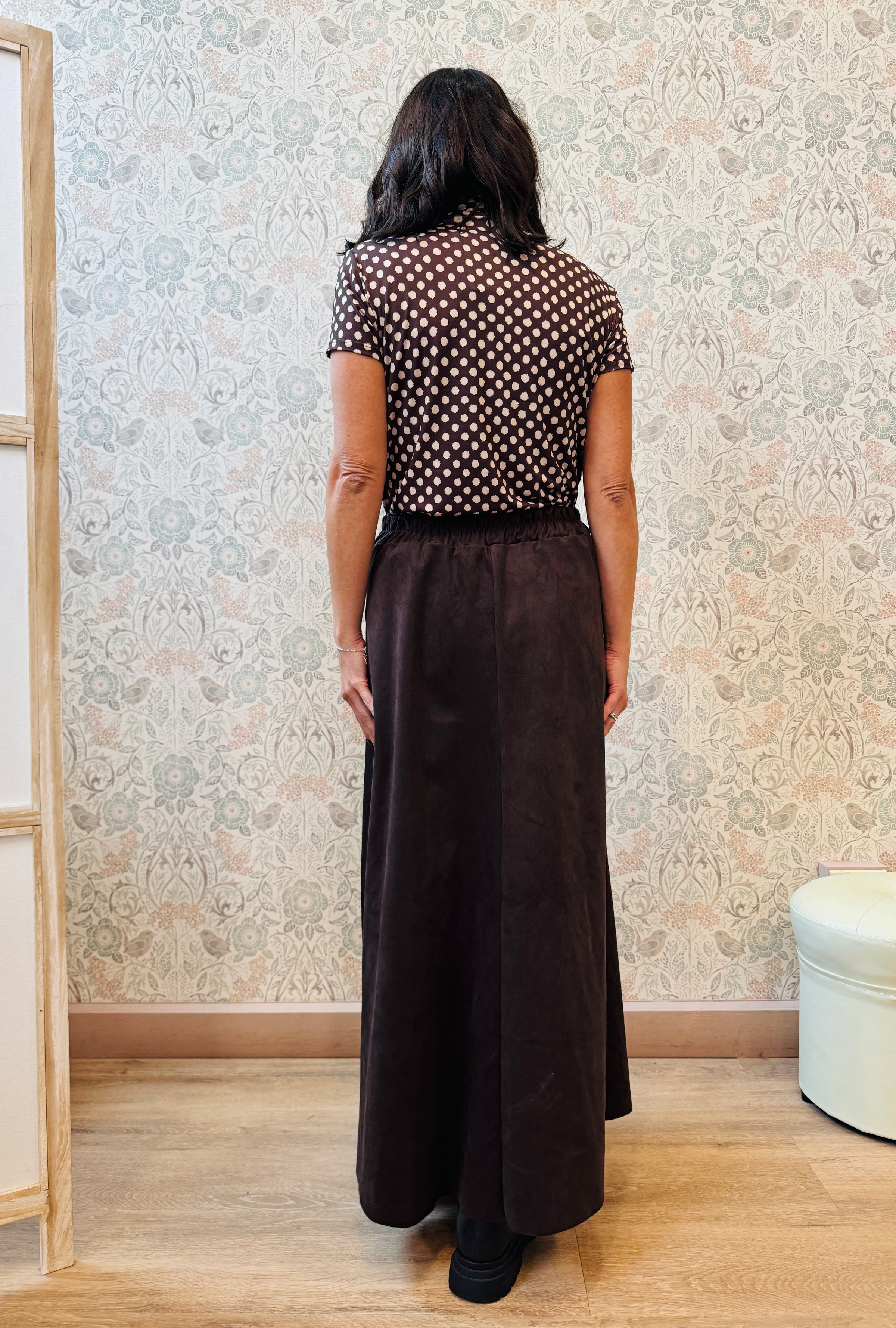 Gonna midi color cioccolato con elastico in vita sul retro.