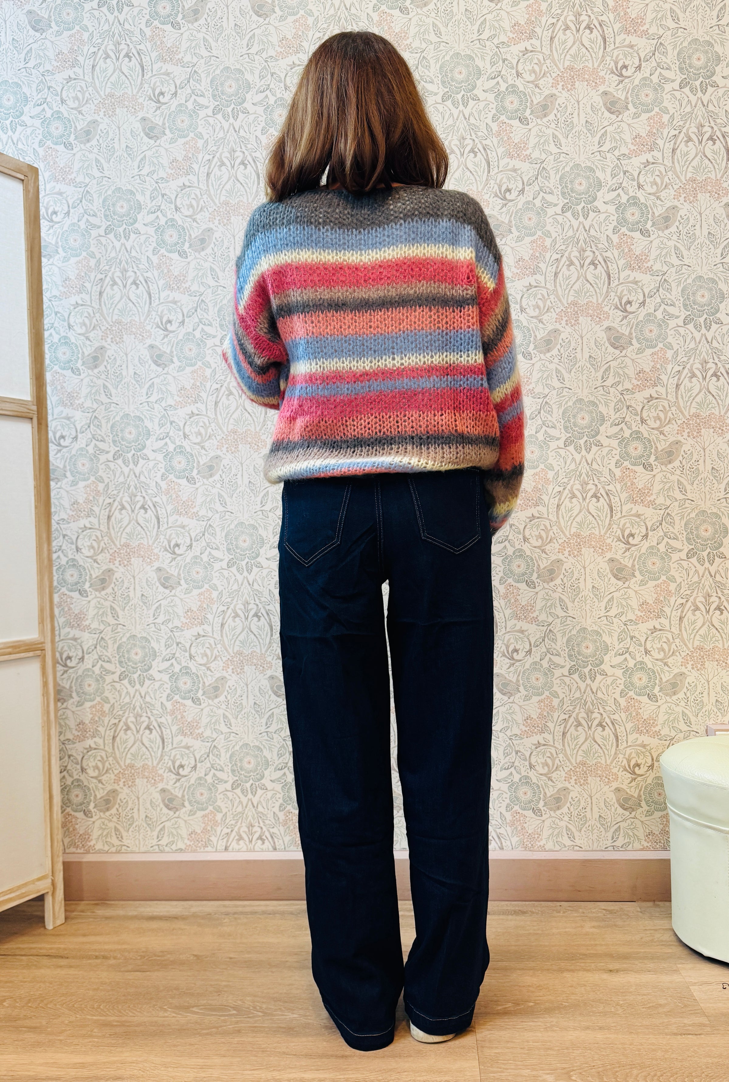 Jeans color denim scuro con elastico in vita e coulissè regolabile , tasche laterali visibili e taglio a palazzo.